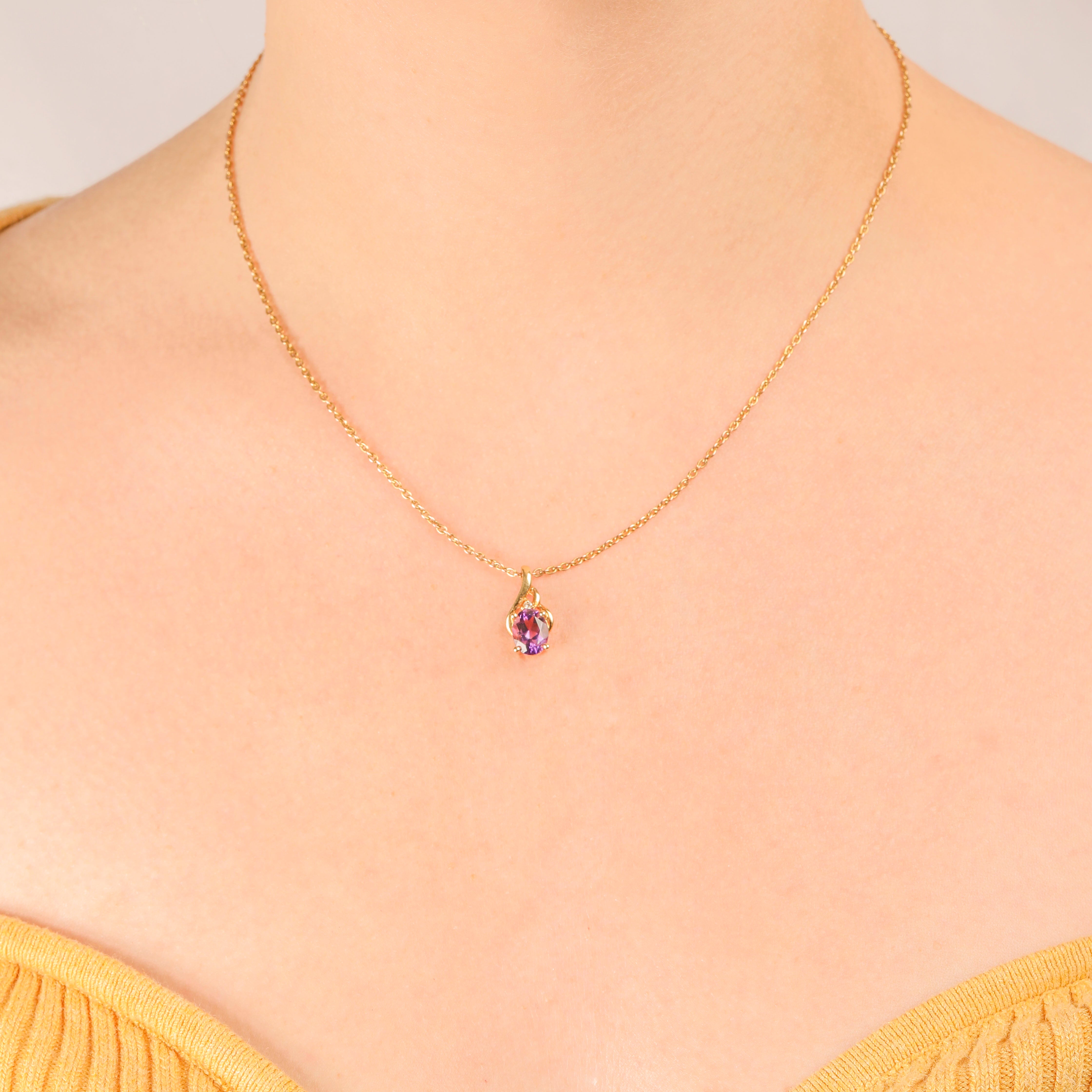 Beautifully crafted, the deep violet Amethyst sits securely within her saturated warm 18ct yellow Gold claw settings, with her dainty Diamond adding a subtle sparkling accent. This Vintage charm exudes feminine class and would make the perfect everyday piece for your collection!