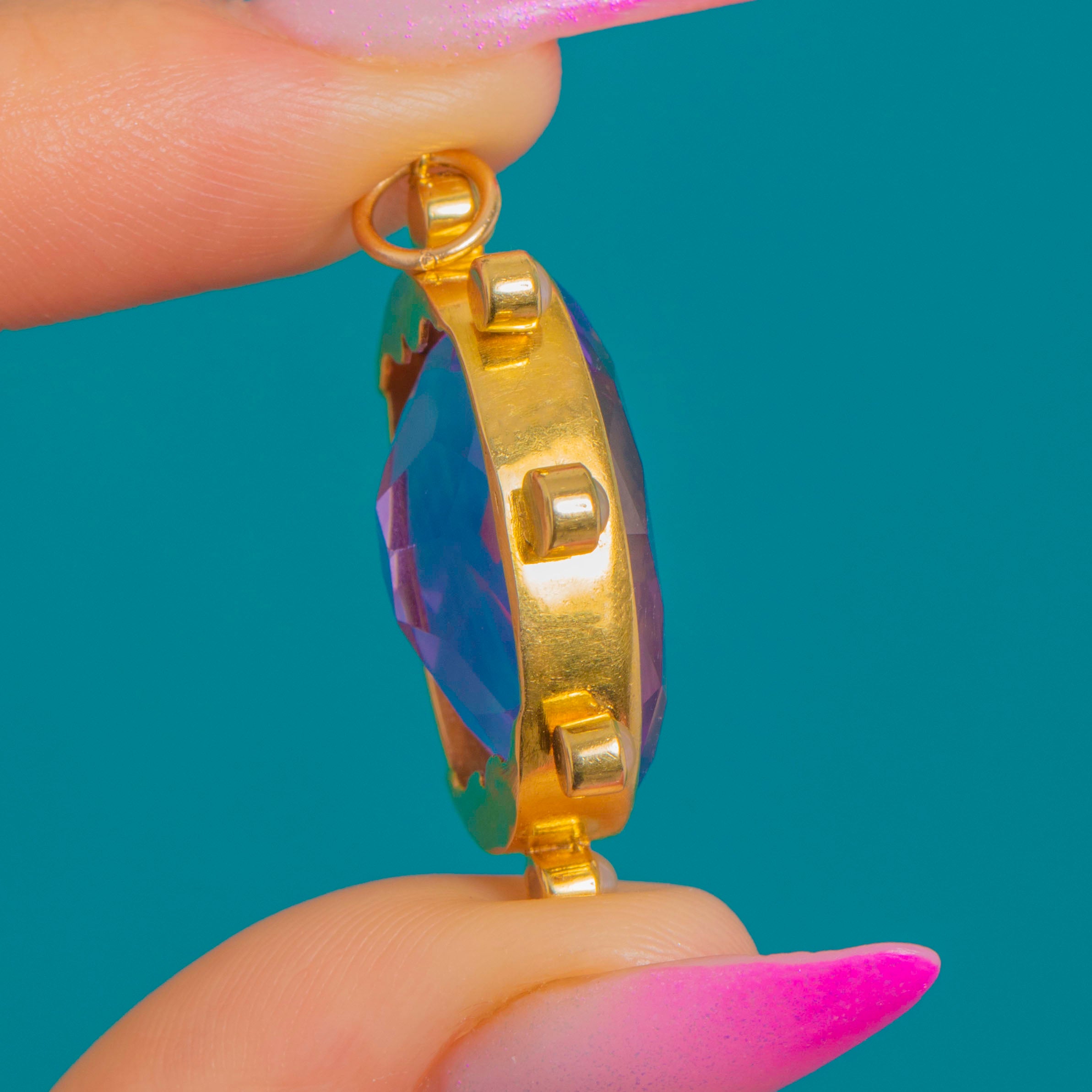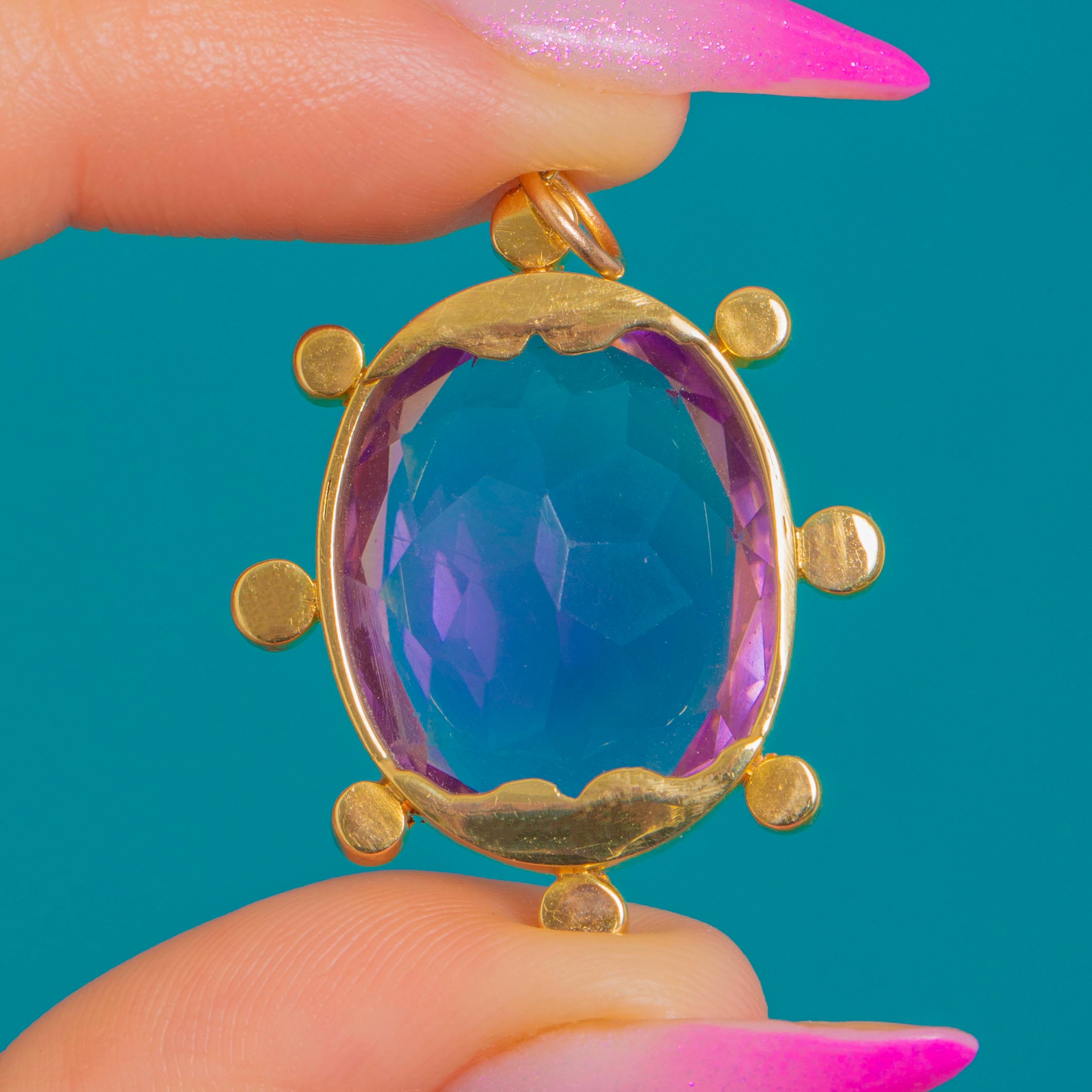 Glowing with regal colour and classic Victorian charm, this 18ct Gold pendant showcases a sumptuous oval Amethyst framed by a halo of creamy Seed Pearls in a refined starburst design. The Amethyst’s rich purple hue is beautifully intensified by the warm glow of 18ct Gold, its faceted surface throwing lively flashes with every movement.