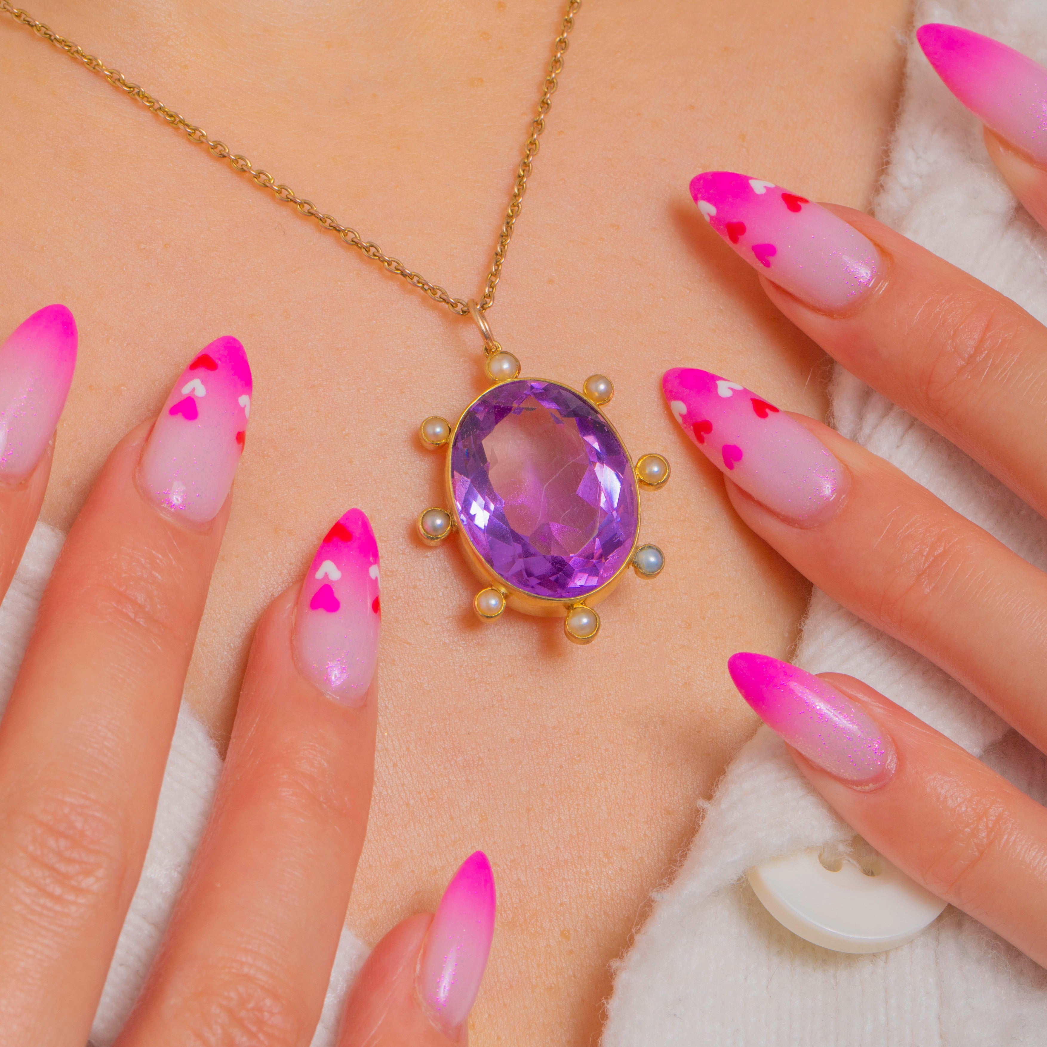 EXCELLENT: The Amethyst is bright and lively with crisp facets and natural internal inclusions visible under close inspection, with no chips visible. The Seed Pearls are intact with a pleasing lustre. The 18ct Gold setting and fixed bail are secure with only light surface wear consistent with age, and no visible repairs.