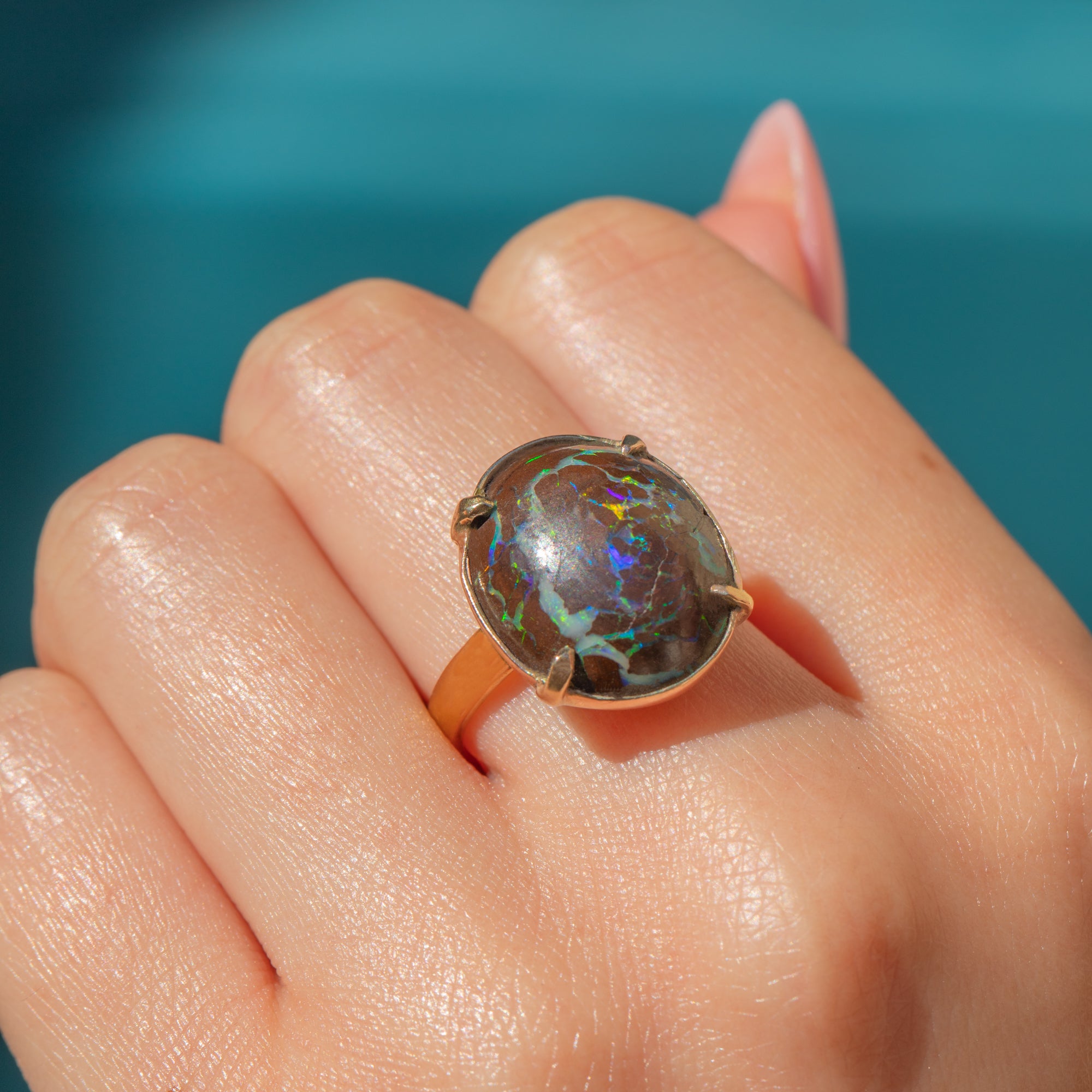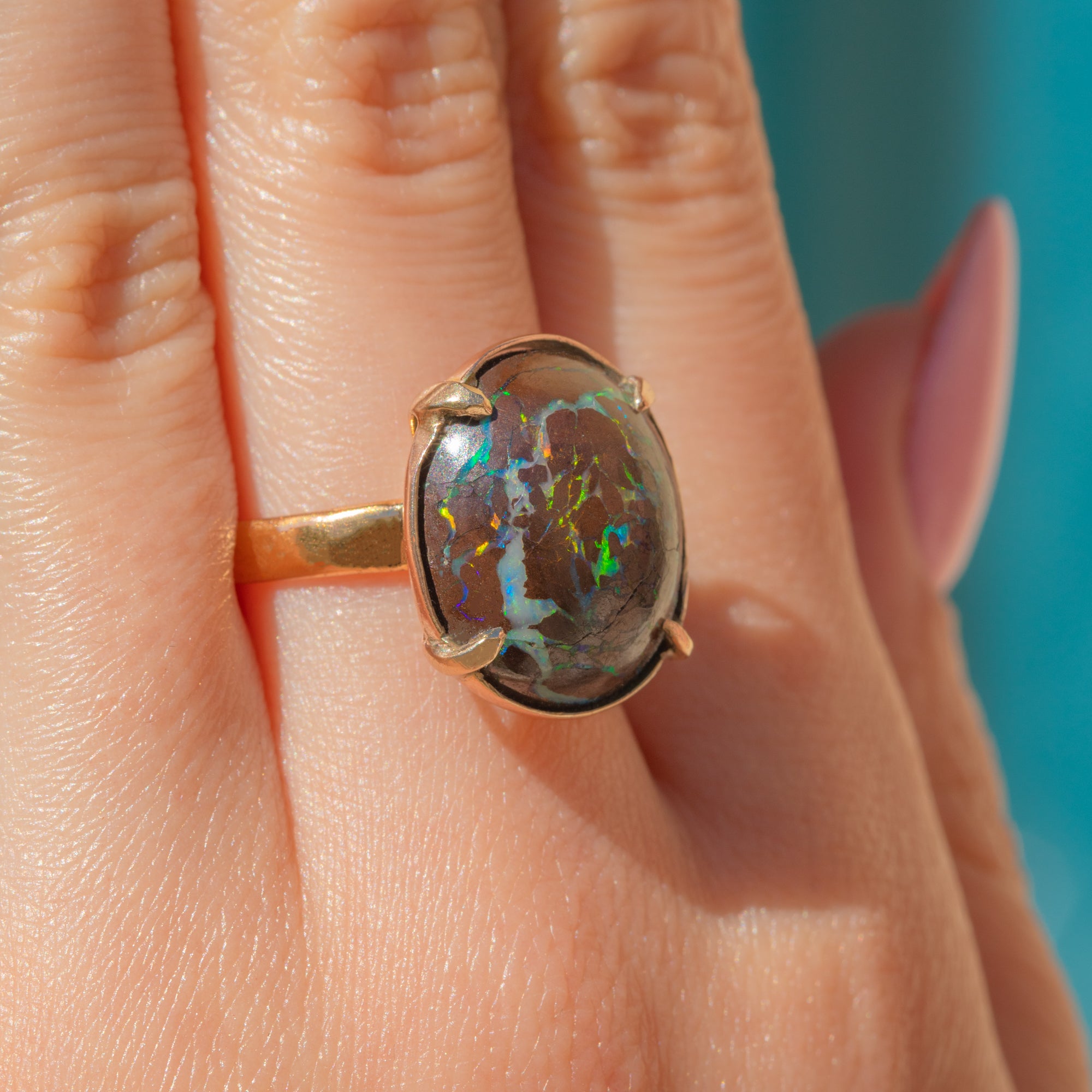 This 18ct Gold Boulder Opal dress ring is a beauty to behold! The smoothly cut Boulder Opal is mesmerising to look at, with sparkling electric blue, zingy greens, and pink hues peeking through her mahogany-toned surface.