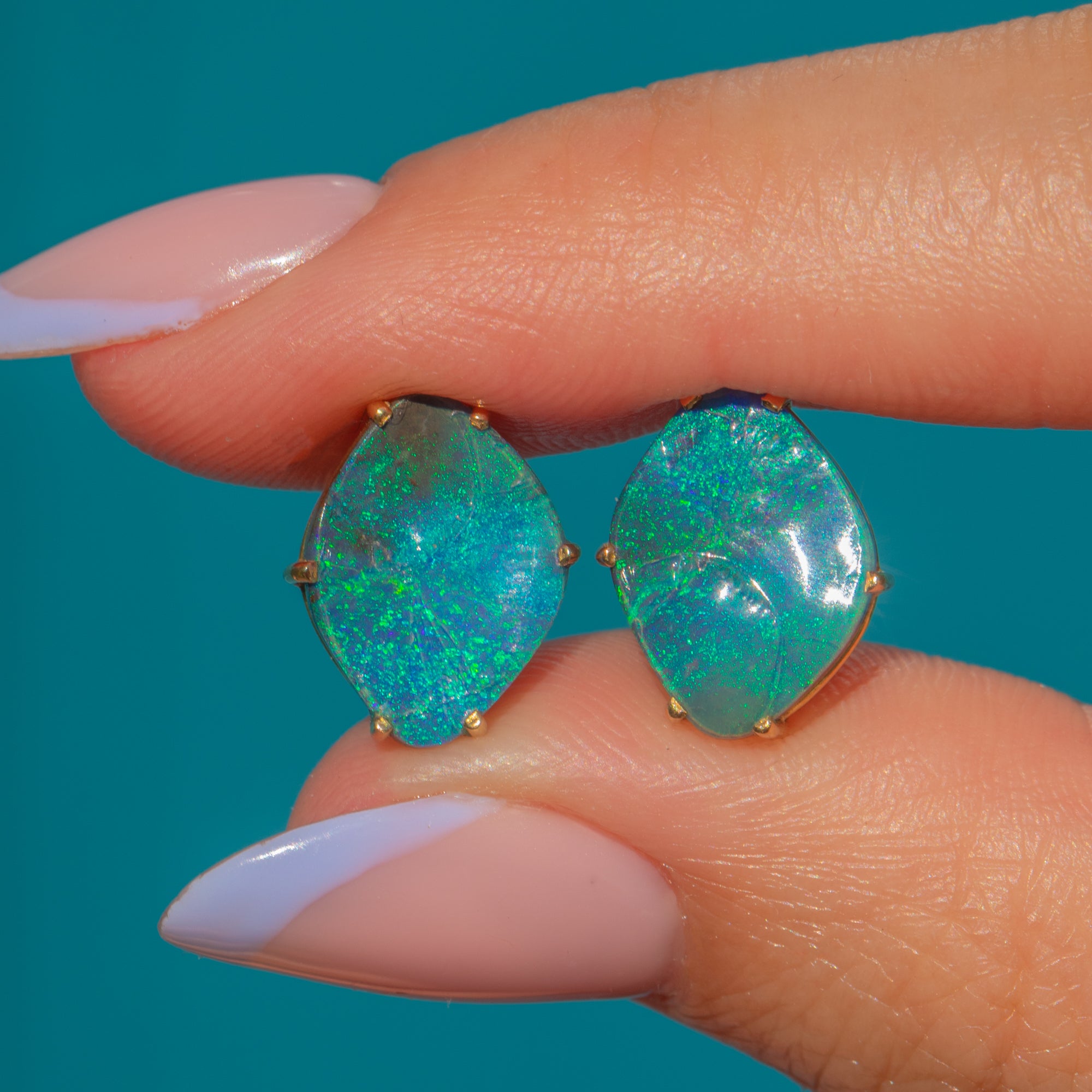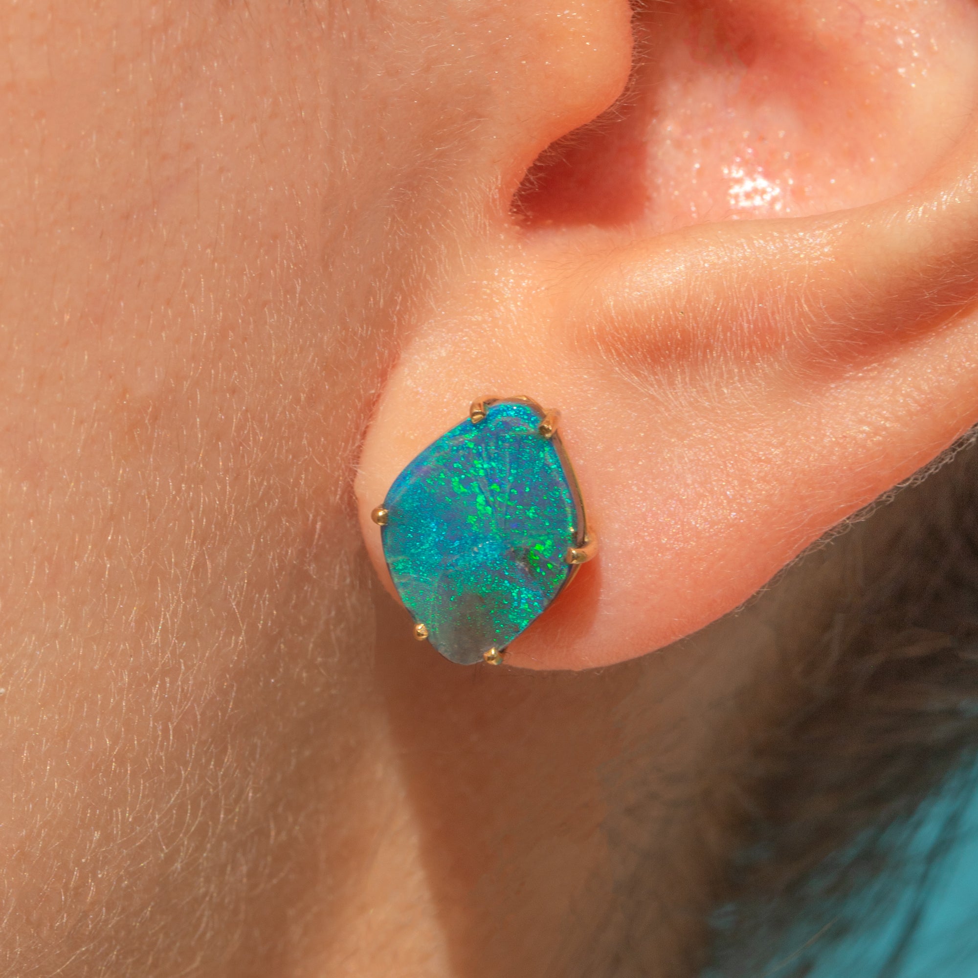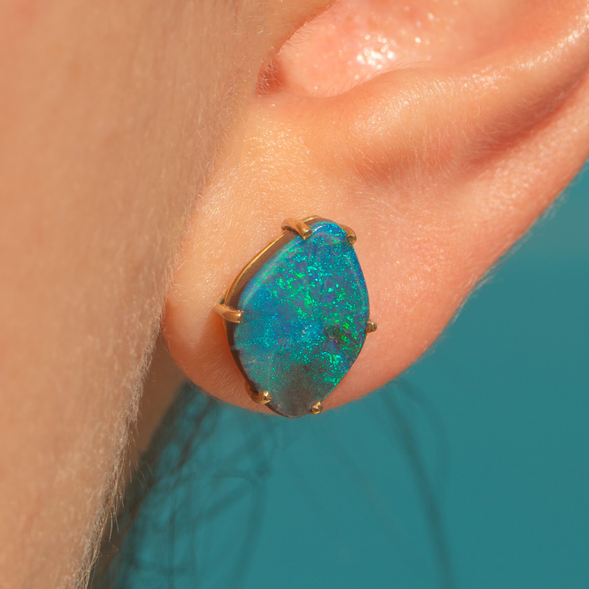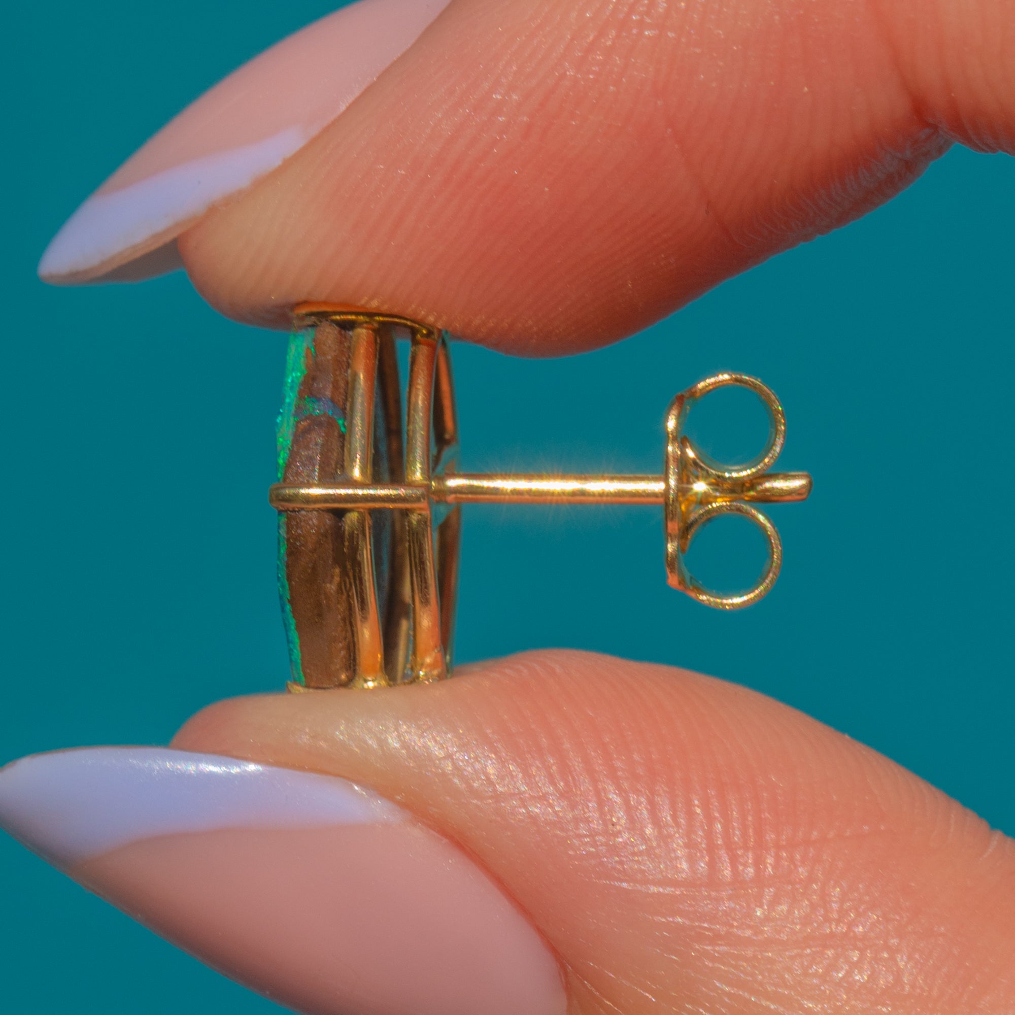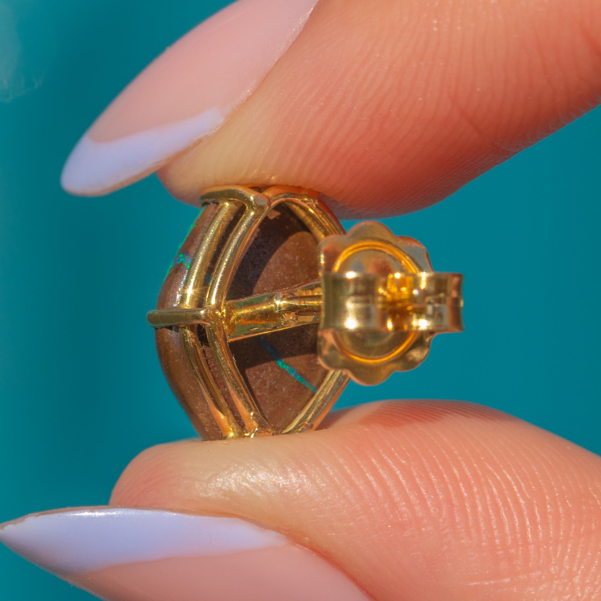 EXCELLENT: These 18ct Gold Boulder Opal stud earrings are in excellent condition. The Boulder Opals are securely held within their claw settings and are free from visible surface wear. The Gold is brightly saturated and the butterfly backs are snug-fitting, providing comfortable and secure wear!