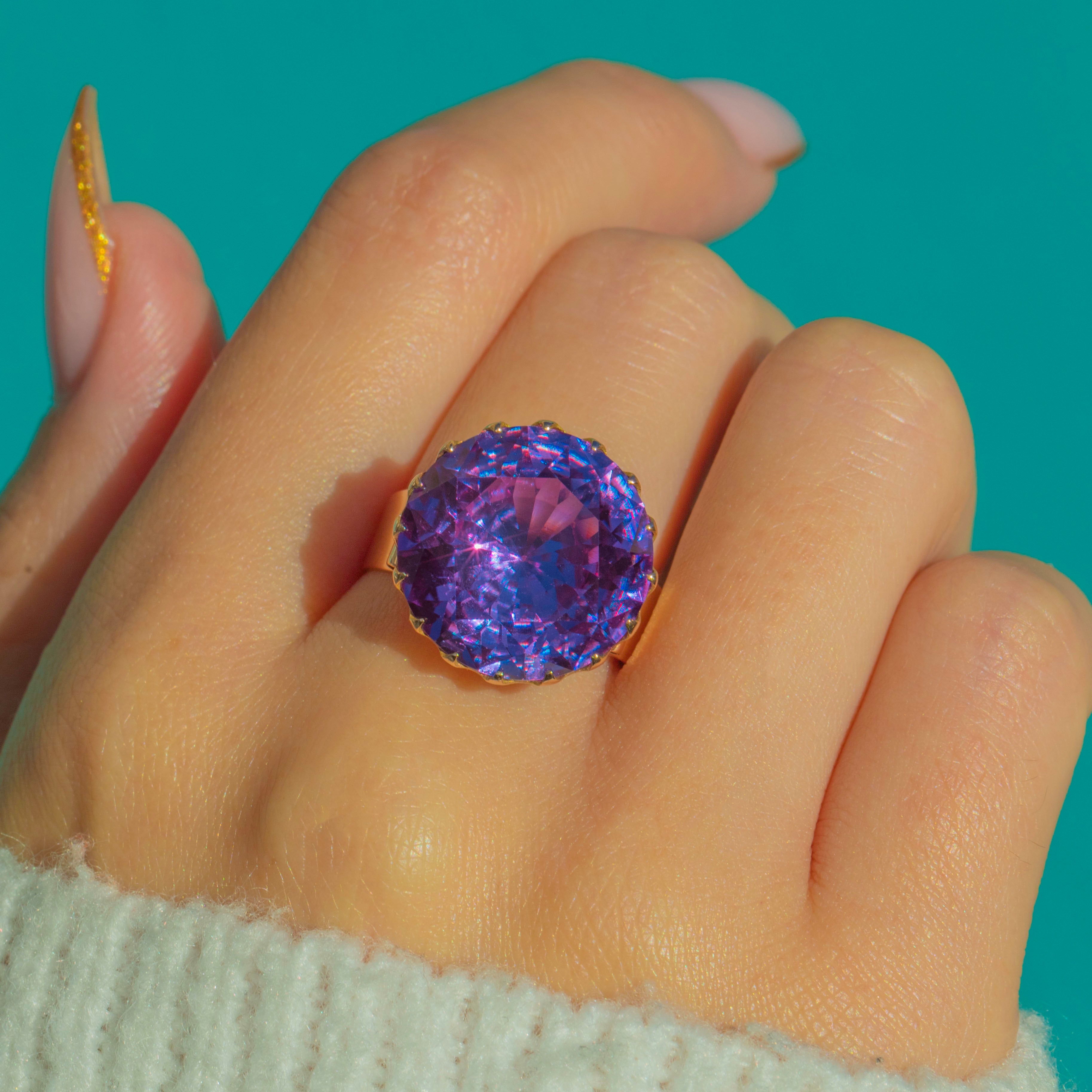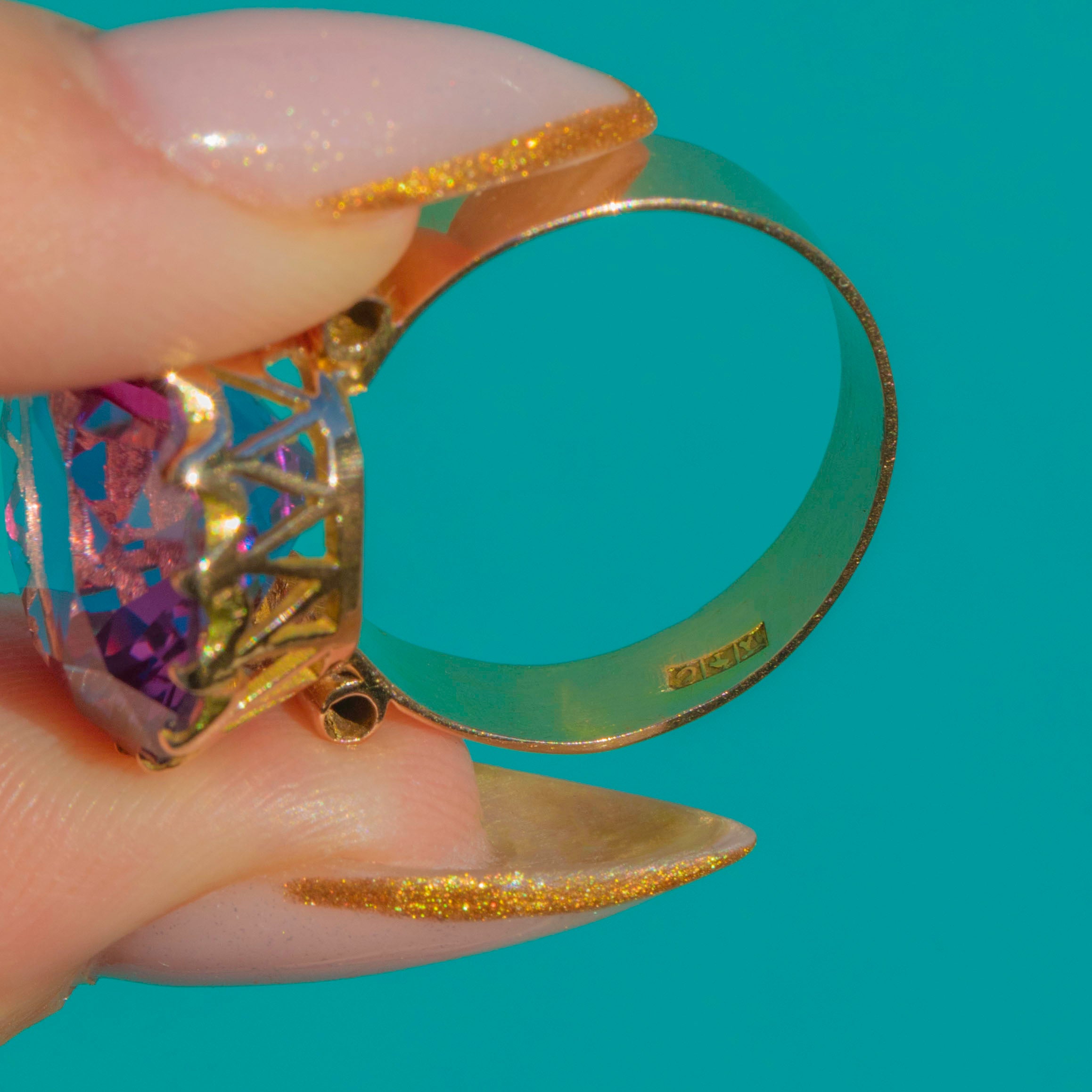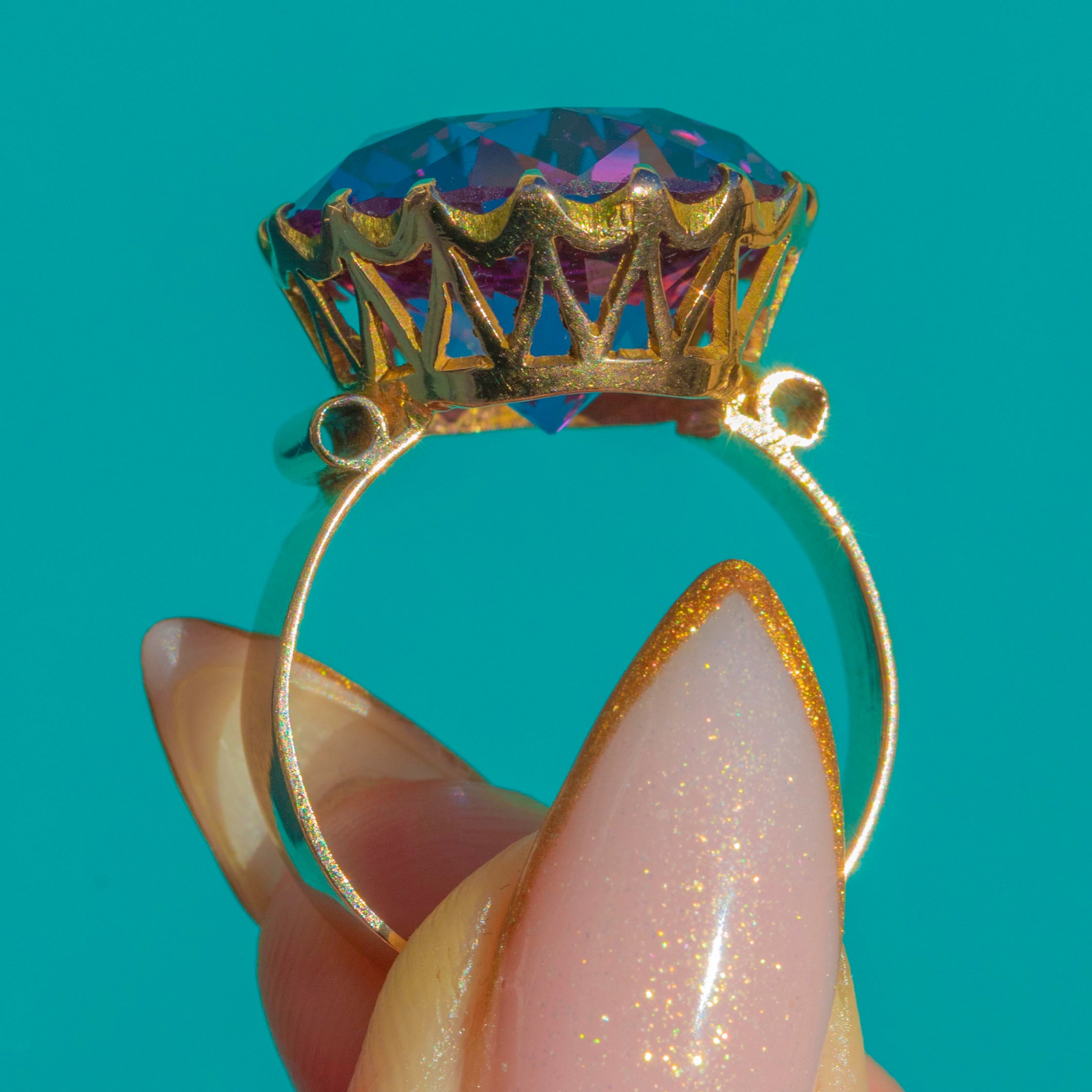This bold 18ct Gold cocktail ring is all about that incredible centre stone – a large synthetic colour-change Sapphire that shifts hue in different lighting. The gem has a fabulous presence on the hand, with a wide, high dome that gives it a luxurious “statement” look, very much in keeping with mid 20th-century glamour.