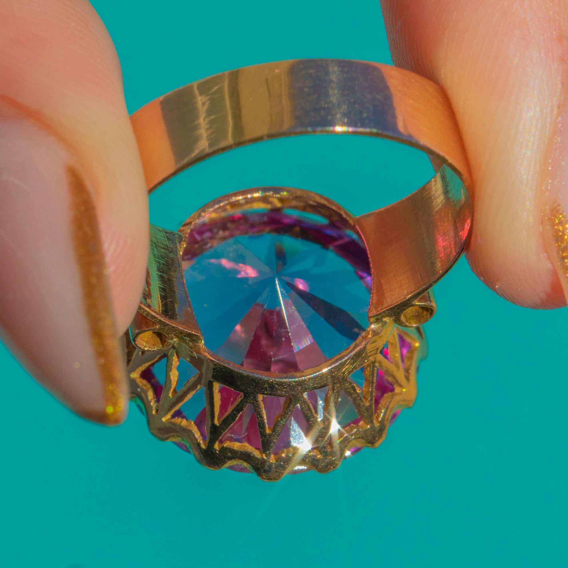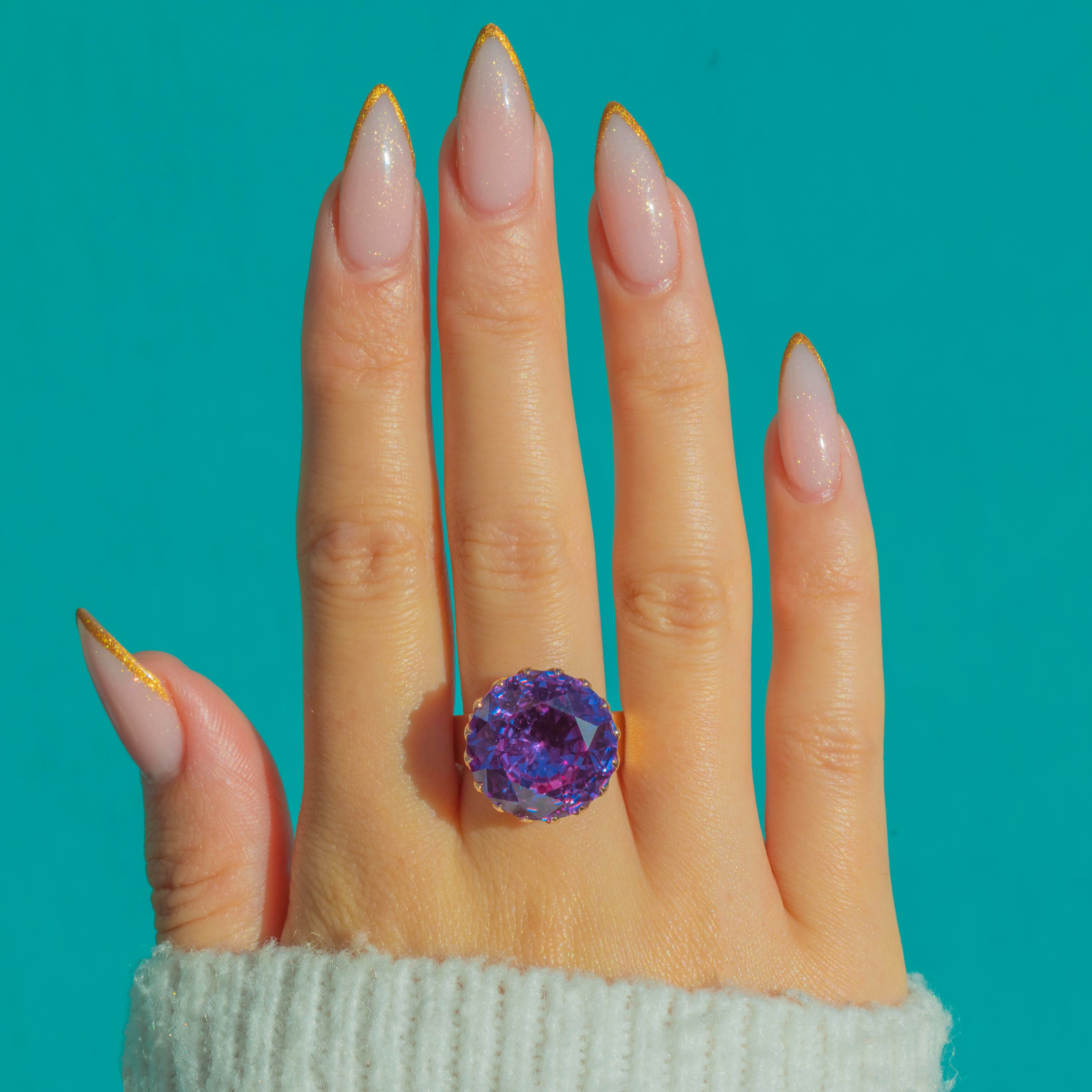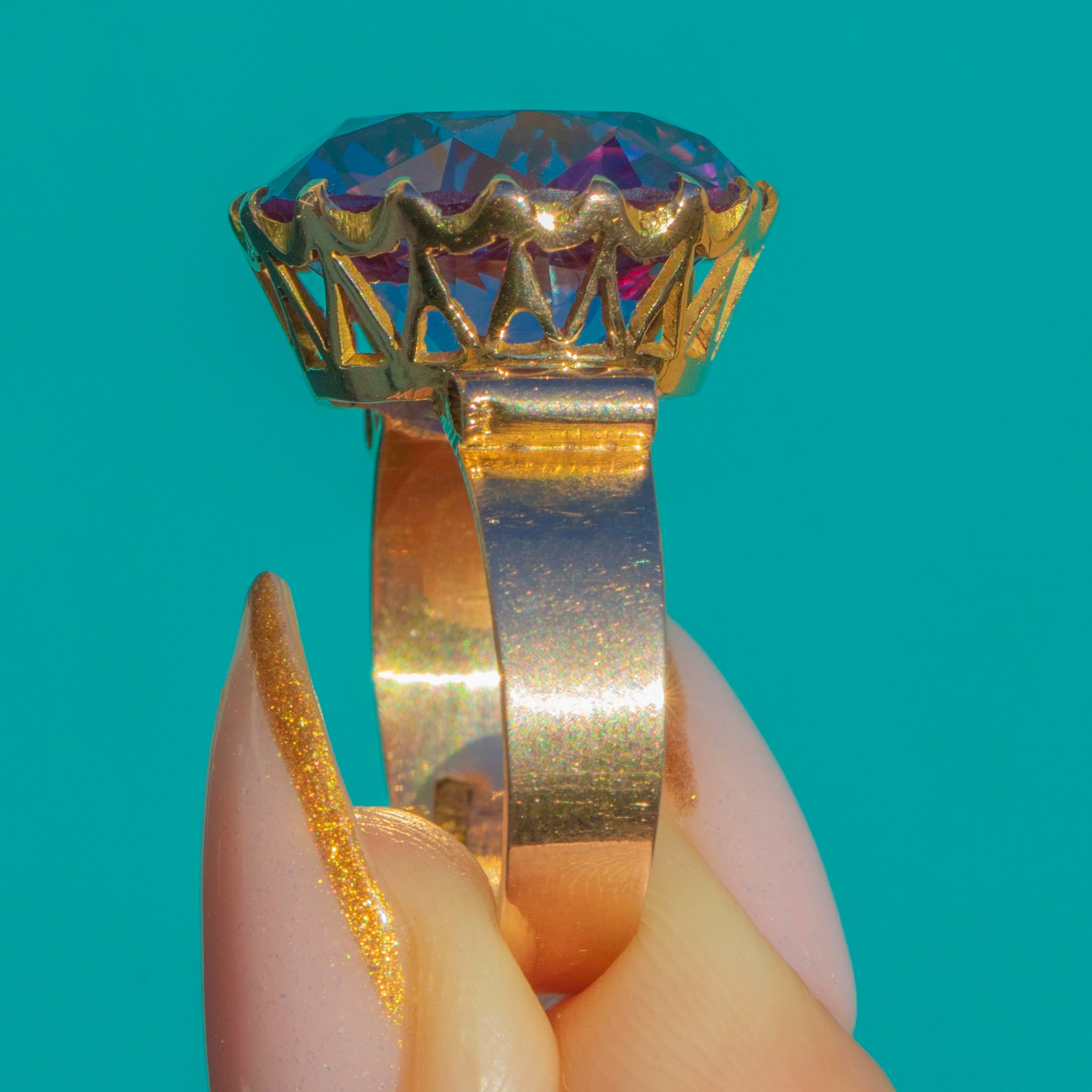 This bold 18ct Gold cocktail ring is all about that incredible centre stone – a large synthetic colour-change Sapphire that shifts hue in different lighting. The gem has a fabulous presence on the hand, with a wide, high dome that gives it a luxurious “statement” look, very much in keeping with mid 20th-century glamour.