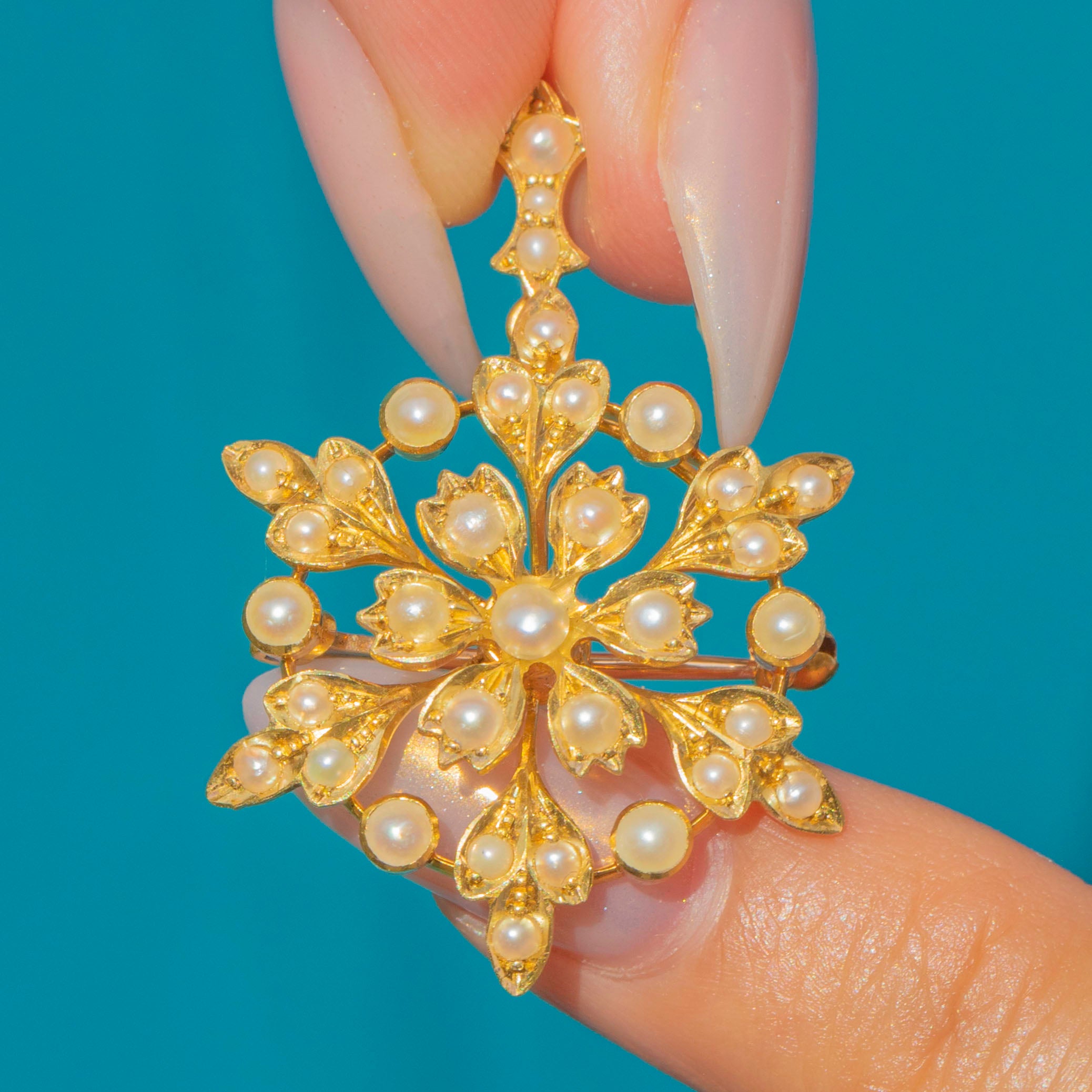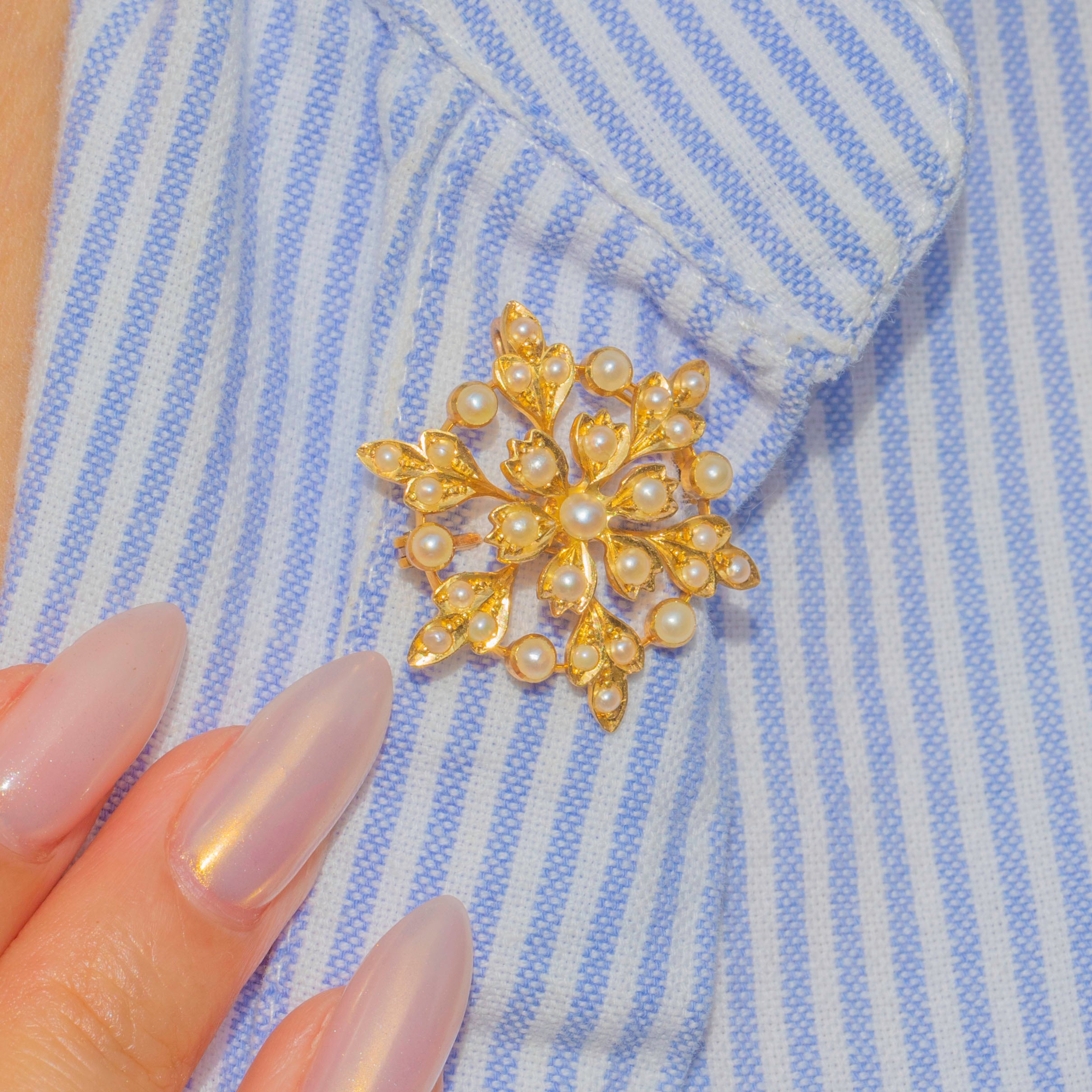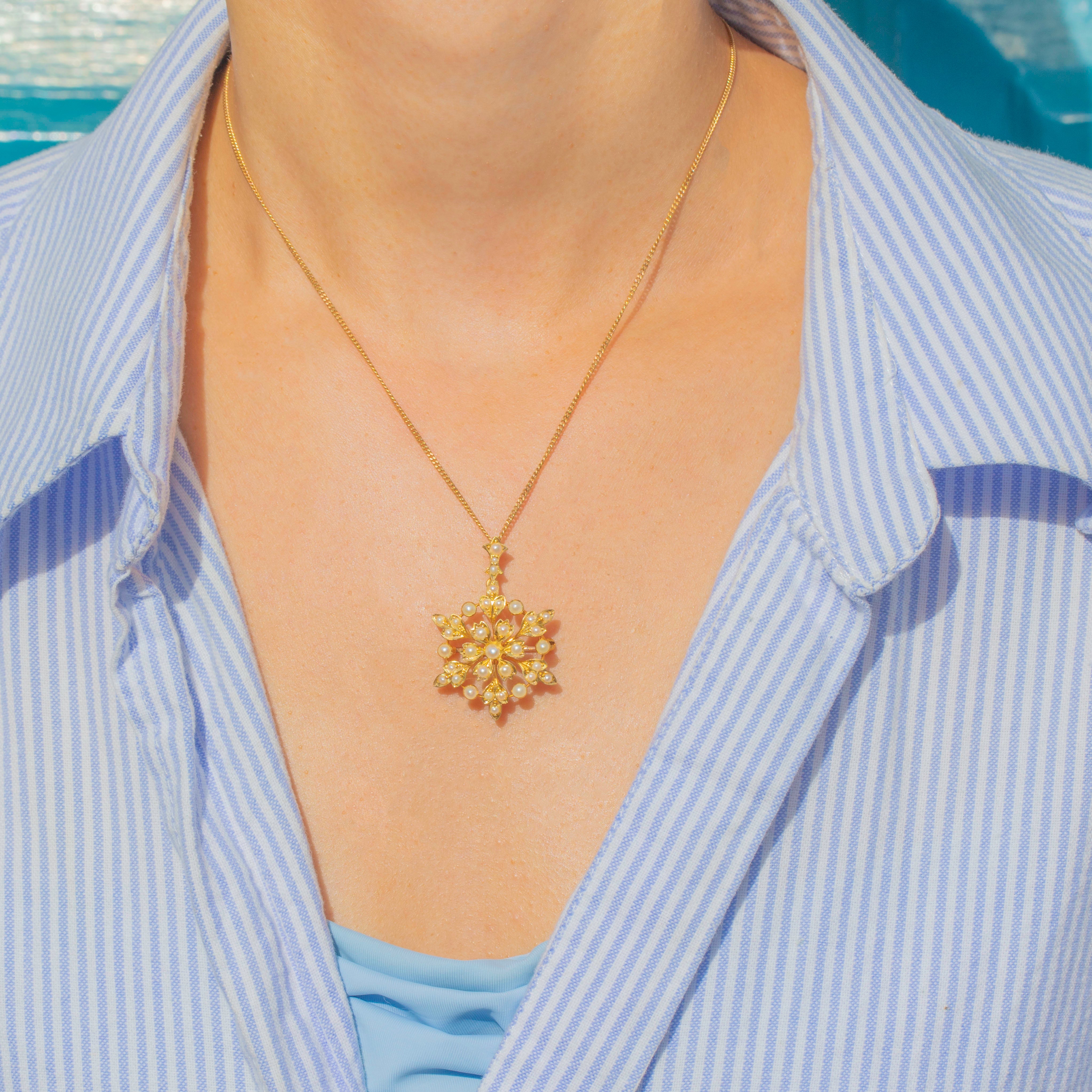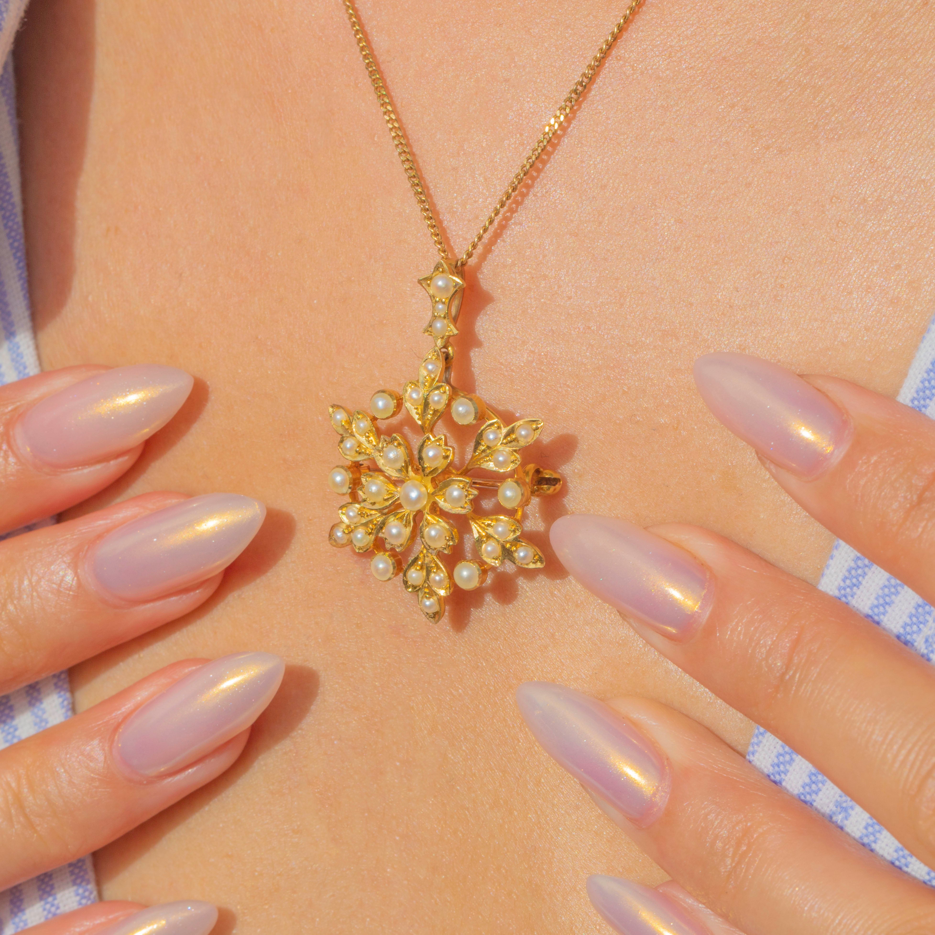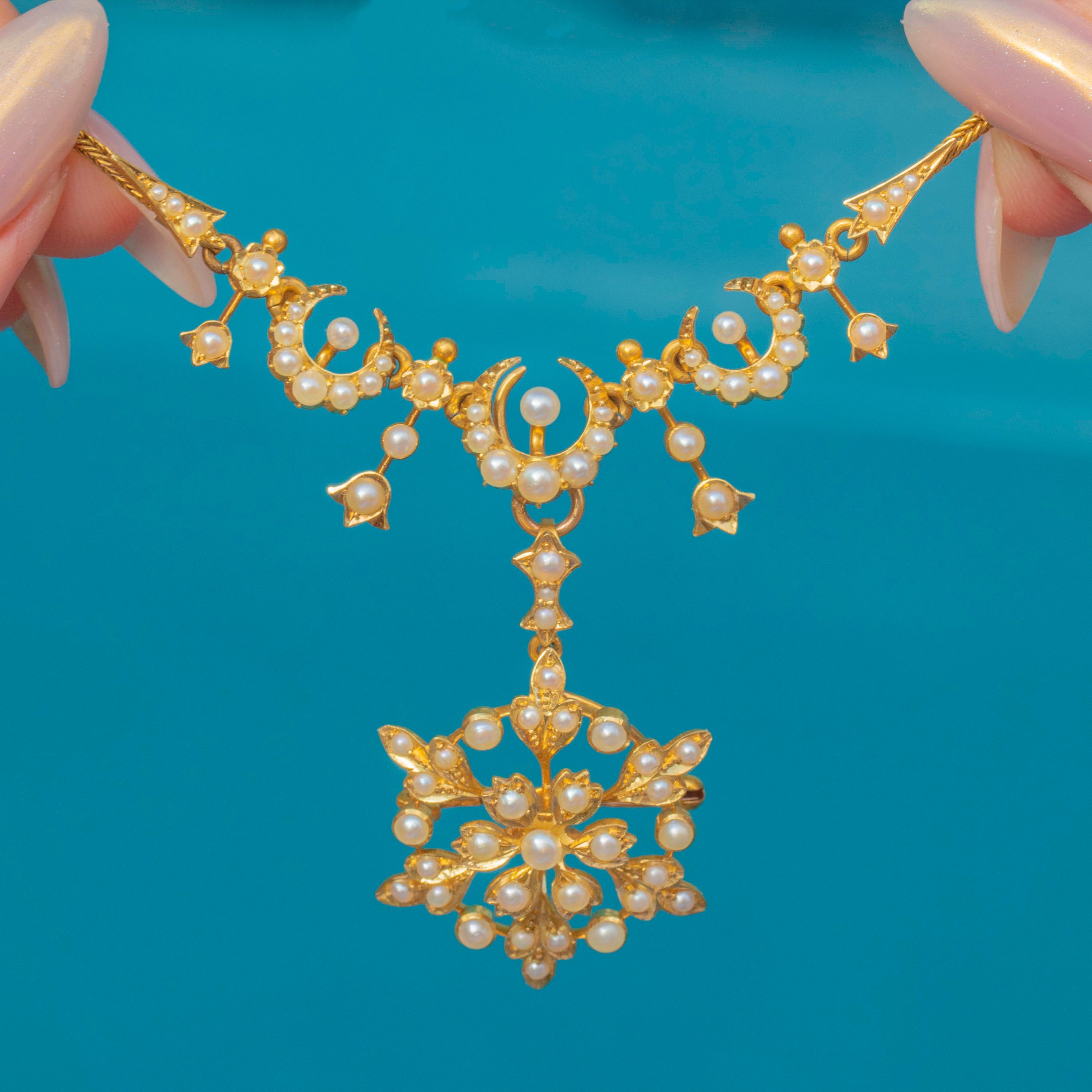18ct Gold Edwardian Pearl Flower Necklace with Crescent Moon Details - Removable Pendant