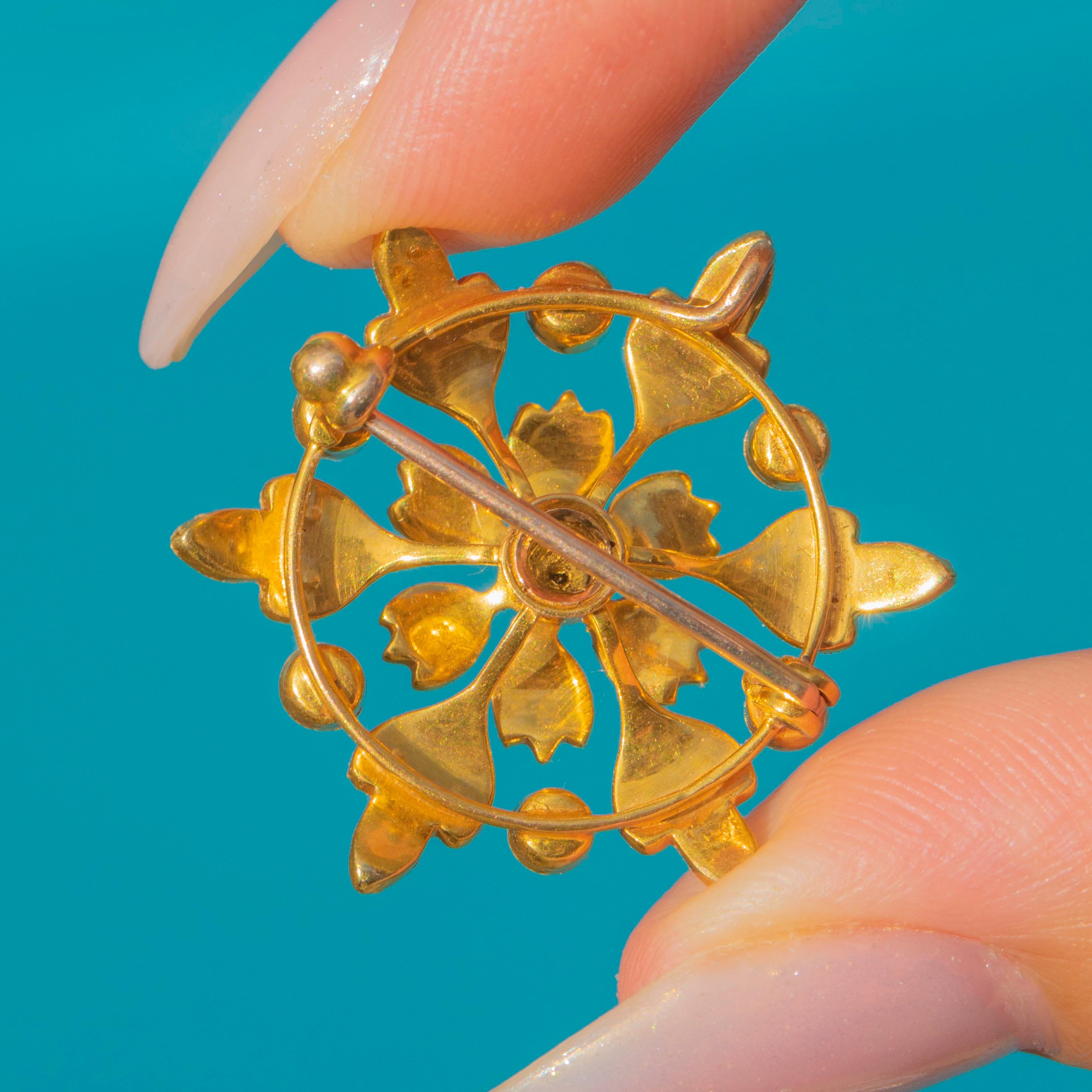 A magnificent Edwardian necklace crafted in rich 18ct Gold, adorned with natural Pearls displayed within romantic crescent moon, foliate and fleur-de-lys motifs. The design features a detachable Pearl flower pendant, which can also be worn as a brooch, giving this jewel wonderful versatility.