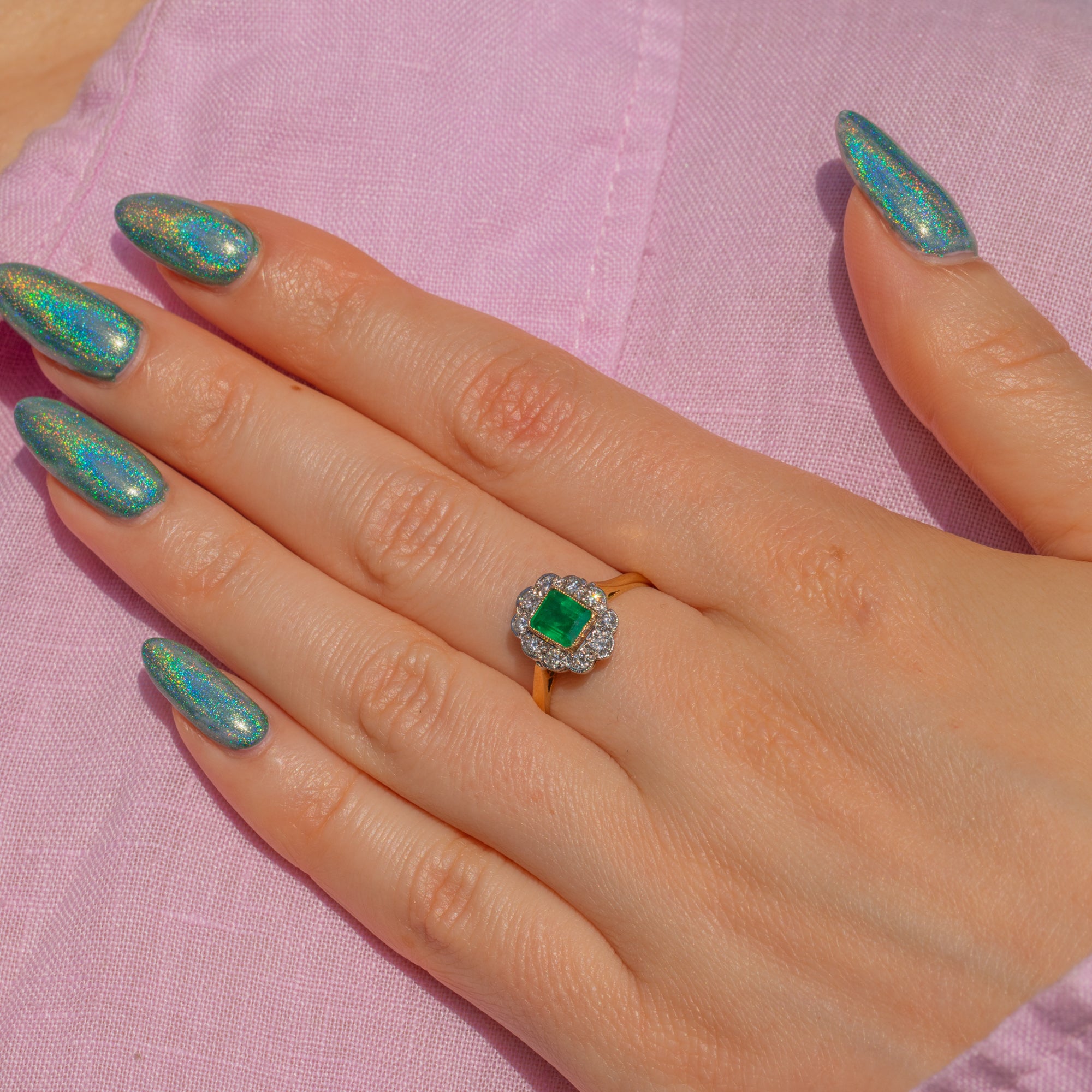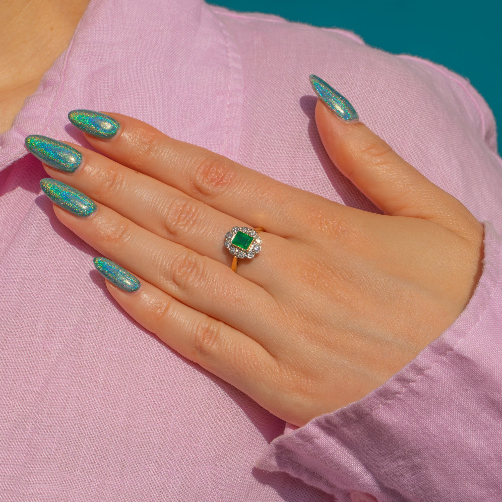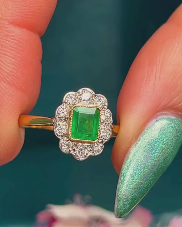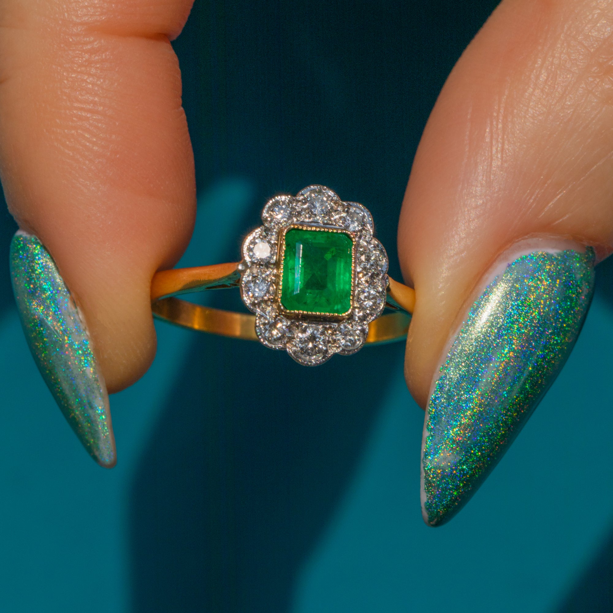 We are swooning over this 18ct Gold Emerald Diamond cluster ring! This incredible ring is home to a 0.60ct Emerald with a vibrant grass-green hue, surrounded by a halo of Diamonds that are crisp with a satisfying scintillation.