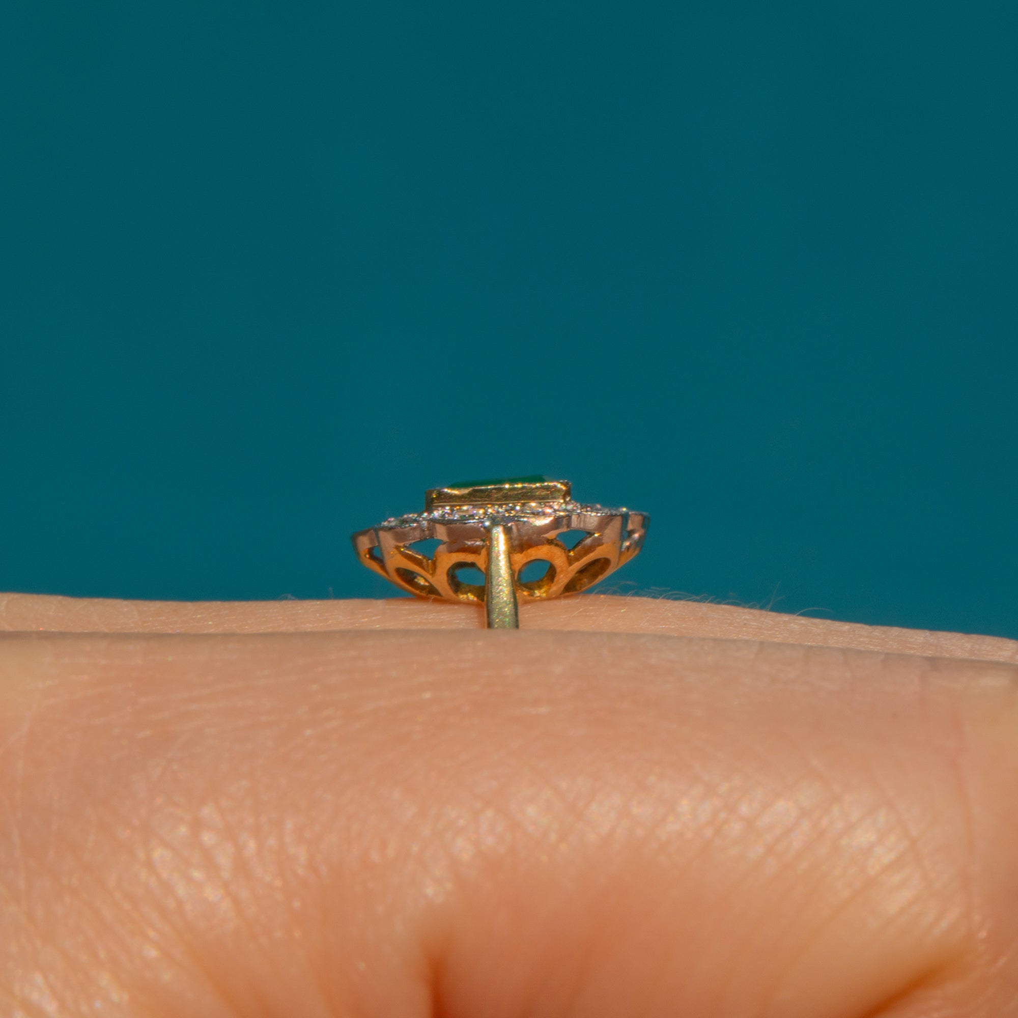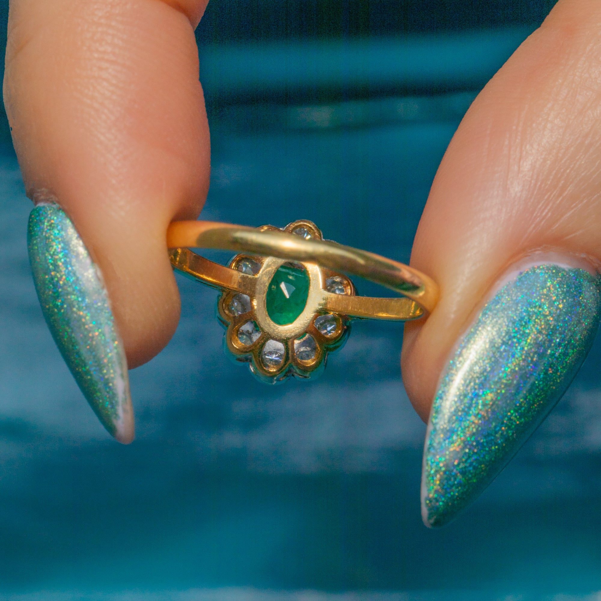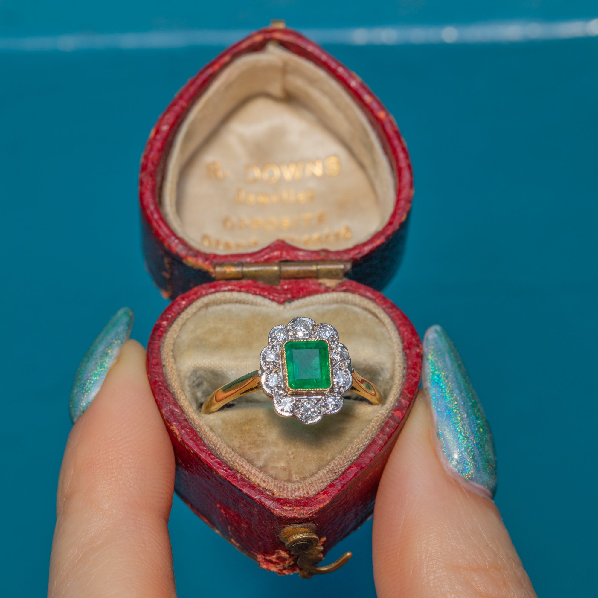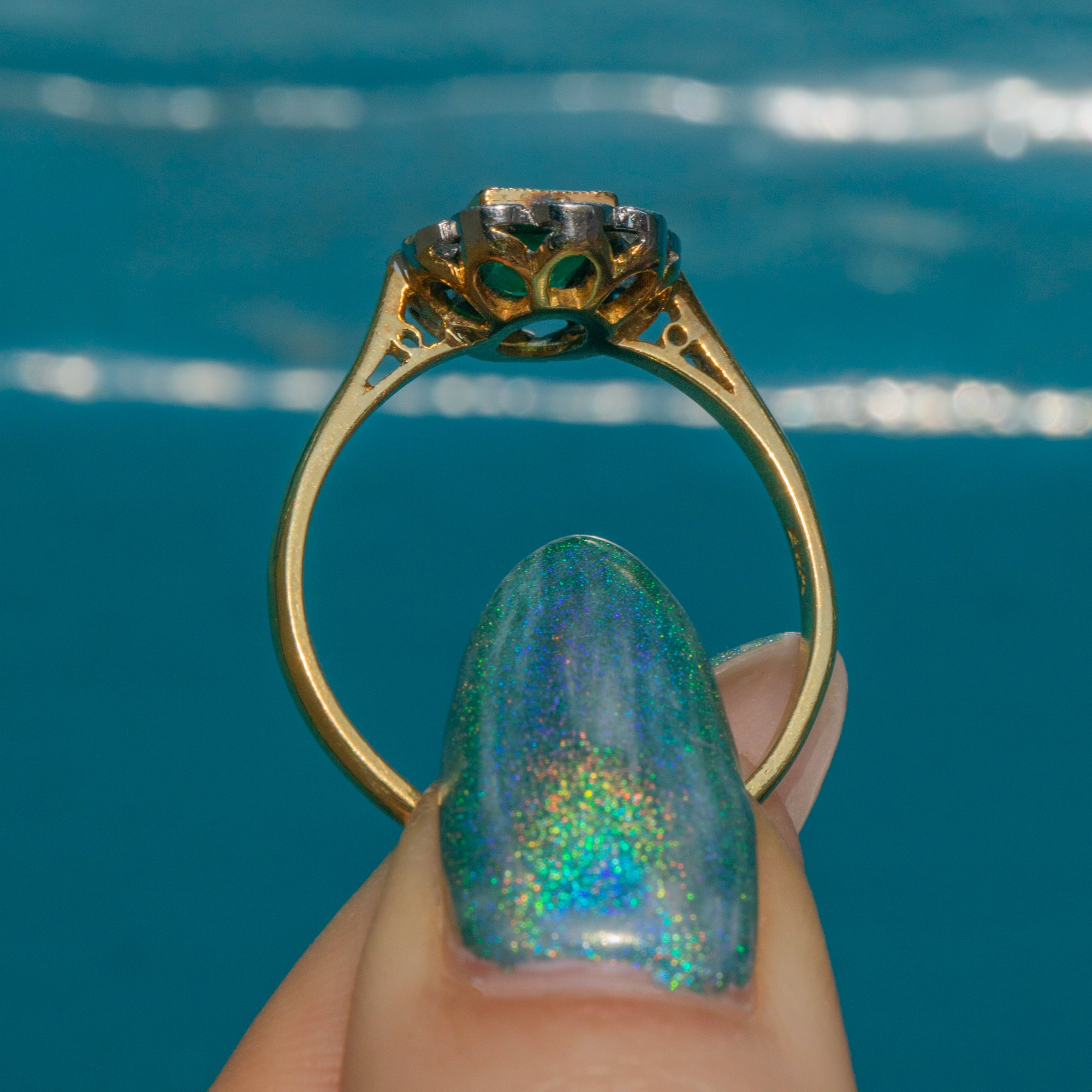 We are swooning over this 18ct Gold Emerald Diamond cluster ring! This incredible ring is home to a 0.60ct Emerald with a vibrant grass-green hue, surrounded by a halo of Diamonds that are crisp with a satisfying scintillation.
