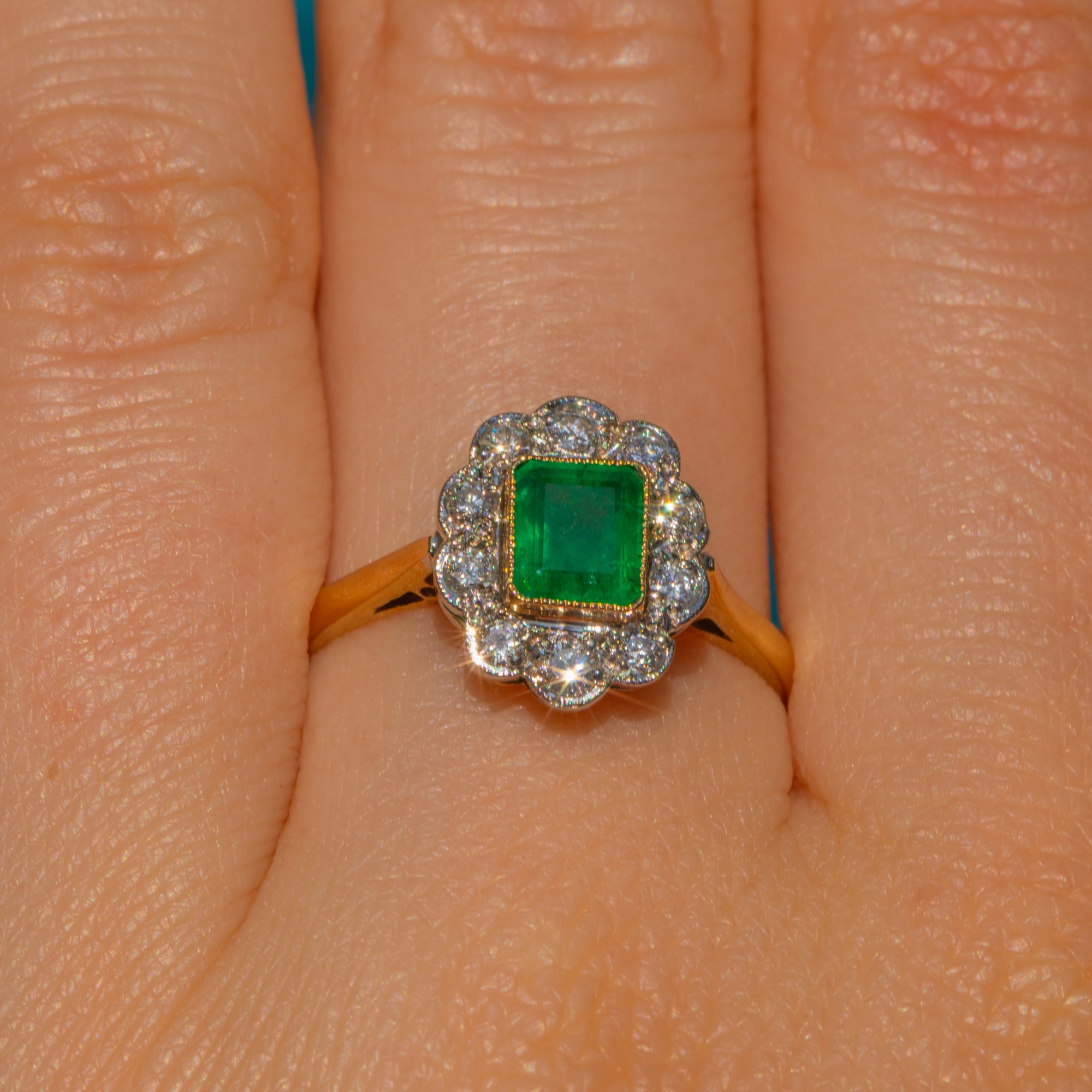 EXCELLENT. This is an 18ct Gold Emerald Diamond cluster ring in excellent condition. The Emerald has a crisp set of facets and sits neatly inside a bezel setting. The Diamonds are all secure and look pretty in their 18ct white Gold settings. The ring band is robust, and you can wear this piece with confidence!