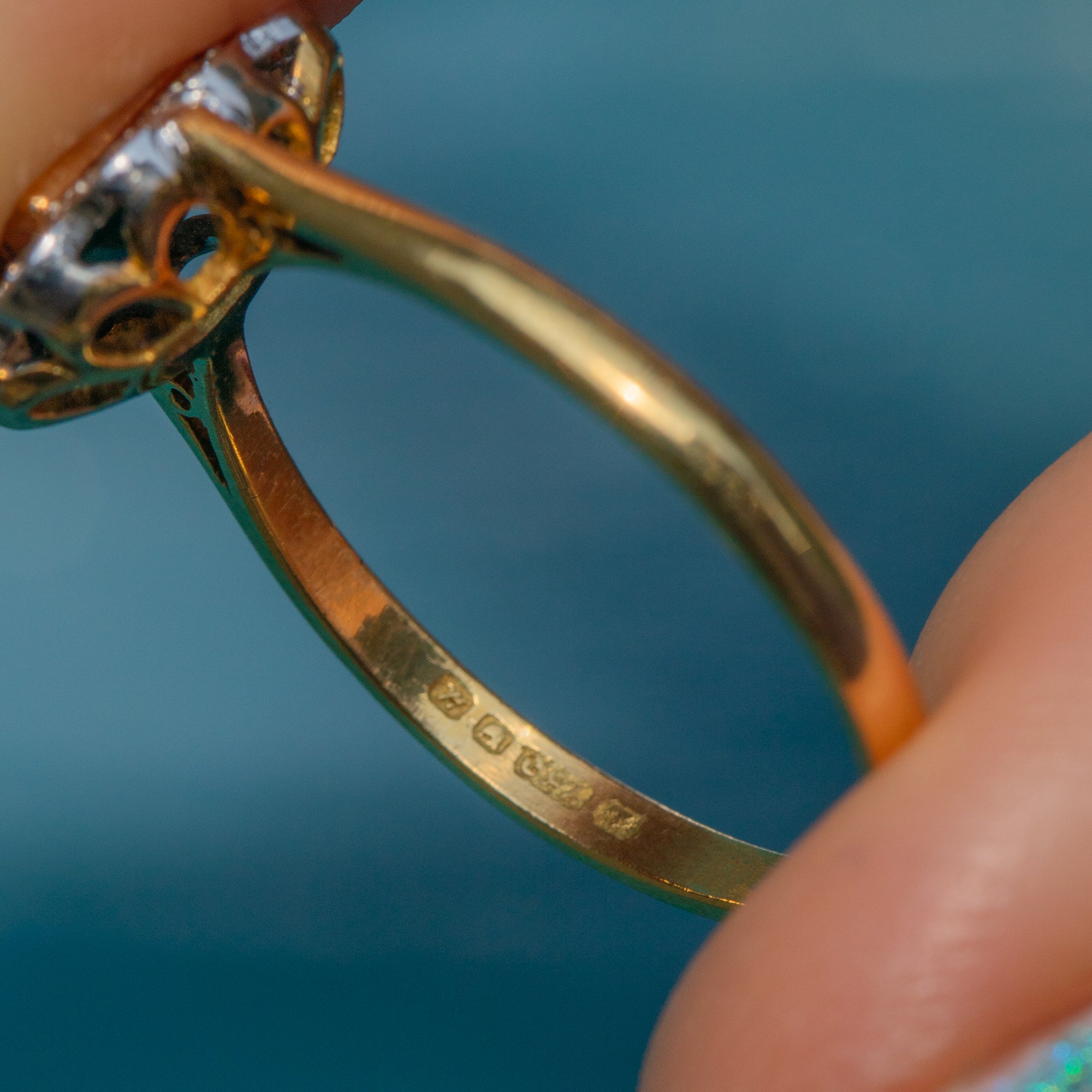 The sweet gemstone flower cluster rests atop a buttery 18ct Gold shank, making her a luxurious ring for your collection; she would make the perfect choice for a unique engagement ring!