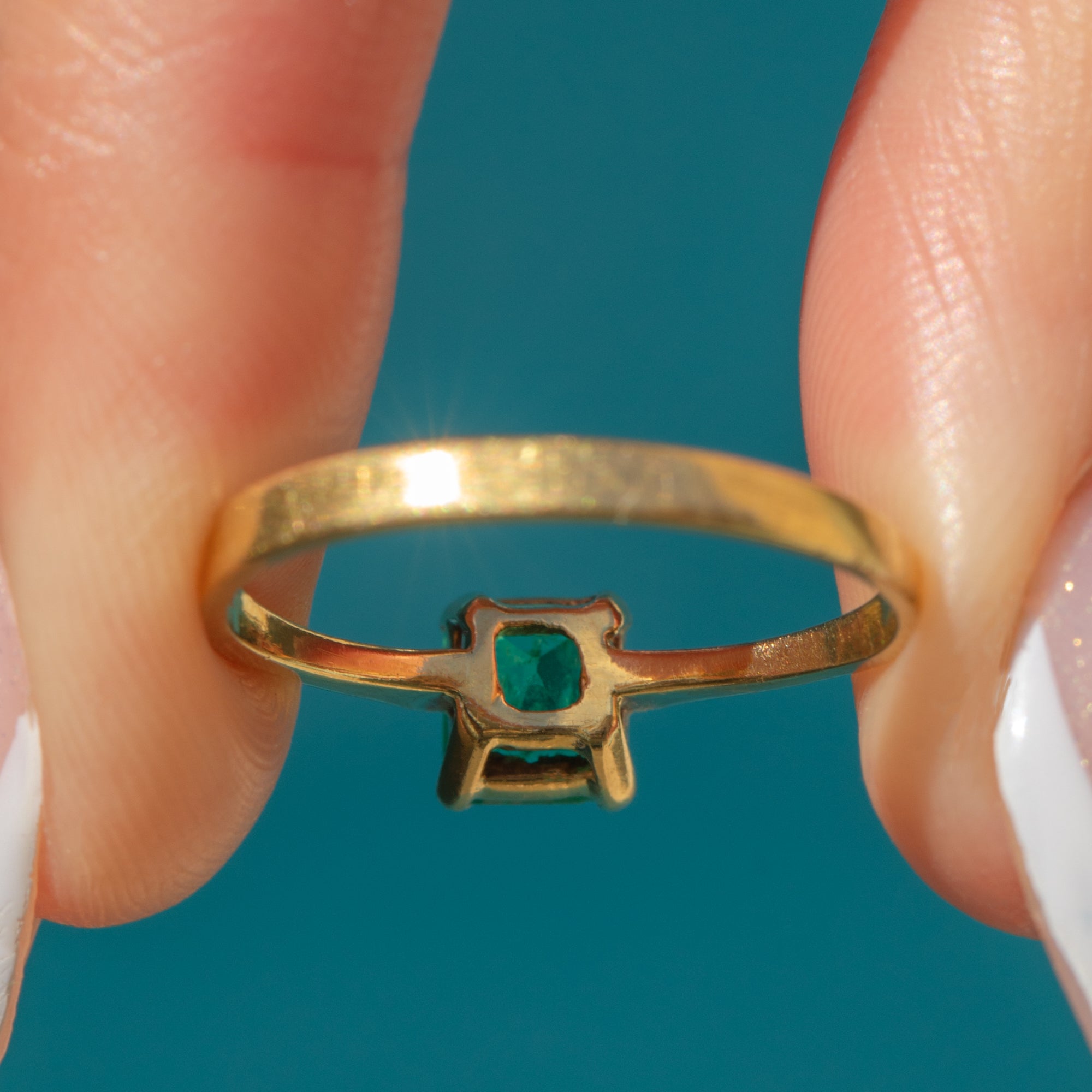 This elegant 18ct Gold Emerald solitaire ring is a classic example of the striking craftsmanship of the modern vintage era, and would make the most wonderful choice for a unique engagement ring!