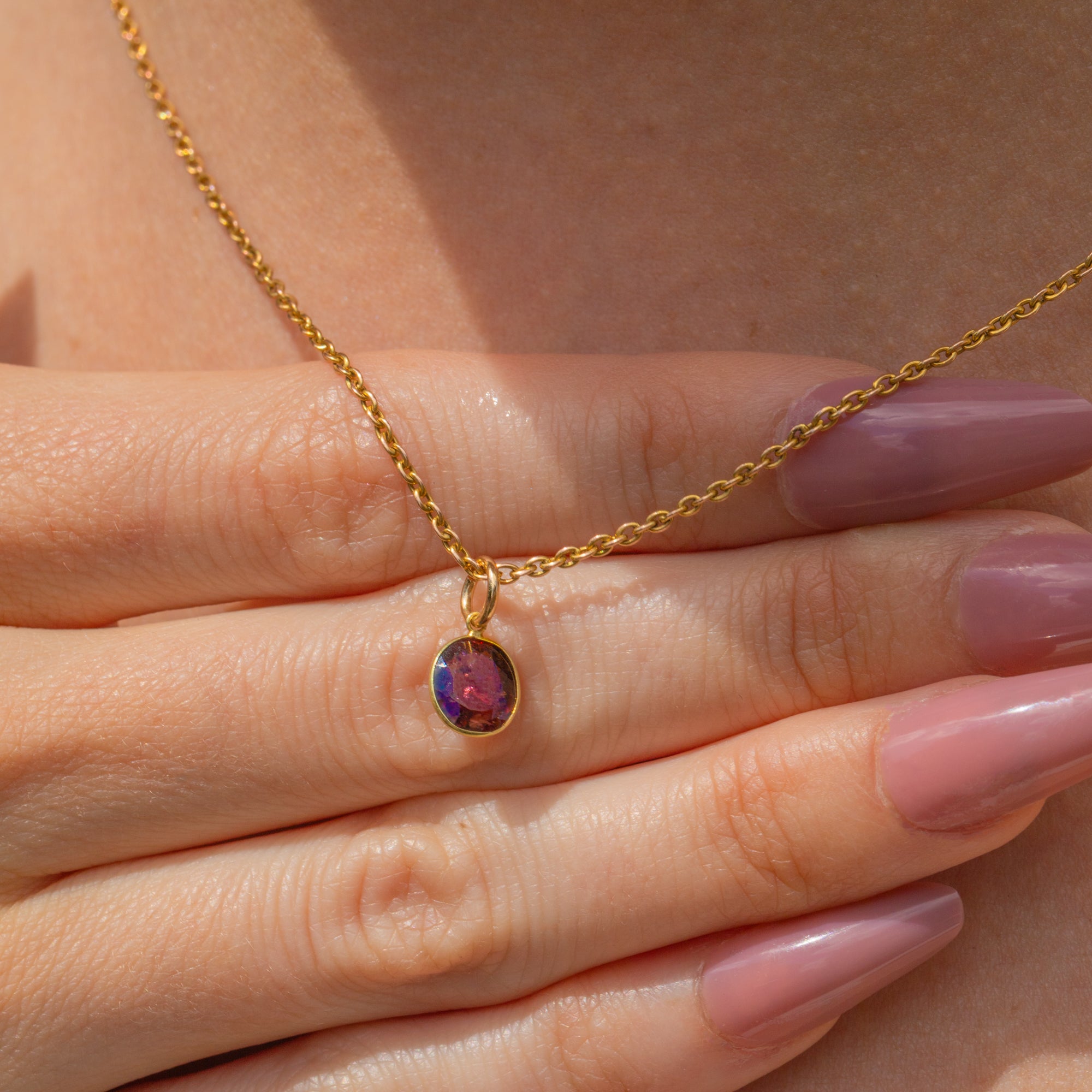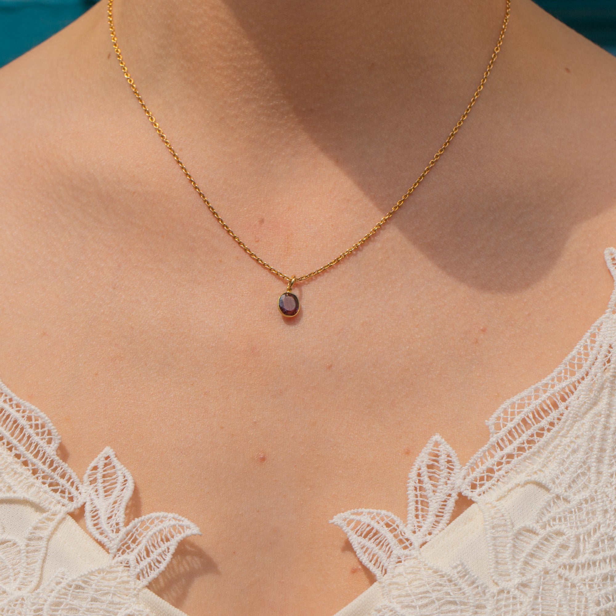 Flaunting a pool of plum hues dancing between her hand-cut facets, this 18ct Gold Garnet bezel-set charm will instantly add a pop of colour to any attire!