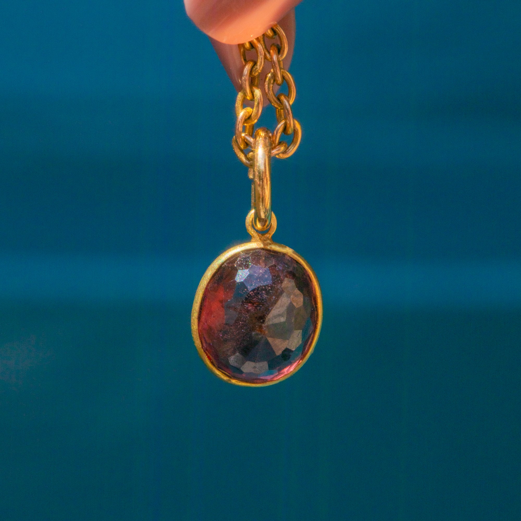 EXCELLENT. This 18ct Gold Garnet bezel-set charm is just delicious! From her Gold setting to her fabulously faceted form, this Victorian Garnet pendant is in excellent condition throughout!