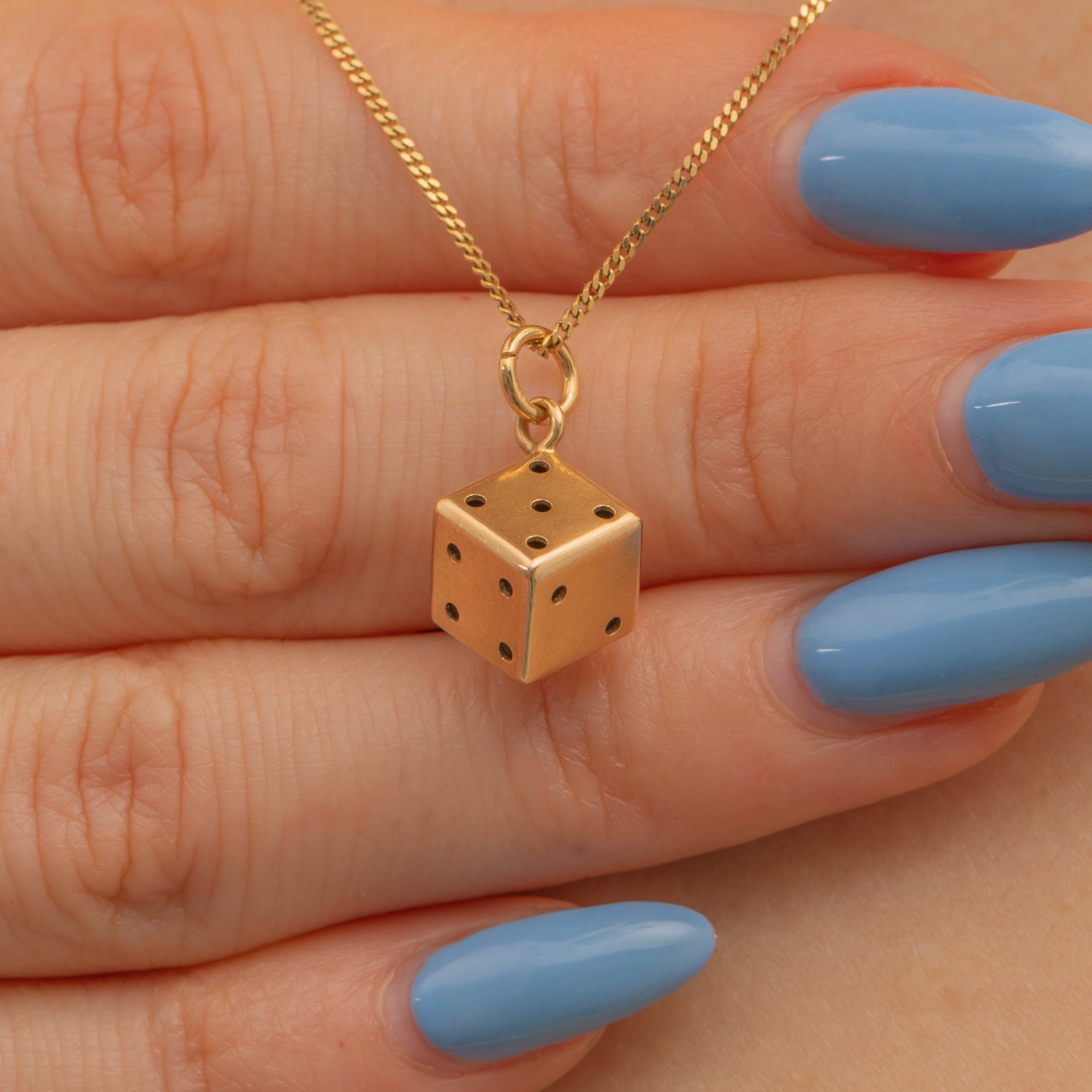 This 18ct Gold lucky dice charm is the perfect good luck talisman to carry with you everywhere! Crafted from brightly saturated 18ct Gold, the three dimensional form of this mid-century vintage charm is wonderfully tactile.