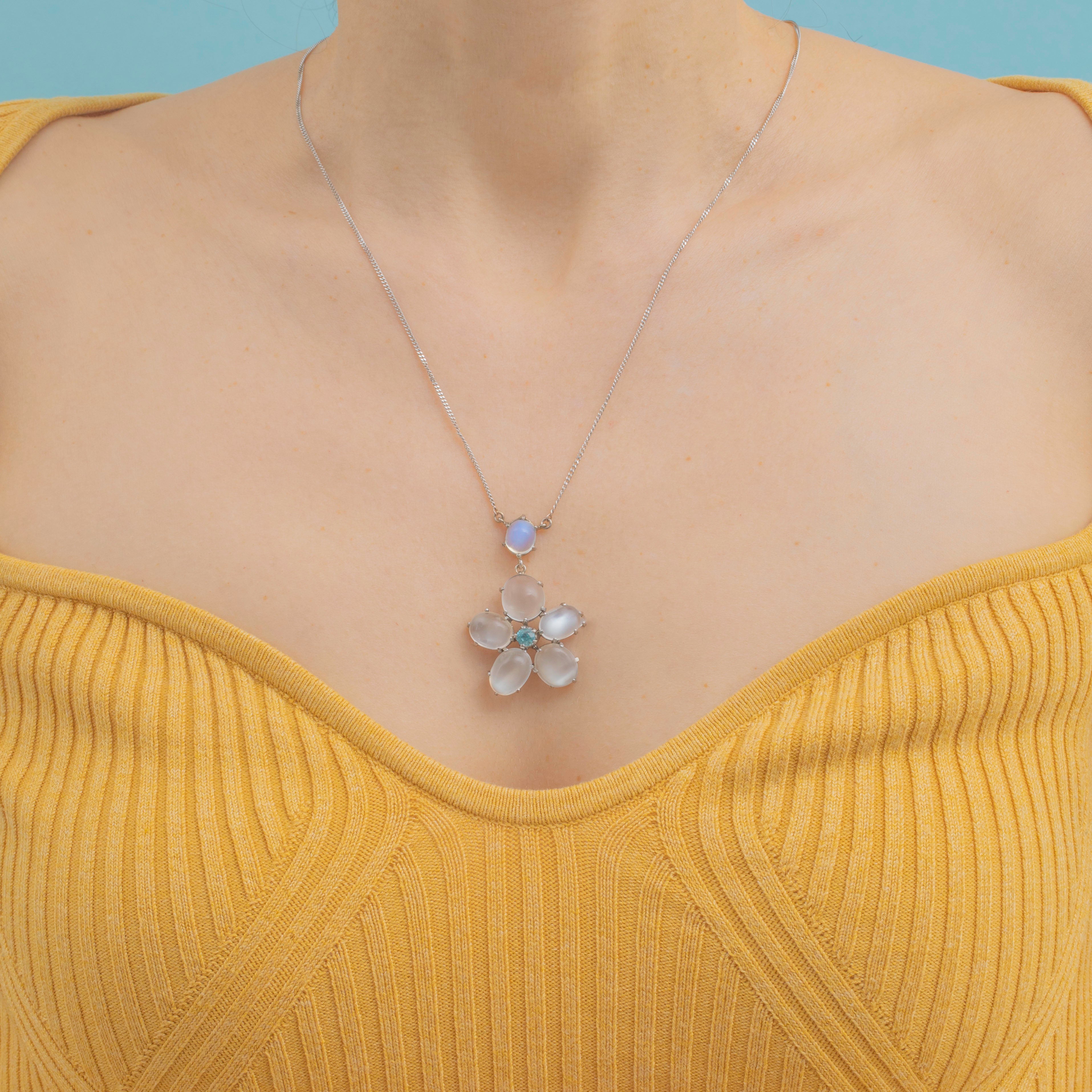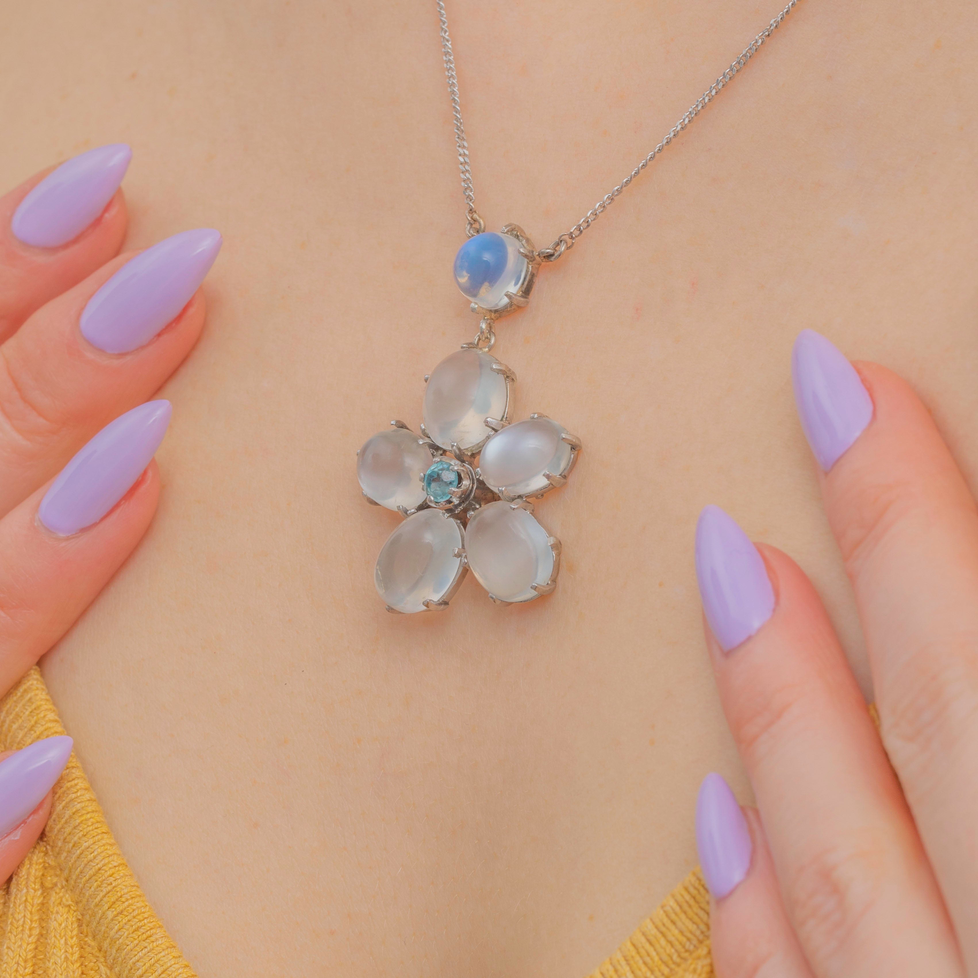 18ct Gold Moonstone & Blue Zircon Flower Drop Necklace, 13.50ct