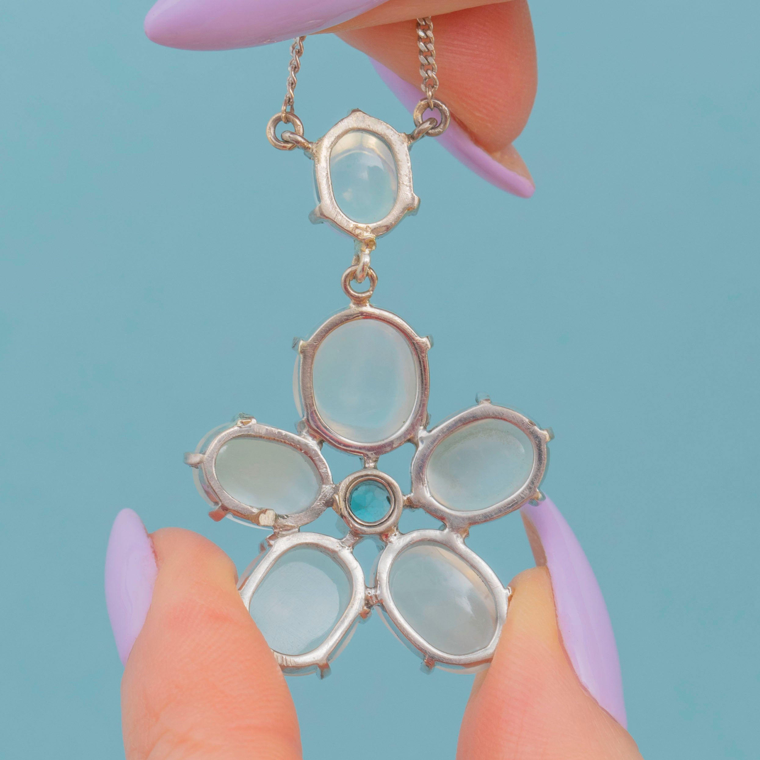 VERY GOOD-EXCELLENT. This 18ct Gold Moonstone and Blue Zircon flower drop necklace is in lovely condition. Each of her gemstones is radiant, with only some minor scratches to the surface of Moonstones commensurate with age. With a secure chain, you can wear her with the utmost confidence.