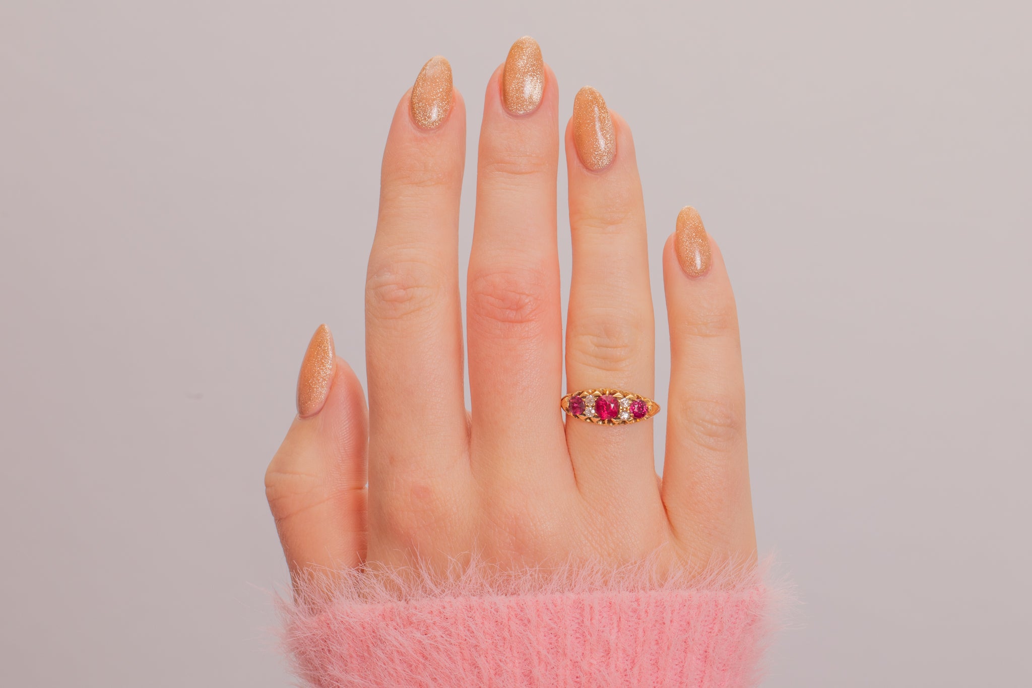 You are sure to get your sparkle fix with this piece- boasting three berry red Rubies, each with two bright Diamond sandwiched in between. The ring band is solid 18ct Gold, and hallmarked to 1902, making this piece all the more special!