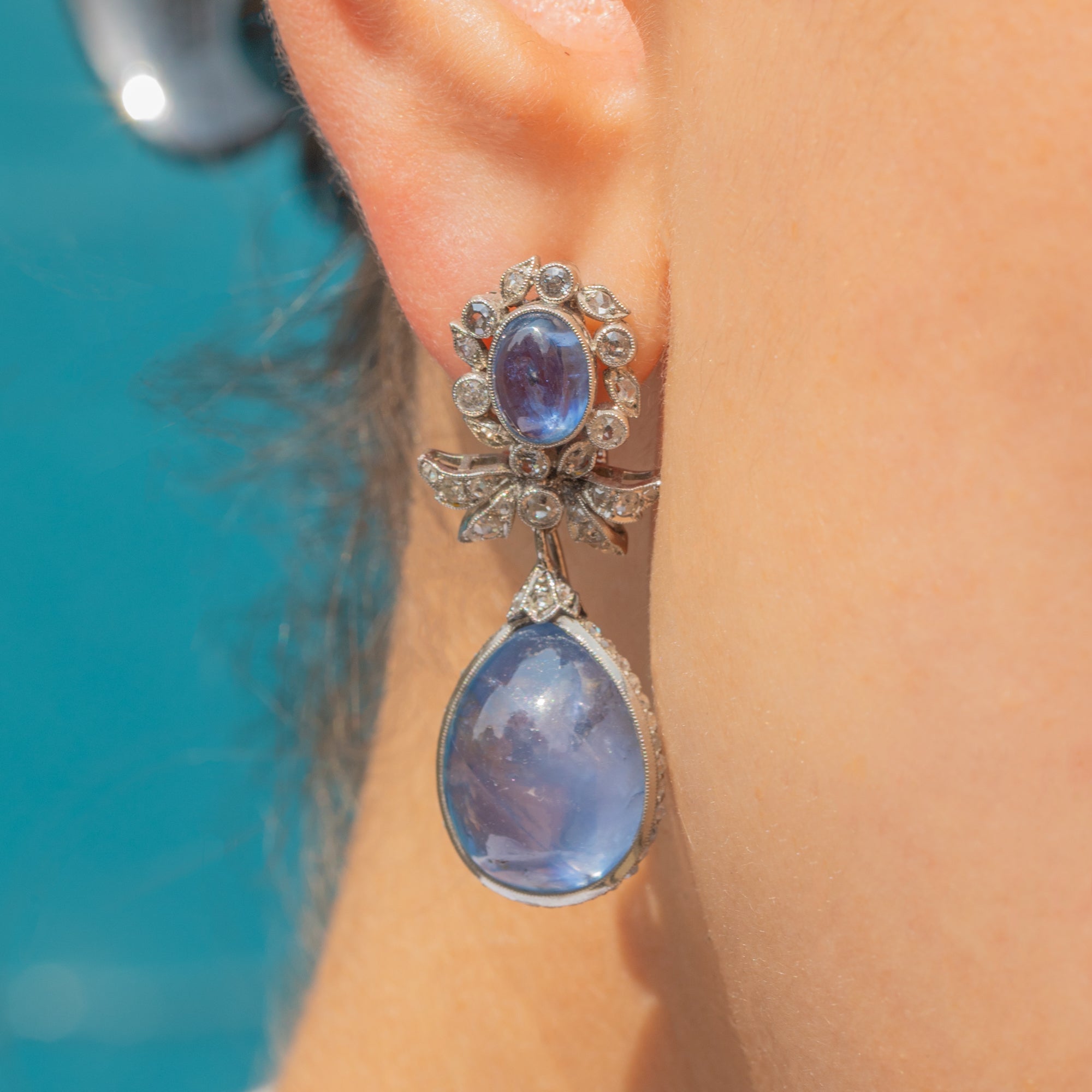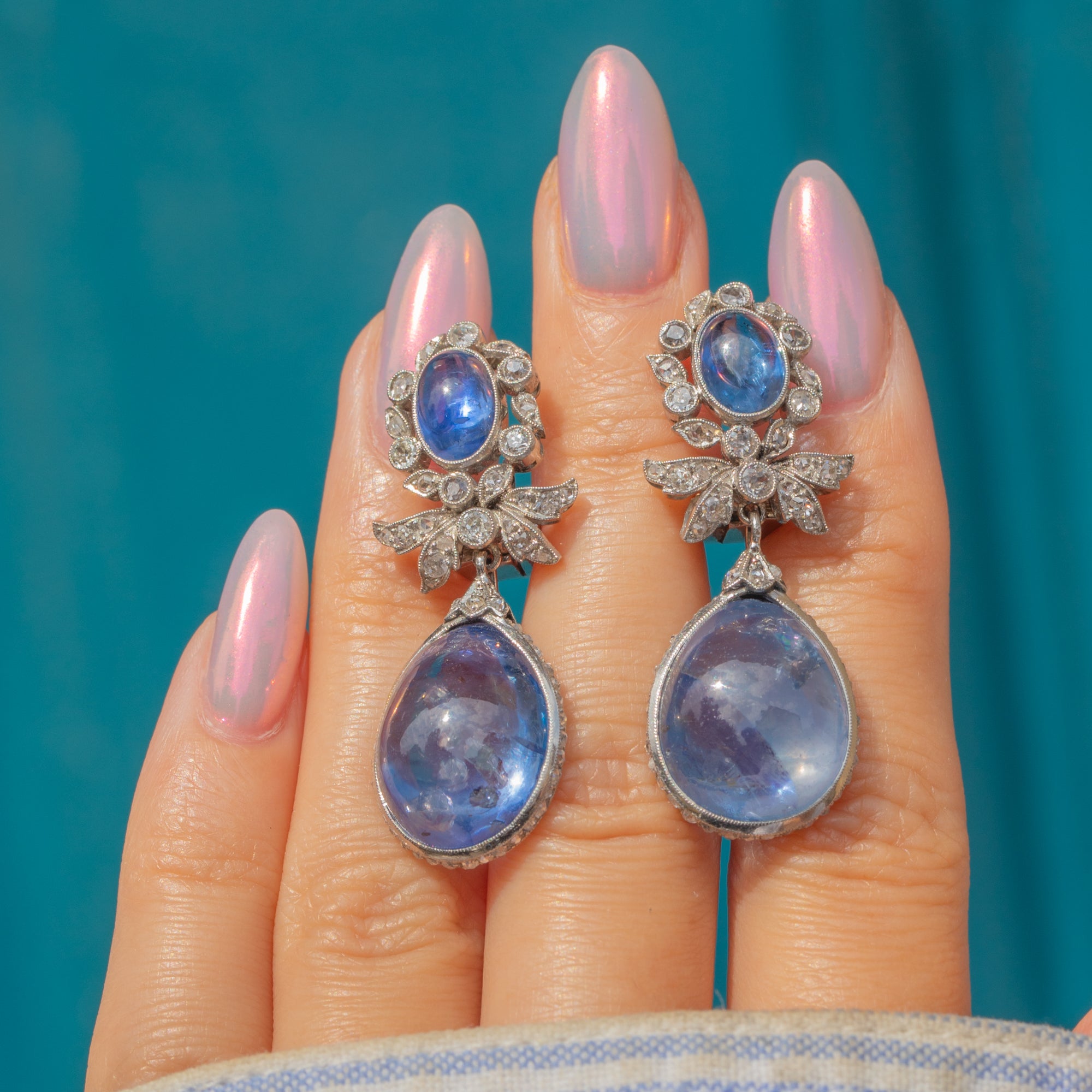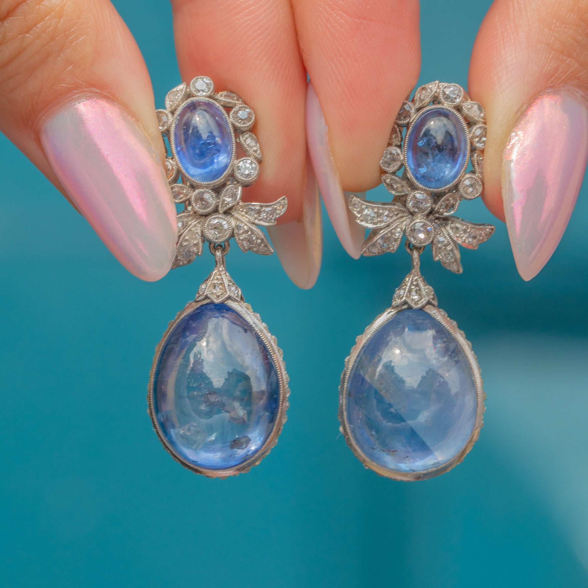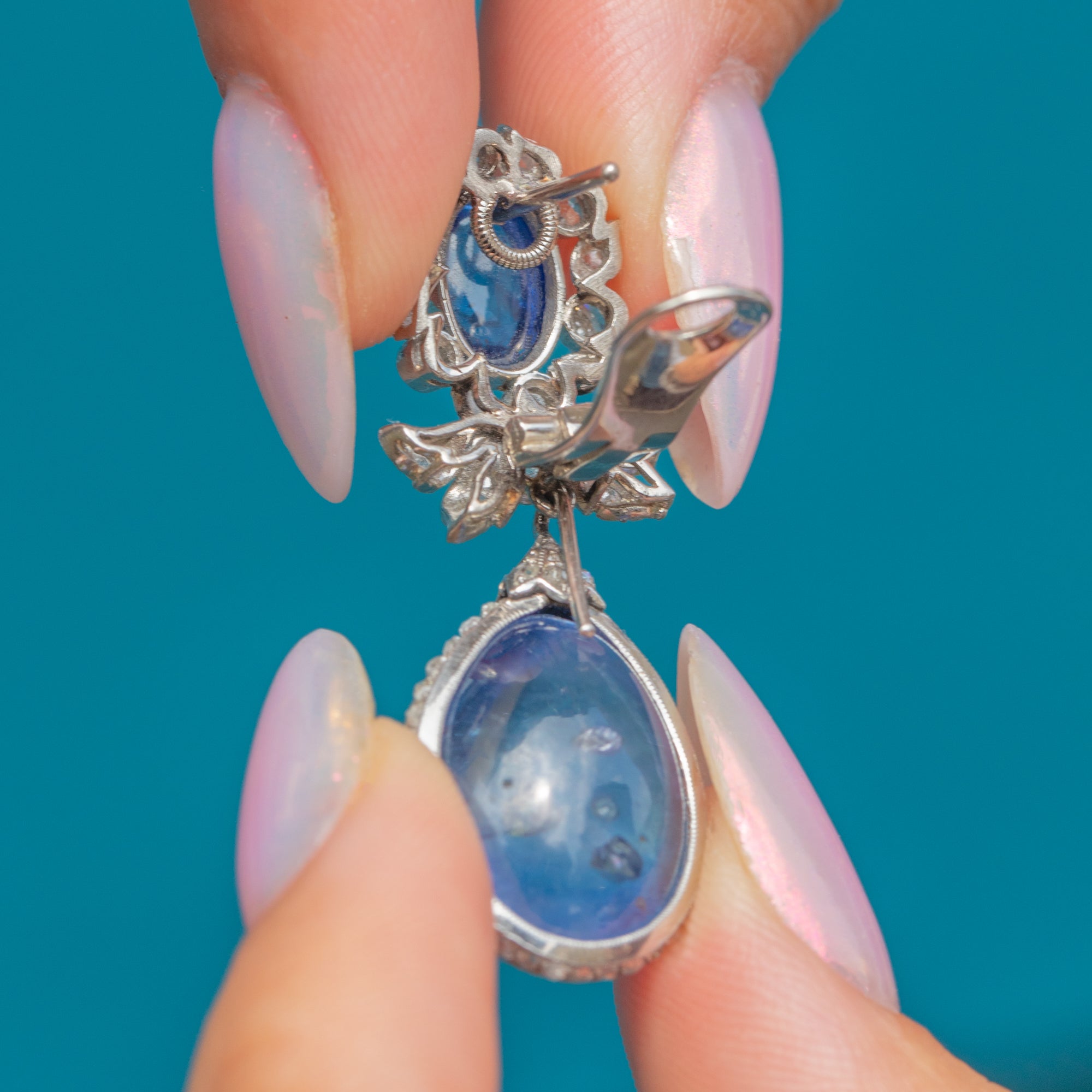 Suspended from each cluster is a detachable drop element, consisting of a large pear-shaped natural Sapphire cabochon, weighing a whopping 18.00ct each. These richly hued stones are surrounded by a finely set border of round brilliant-cut Diamonds, enhancing their colour and brilliance with a striking contrast. The Diamonds are precisely pavé-set to create a seamless halo effect, adding sparkle and dimension.