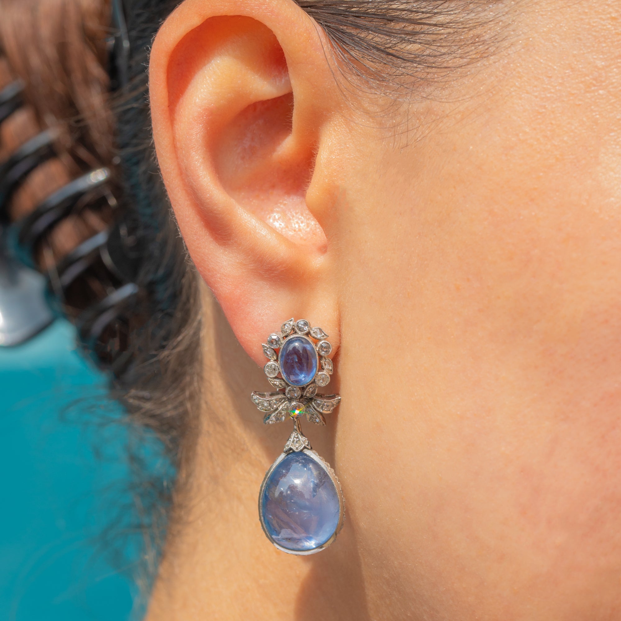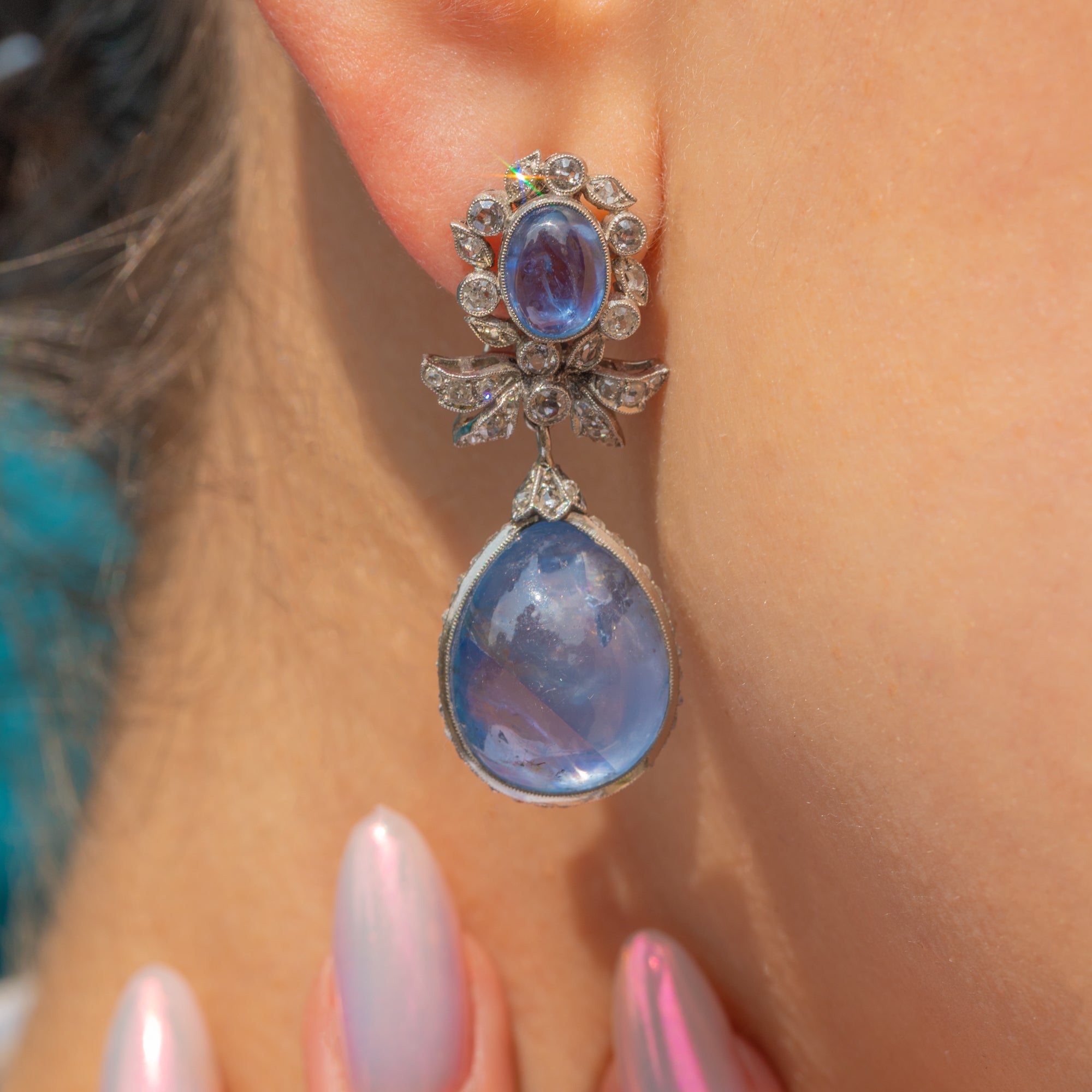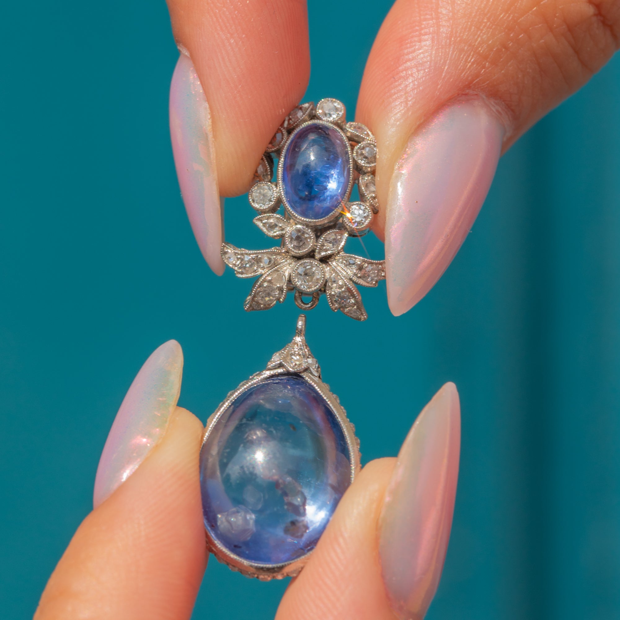 Suspended from each cluster is a detachable drop element, consisting of a large pear-shaped natural Sapphire cabochon, weighing a whopping 18.00ct each. These richly hued stones are surrounded by a finely set border of round brilliant-cut Diamonds, enhancing their colour and brilliance with a striking contrast. The Diamonds are precisely pavé-set to create a seamless halo effect, adding sparkle and dimension.