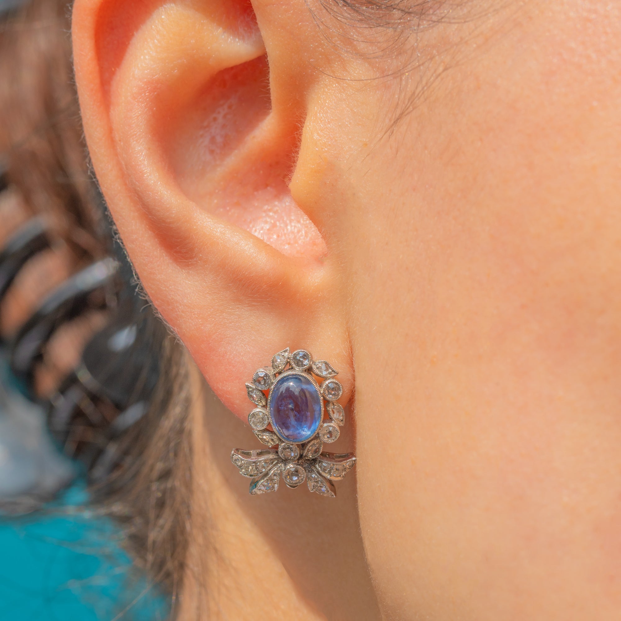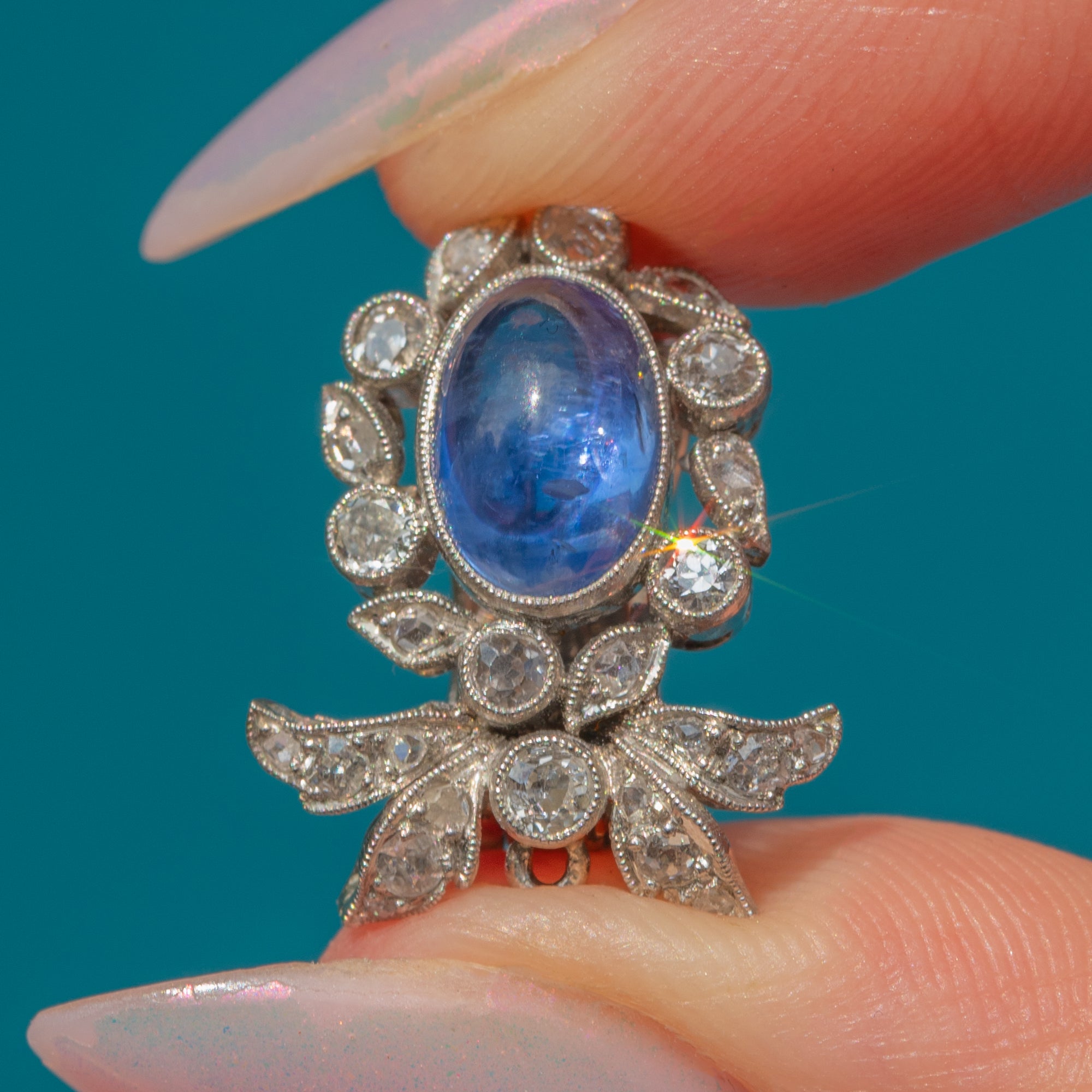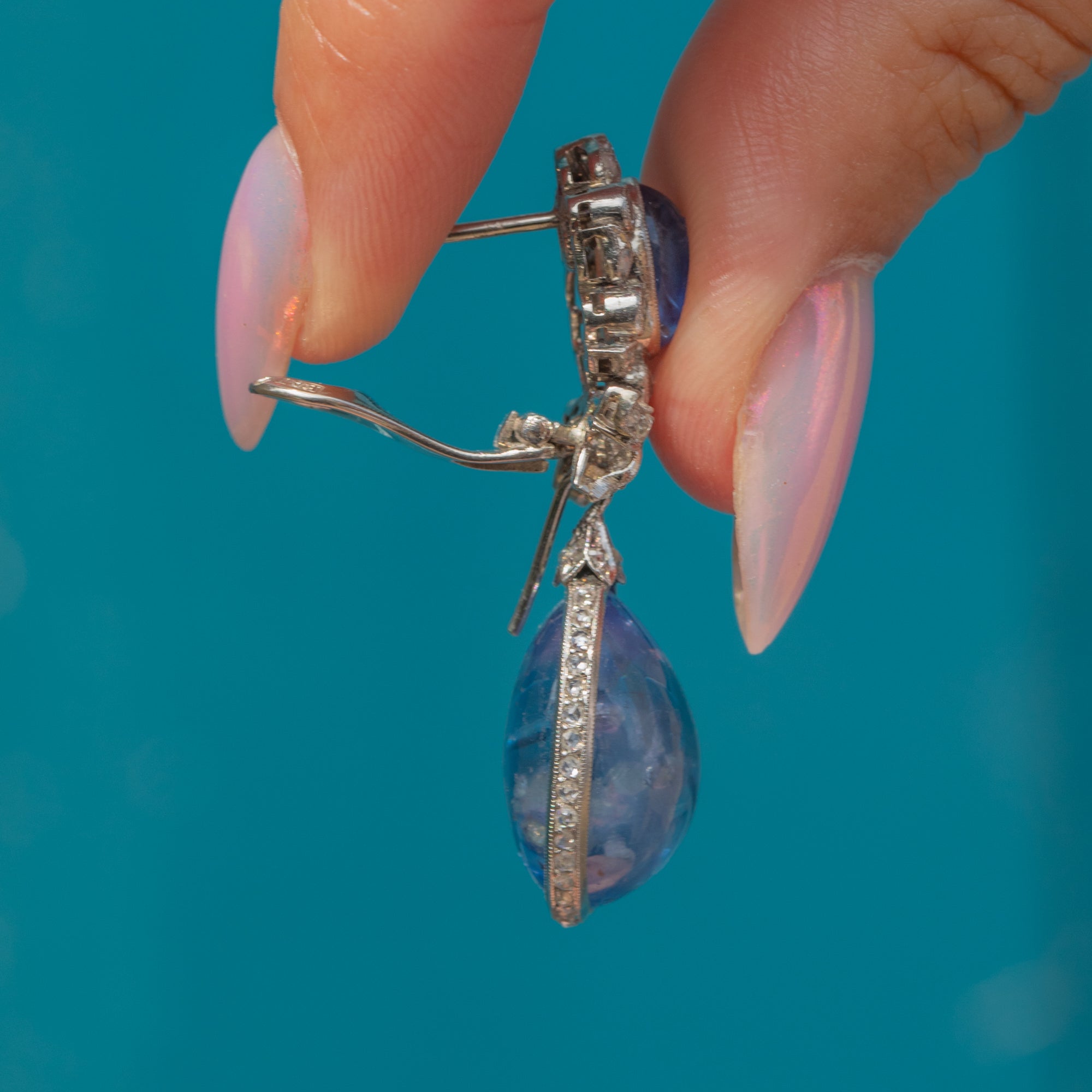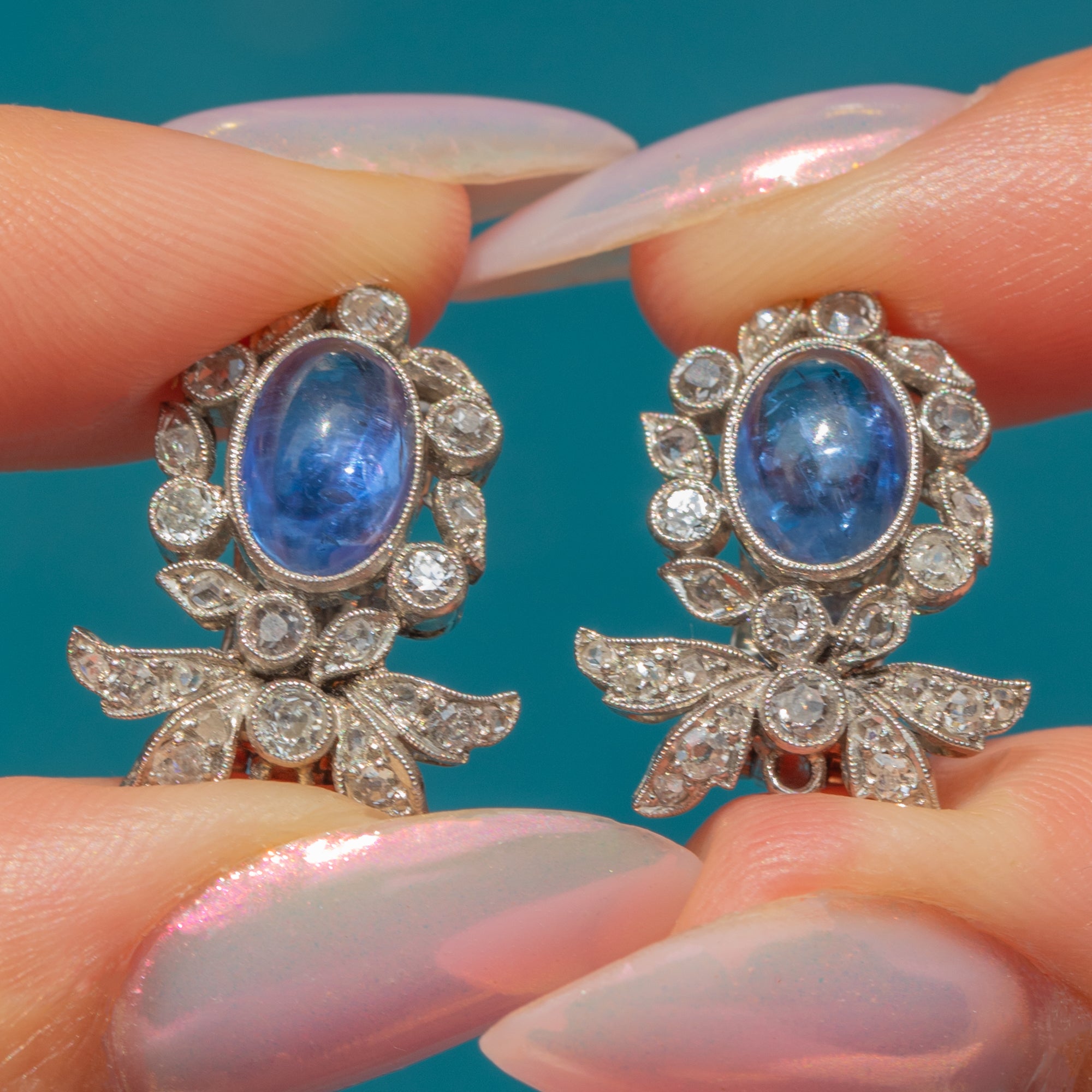 Suspended from each cluster is a detachable drop element, consisting of a large pear-shaped natural Sapphire cabochon, weighing a whopping 18.00ct each. These richly hued stones are surrounded by a finely set border of round brilliant-cut Diamonds, enhancing their colour and brilliance with a striking contrast. The Diamonds are precisely pavé-set to create a seamless halo effect, adding sparkle and dimension.