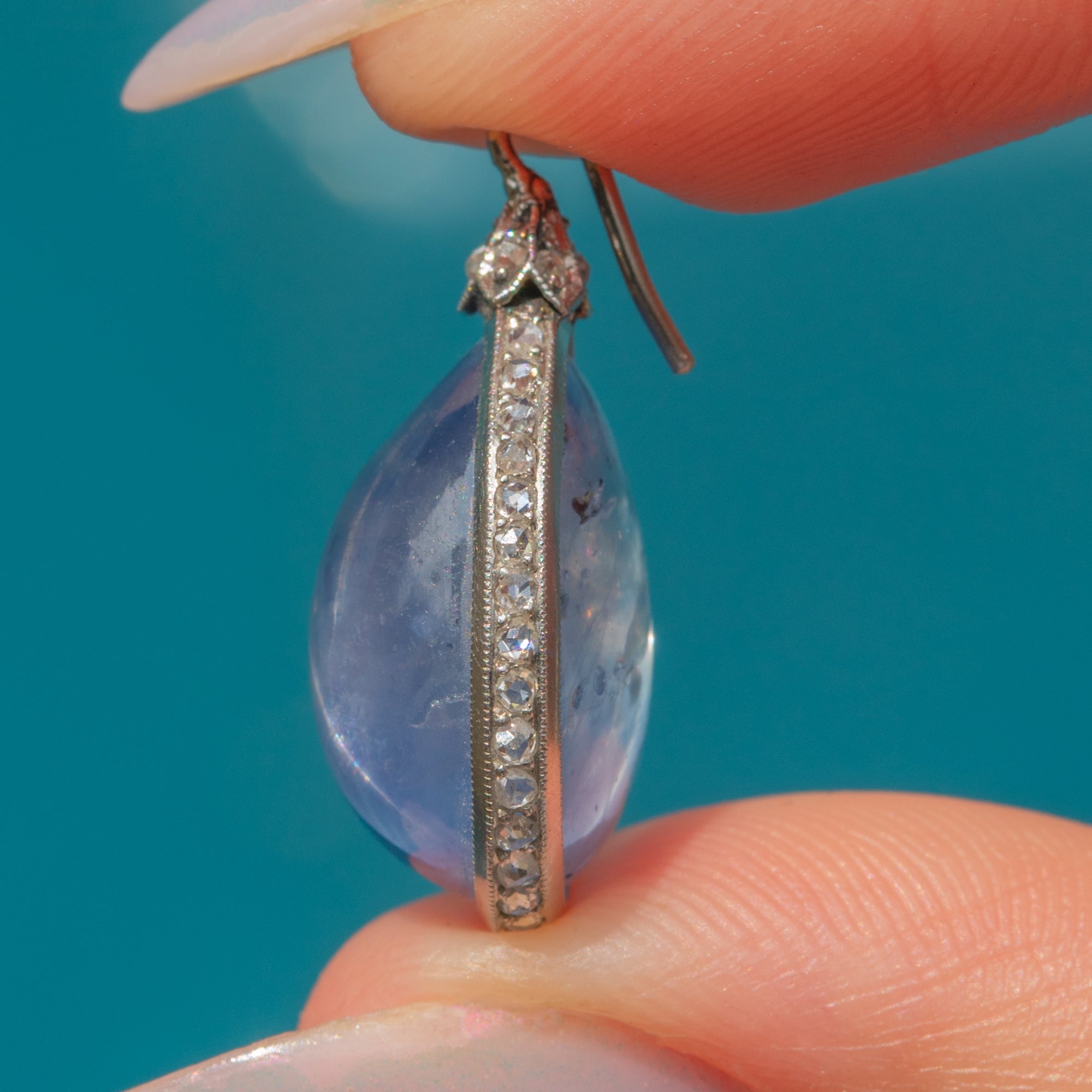 Pear Shaped detachable Sapphire is 15mm long x 12.5mm wide x 9mm deep, weighing approx 36.00ct combined.