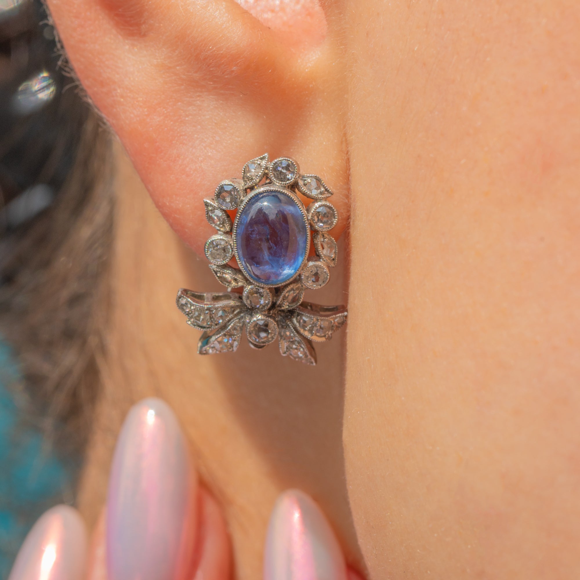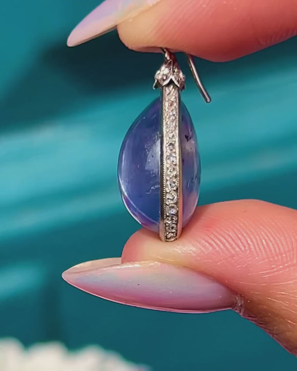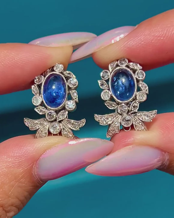 EXCELLENT: These 18ct Gold Natural Sapphire cabochon Diamond day & night earrings are presented in immaculate condition. The gemstones are all securely set and free from surface wear. Each component is firmly connected and the lever backs are in perfect working order, so you can wear these vintage Sapphire Diamond earrings with the utmost confidence!