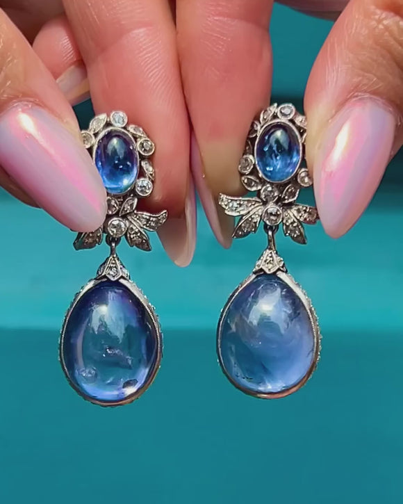 A stunning pair of 40.00ct 18ct Gold Natural Sapphire cabochon Diamond day & night earrings! Showcasing a captivating combination of natural cornflower Sapphires and Diamonds, designed for both versatility and elegance. Each earring features a meticulously arranged cluster of oval cabochon-cut Sapphires at the top, forming a bold yet refined focal point. These upper components are expertly crafted to be worn alone for a more understated daytime look.