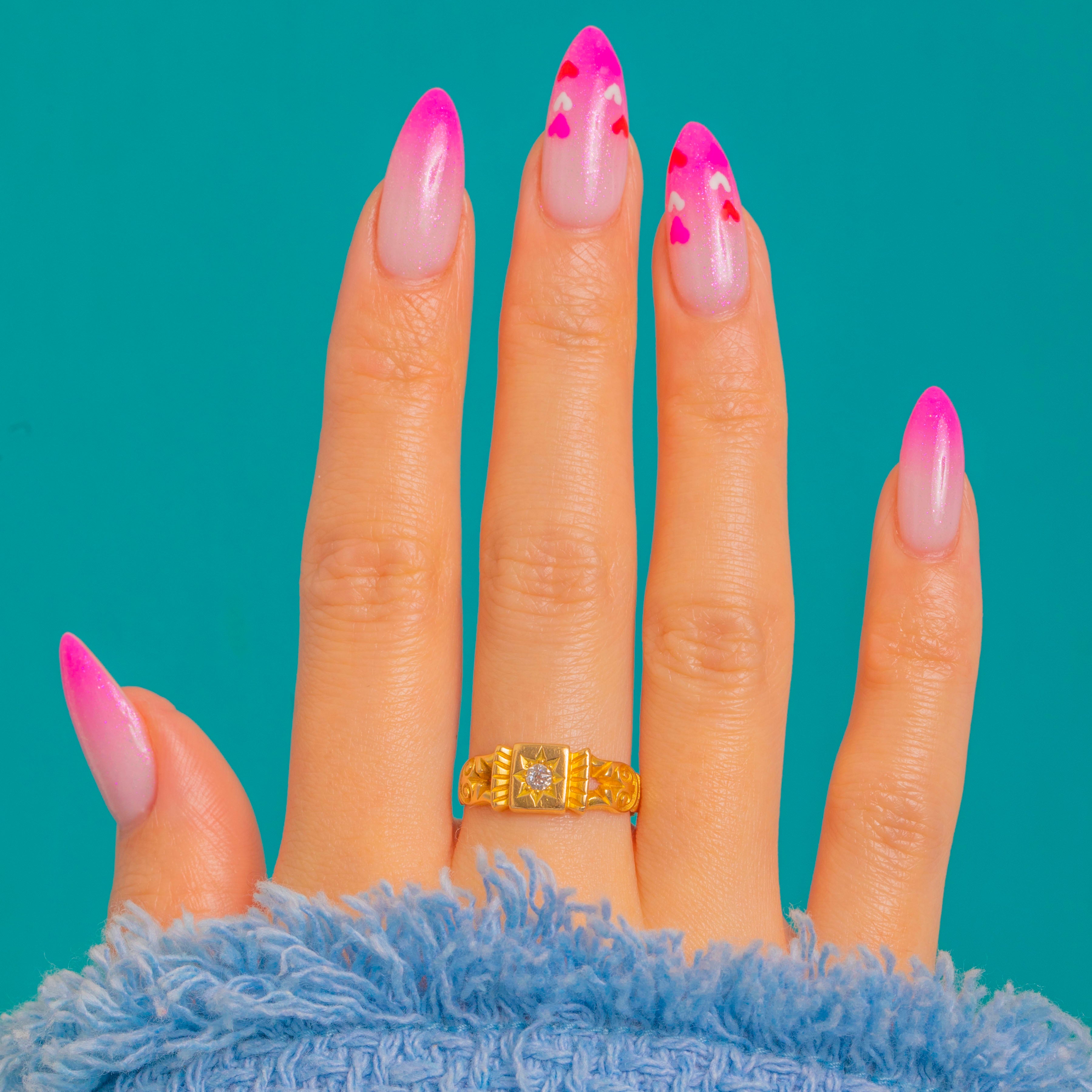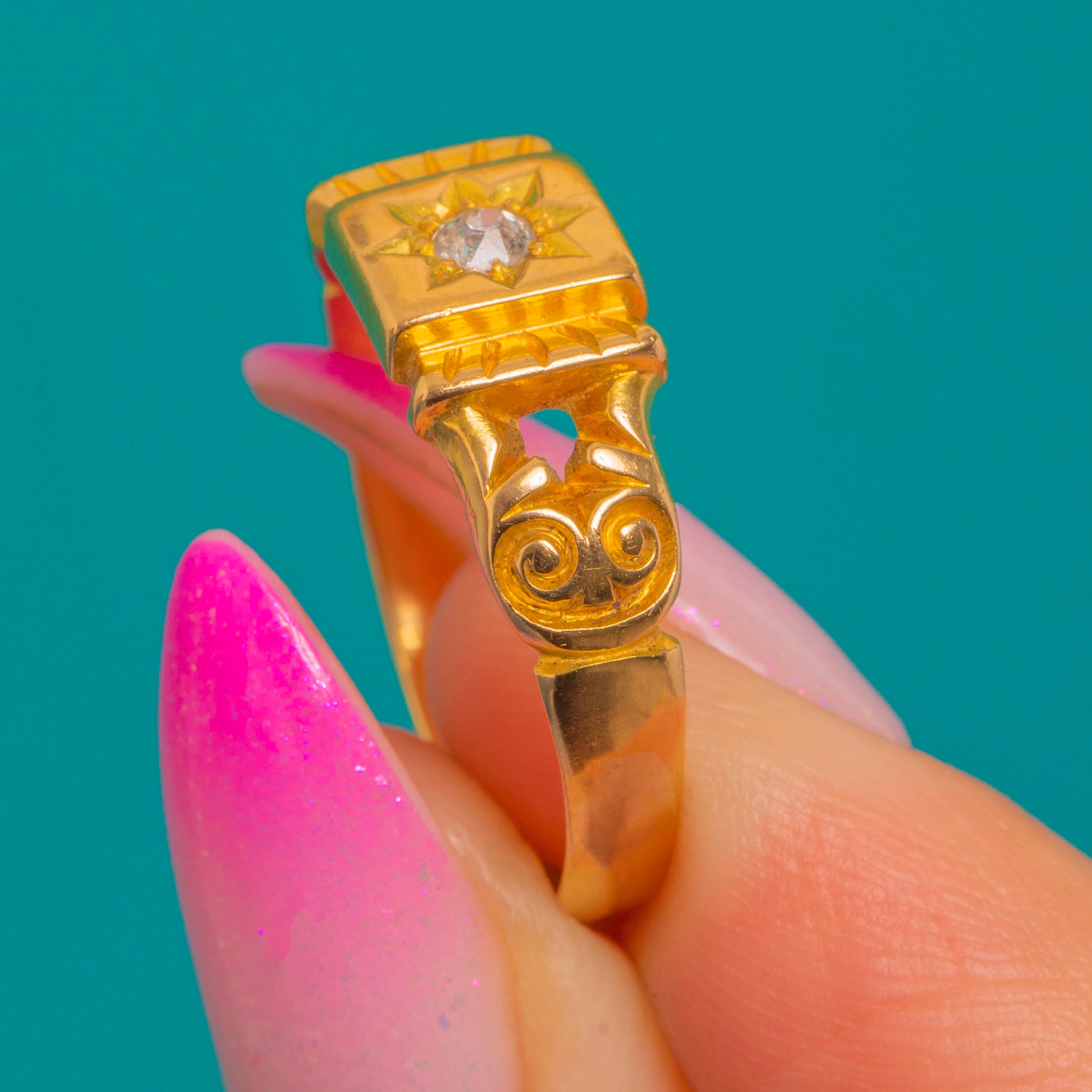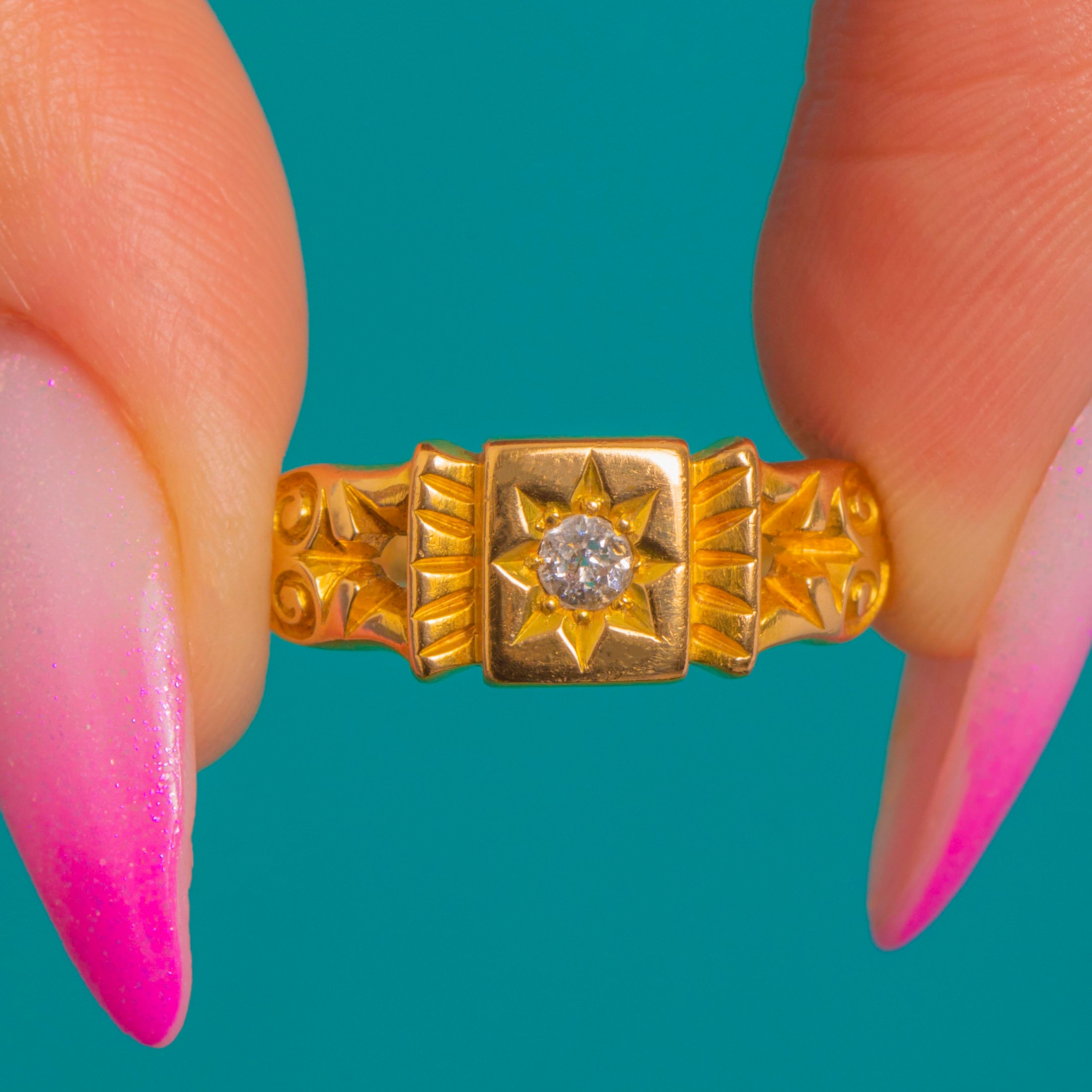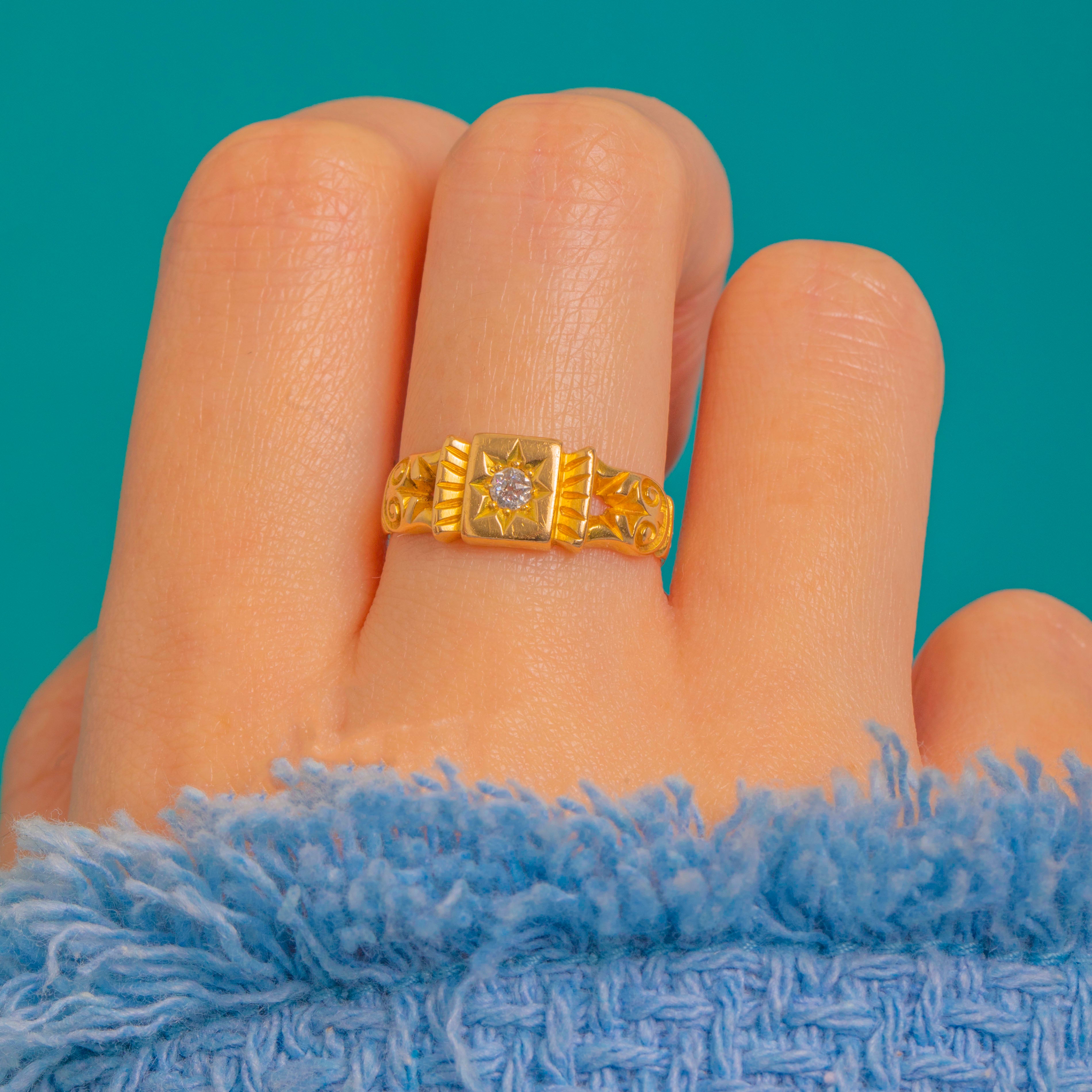 A charming star-set gypsy ring in rich 18ct Gold, crowned with a petite Old Mine Cut Diamond twinkling from an engraved starburst. The raised square tablet gives this piece a refined signet-like presence, while the fluted and scrolling foliate shoulders add ornate texture and depth.