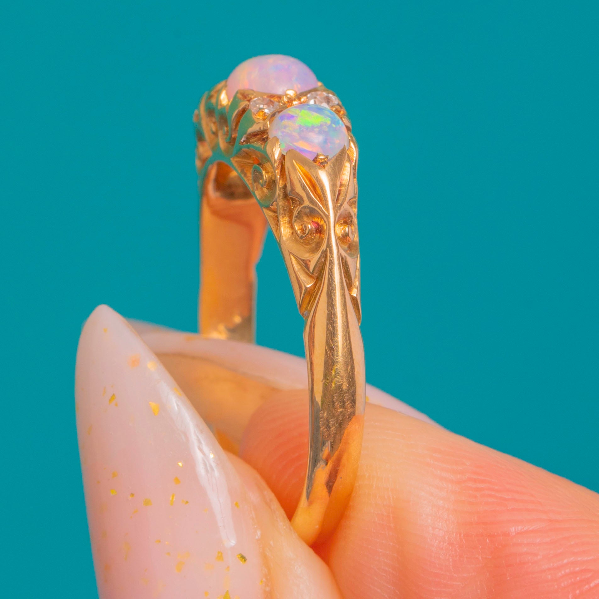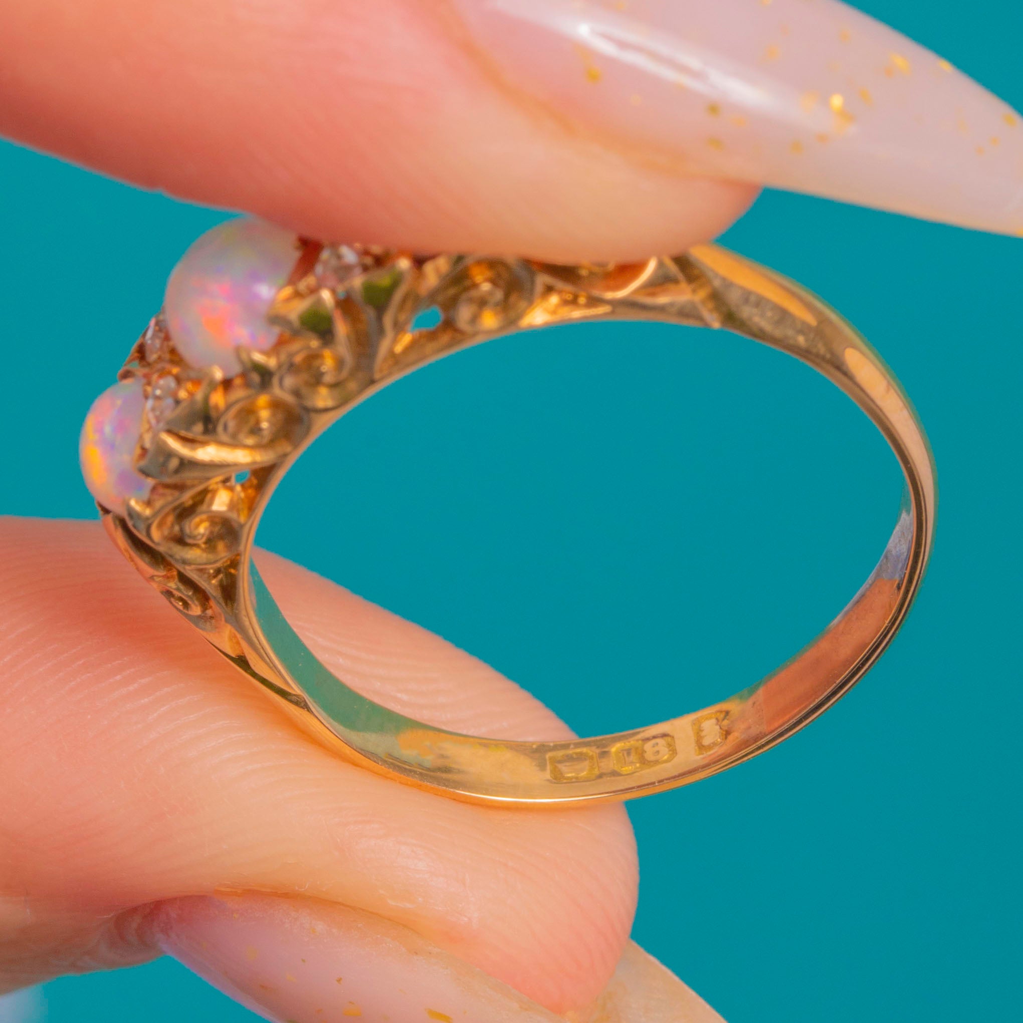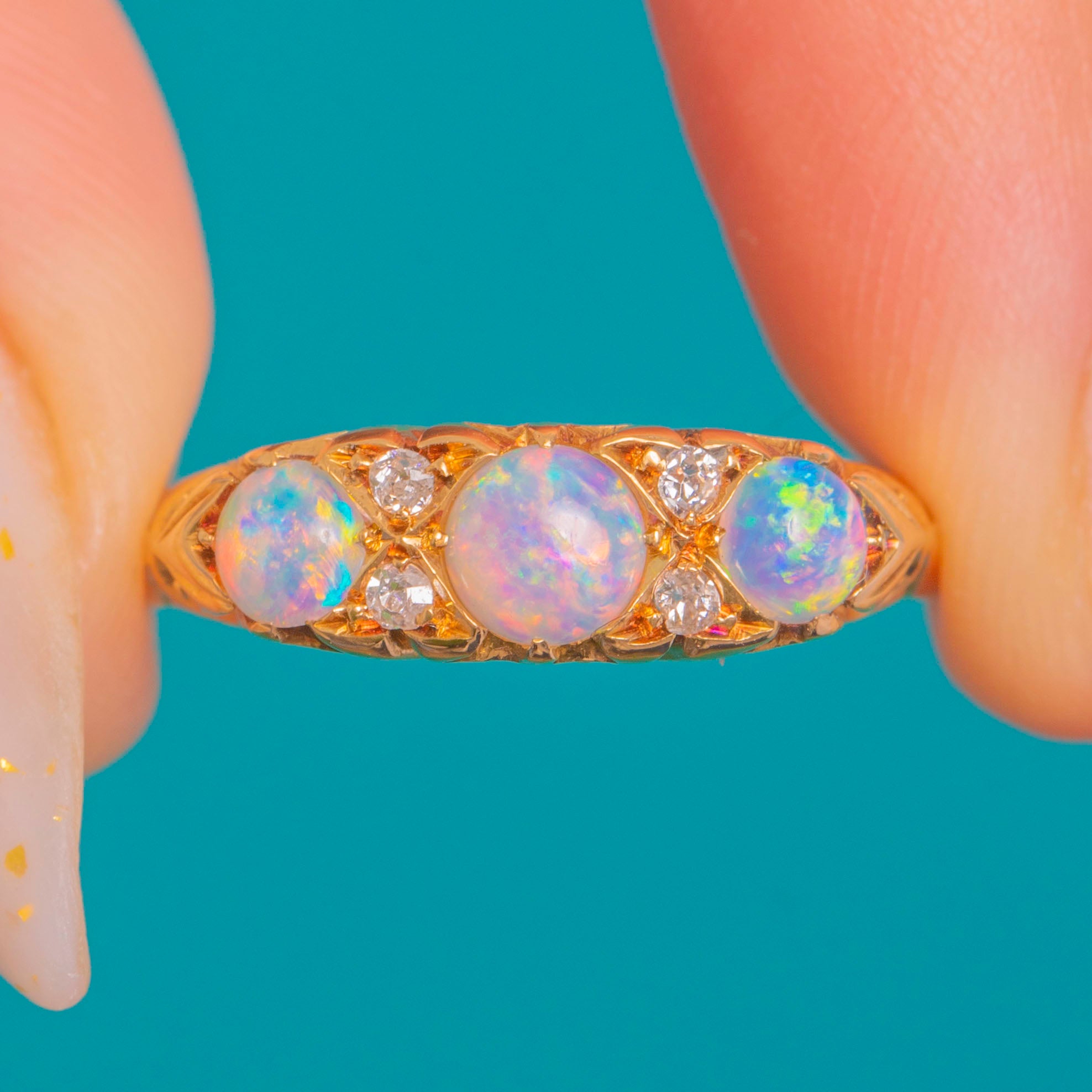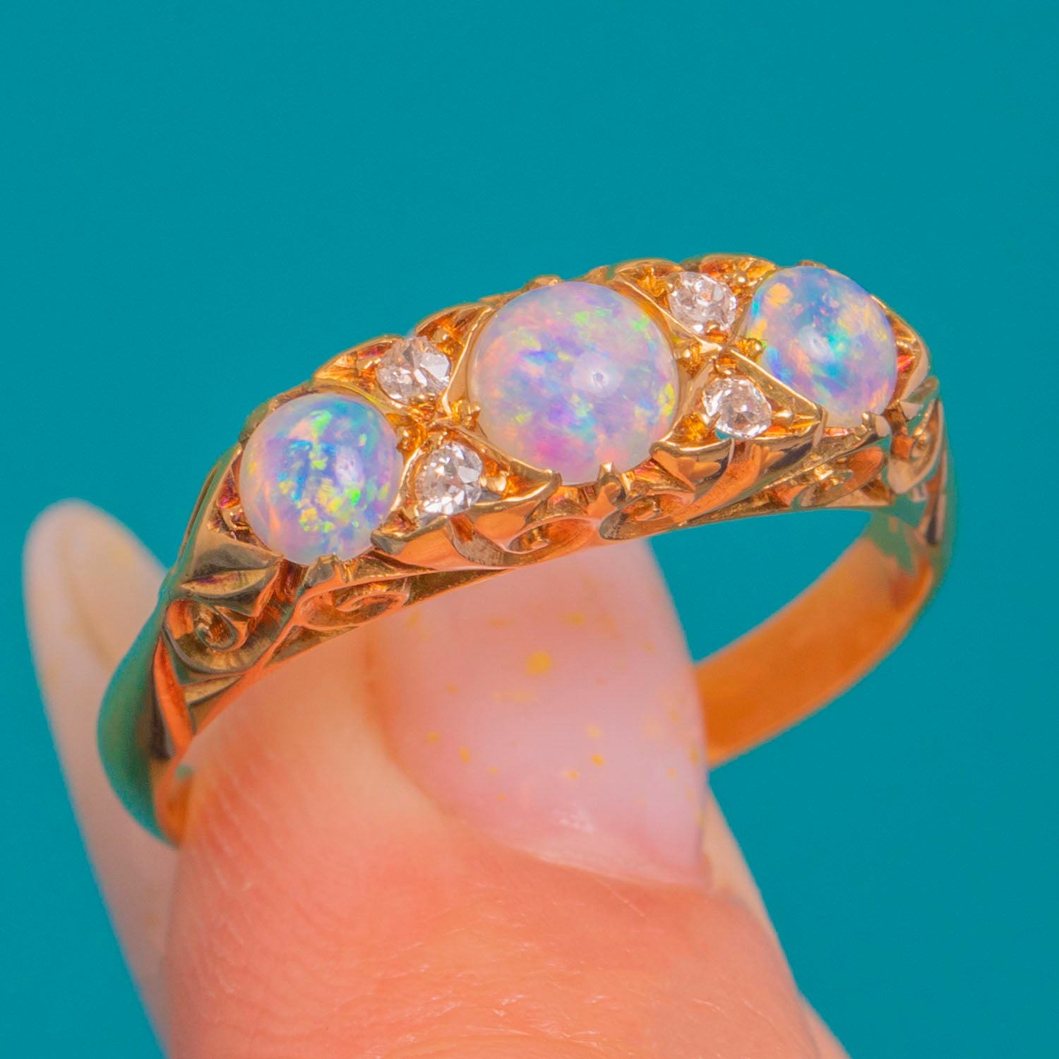 EXCELLENT: Opals are bright with lively play-of-colour and the Diamonds are crisp, with no obvious chips or abrasions. The carved settings and pierced gallery remain sharp and well defined. The shank shows only light surface wear and fine scratches consistent with age, with no visible resizing or repairs; settings are secure.