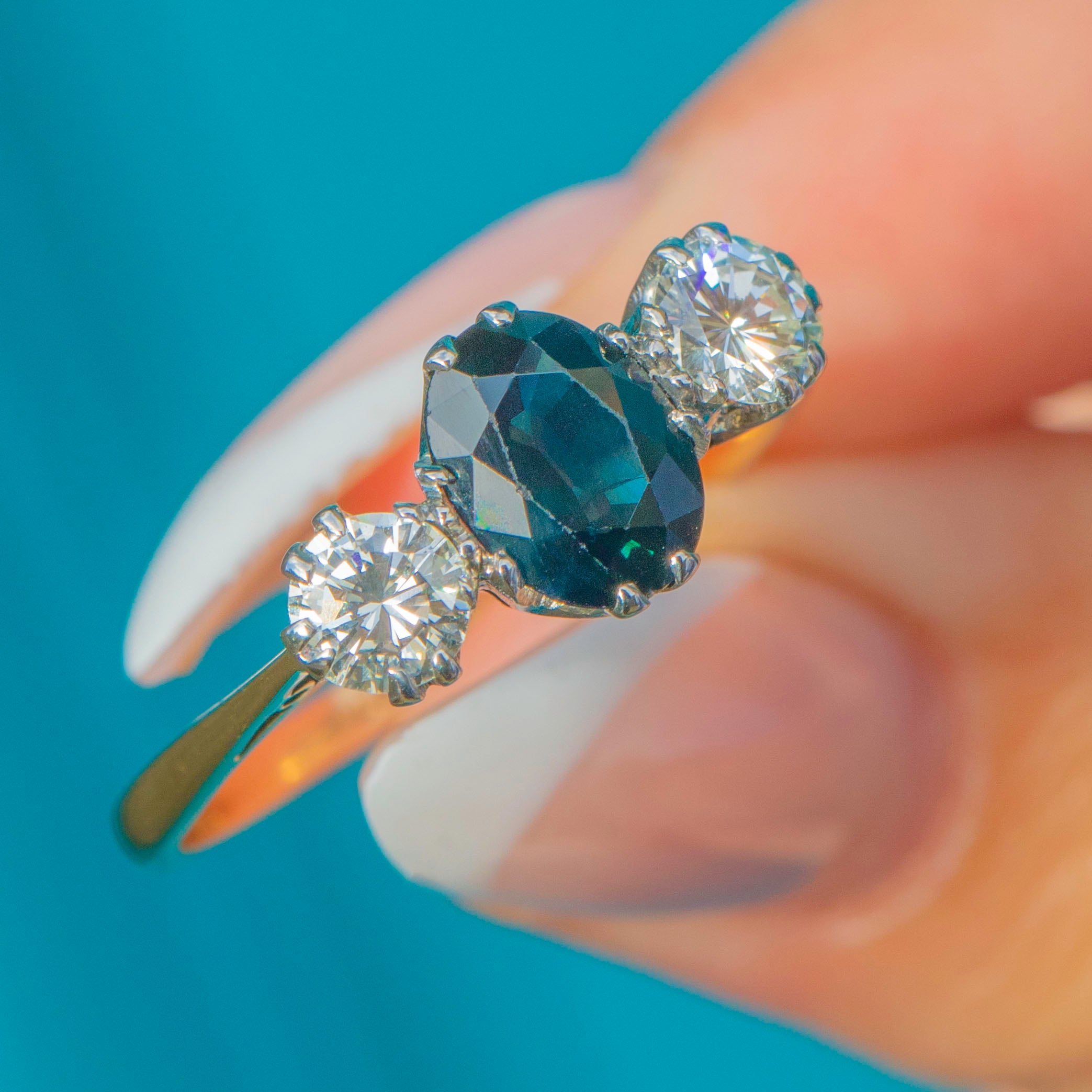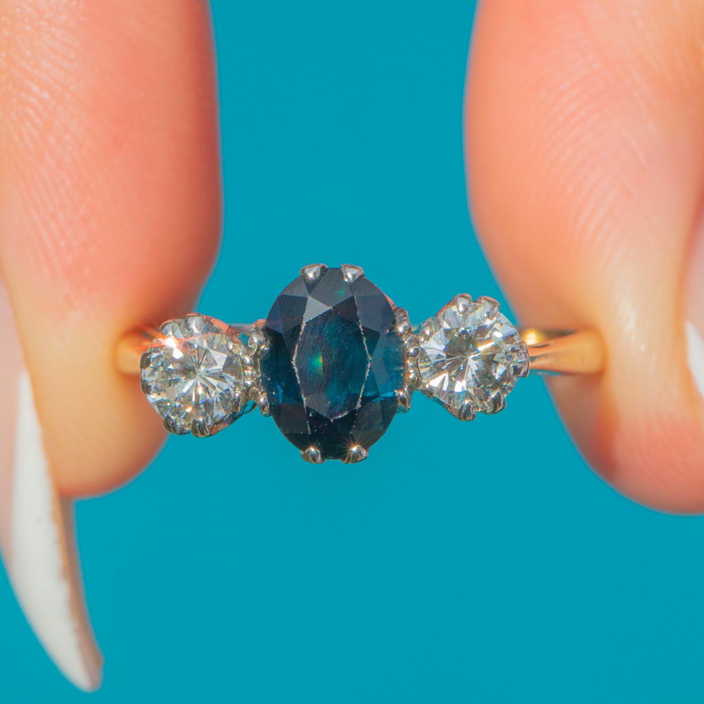 This exquisite trilogy ring is set with a rich deep blue natural Sapphire flanked by two dazzling brilliant-cut Diamonds. The central oval Sapphire offers an intense velvety blue hue, perfectly complemented by the crisp sparkle of the Diamonds, which are graded bright white D–F colour and VS–VVS clarity.