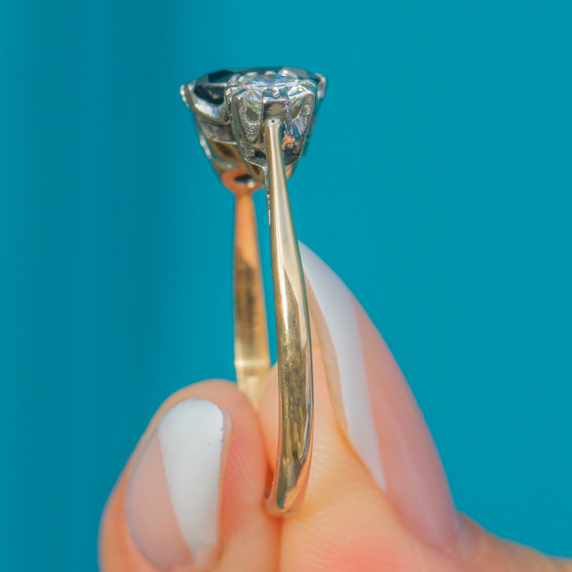 Crafted in 18ct Gold with Platinum settings, this Art Deco ring has a timeless appeal that makes it a classic choice for an engagement ring, representing the past, present, and future of your relationship.
