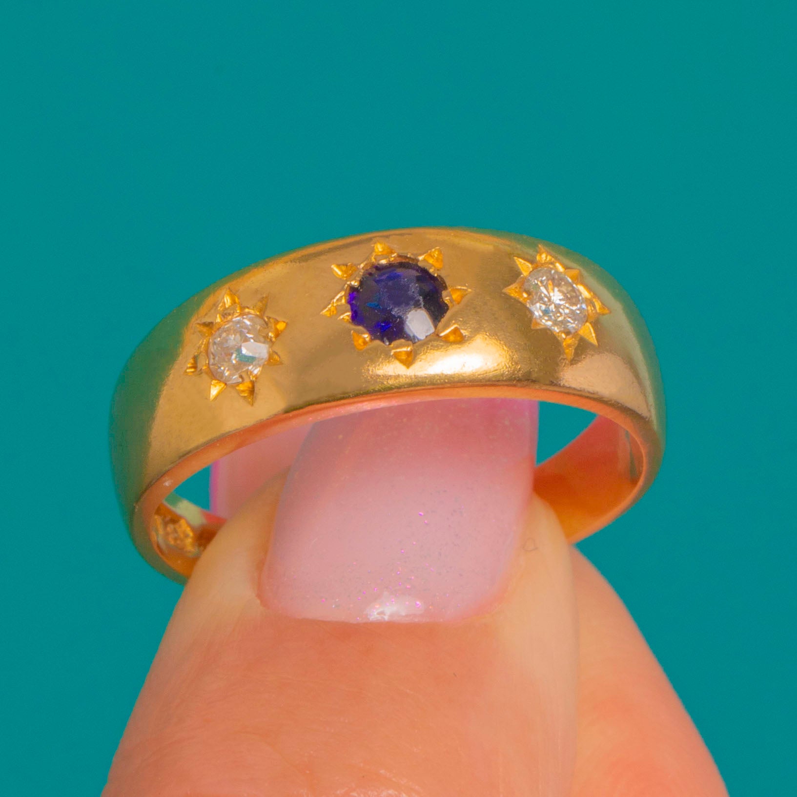 A classic Victorian treasure, this star-set gypsy ring is crafted in rich 18ct Gold and punctuated by a midnight-blue Sapphire flanked by two bright Diamonds. The low, flush settings and engraved eight-point stars lend a celestial shimmer that feels both refined and effortlessly wearable.