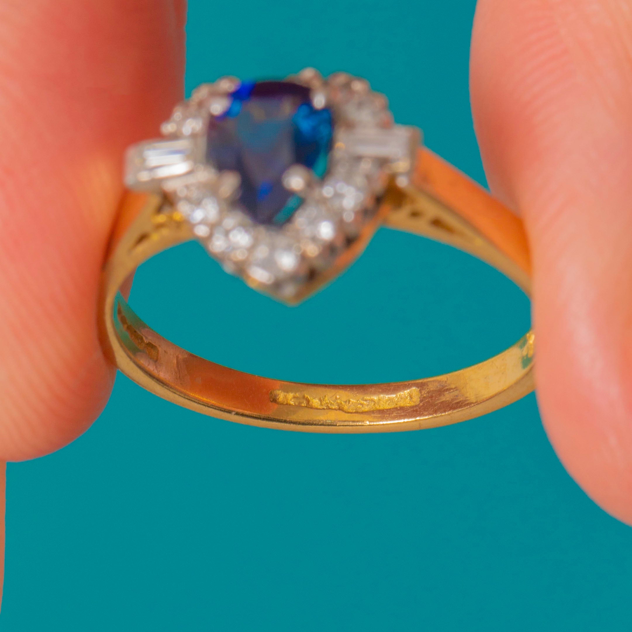 A charming 18ct Gold vintage pear cut natural Sapphire ring, haloed by a cluster of scintillating bright Diamonds akin to a starry night sky!
