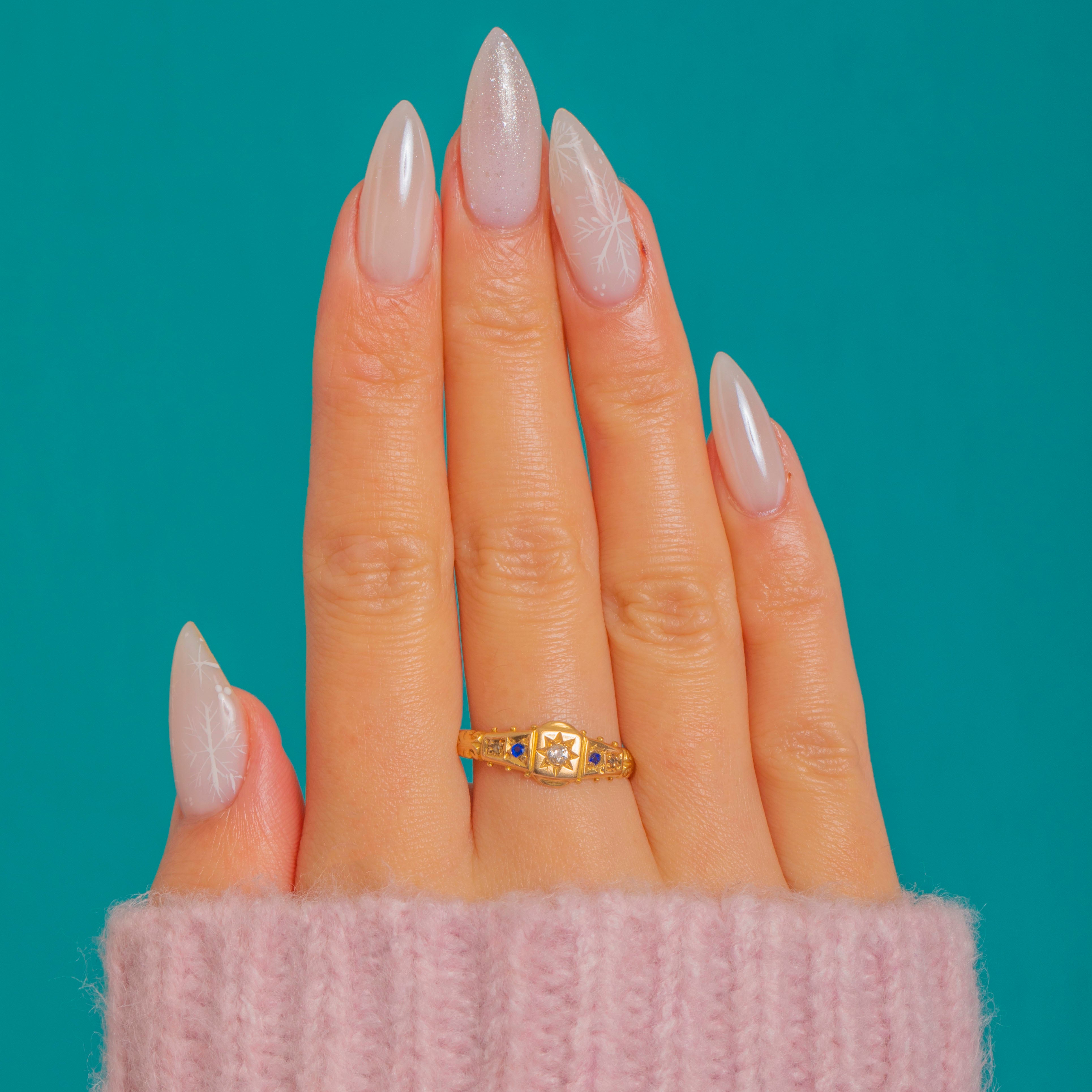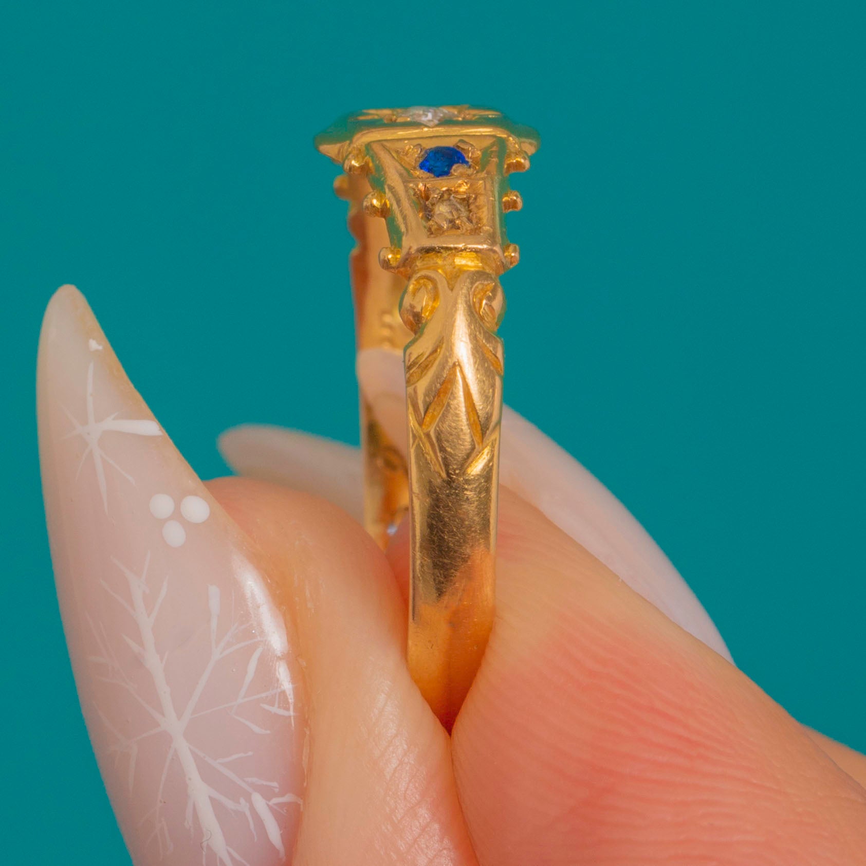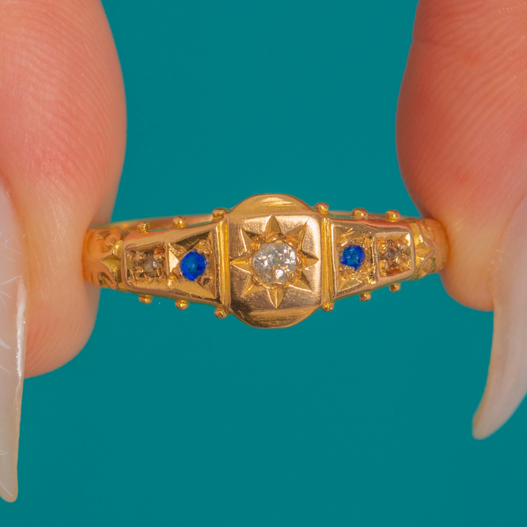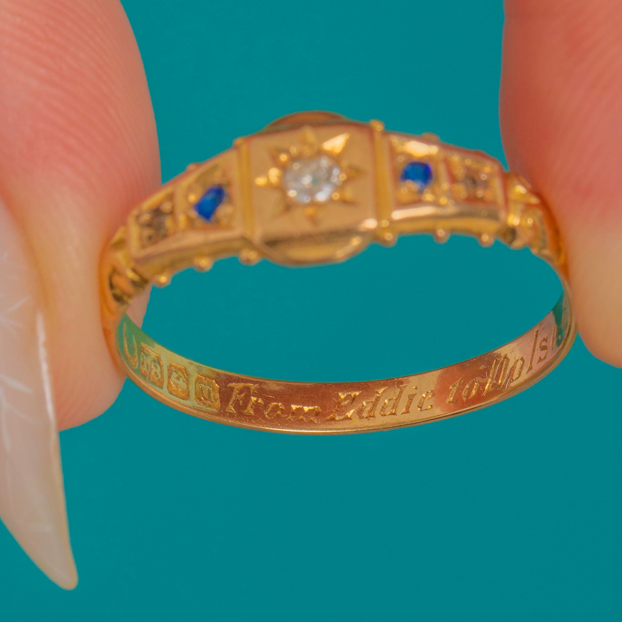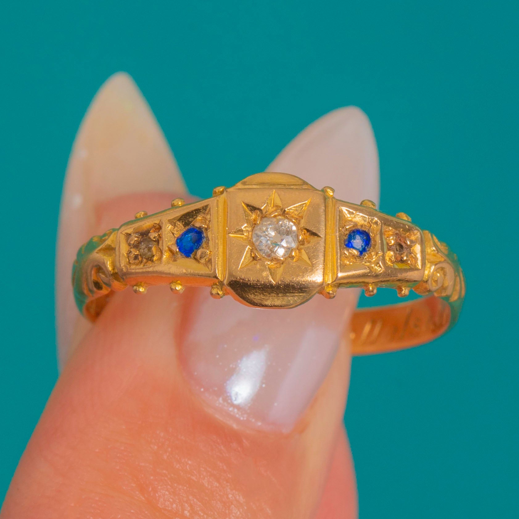 EXCELLENT: The Diamond and Sapphires are securely set and show only minimal age-related wear. The 18ct Gold band is in excellent condition with crisp engraving and star detailing still clearly defined. Overall, this ring has been exceptionally well cared for.