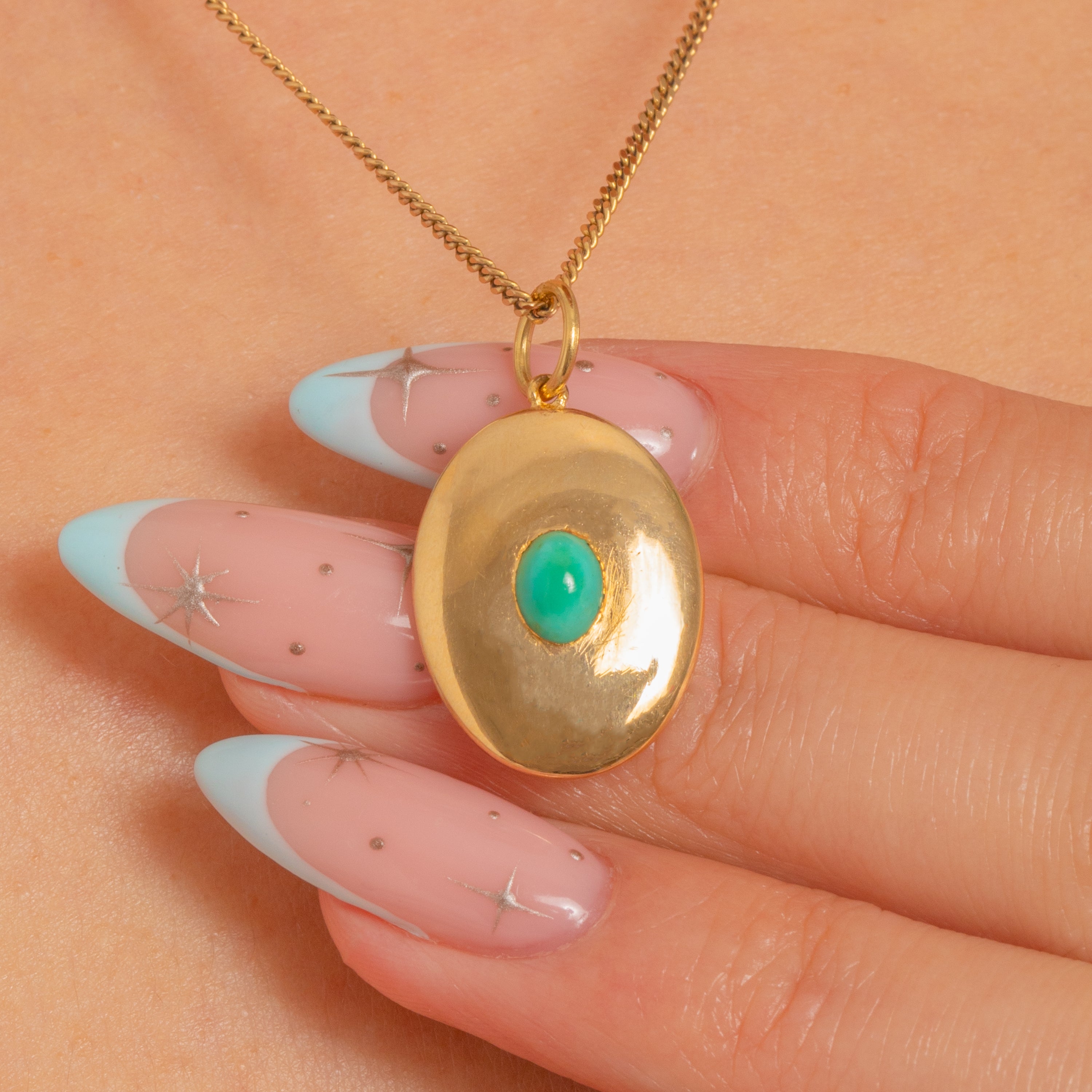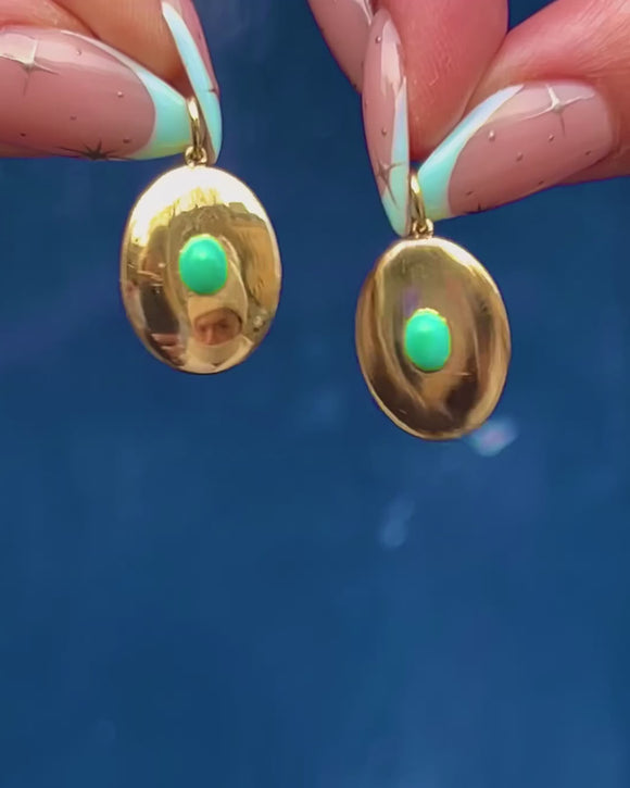 A refined Victorian disc charm in rich 18ct Gold, set with a single Turquoise cabochon at its heart. The domed oval plaque and smooth flush setting create a serene “bullseye” focus, letting the blue‑green Turquoise glow against the high‑polish Gold.