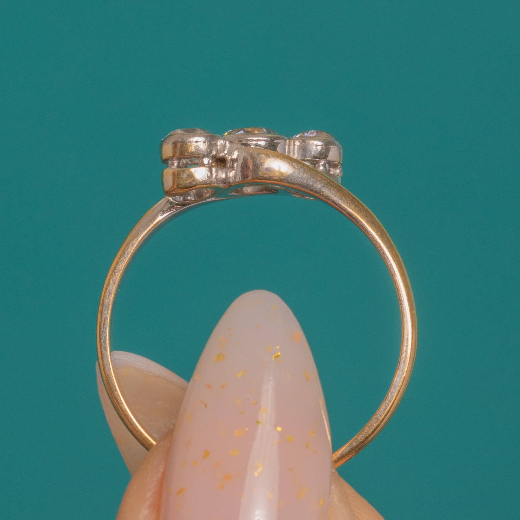 A refined Art Deco Diamond trilogy crossover ring, crafted in two-tone 18ct Gold with Platinum settings. Three bright Diamonds glide in a gentle S-curve across the finger, each secured in fine milgrained rubover collets with open backs and a beautifully pierced under-gallery. With a low, graceful profile and flowing crossover shoulders, it’s an elegant study in balance and light, offering approximately 0.45cts of scintillation.