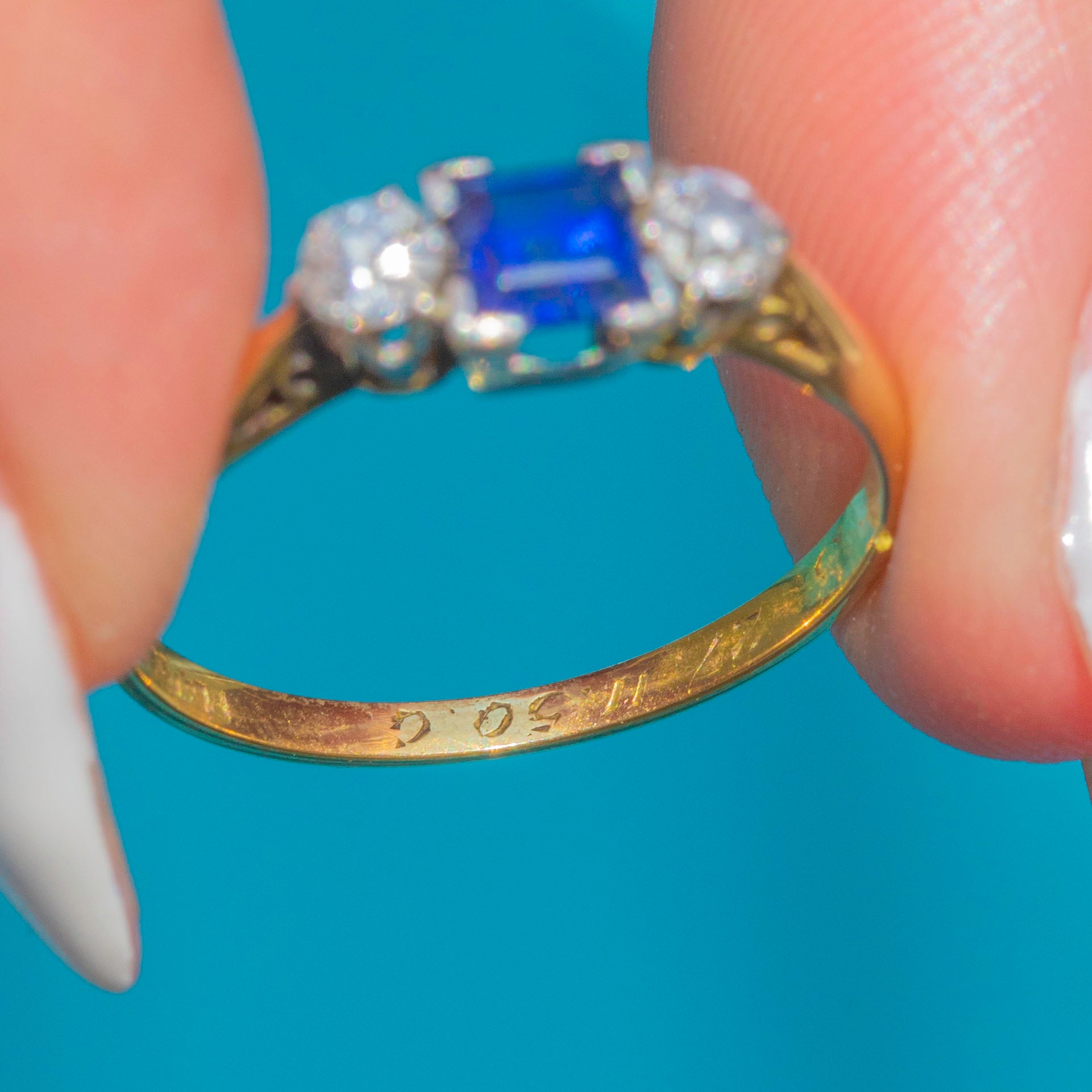 This charming Art Deco 18ct Gold trilogy ring is set with a vivid square-cut Sapphire flanked by two sparkling round brilliant-cut Diamonds.