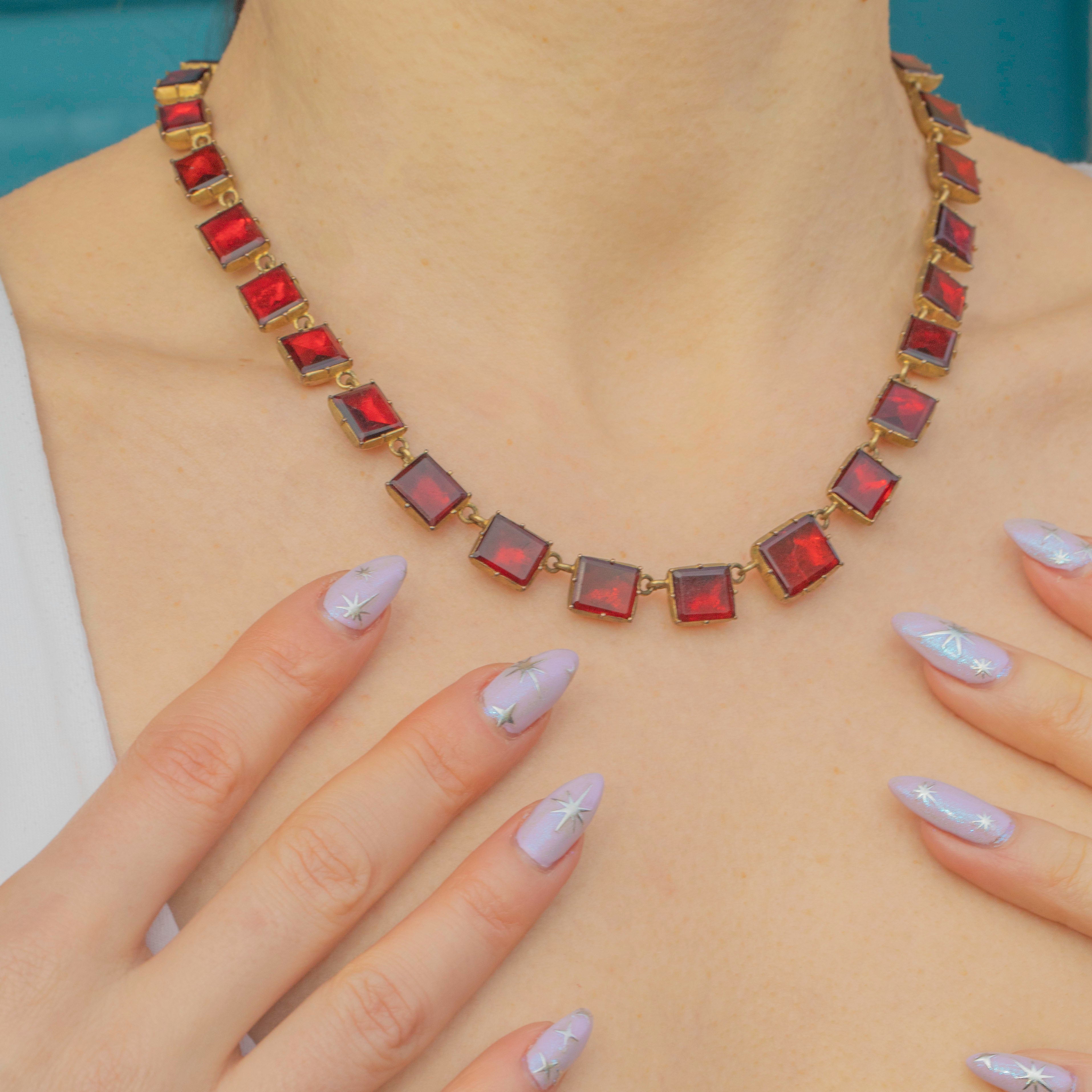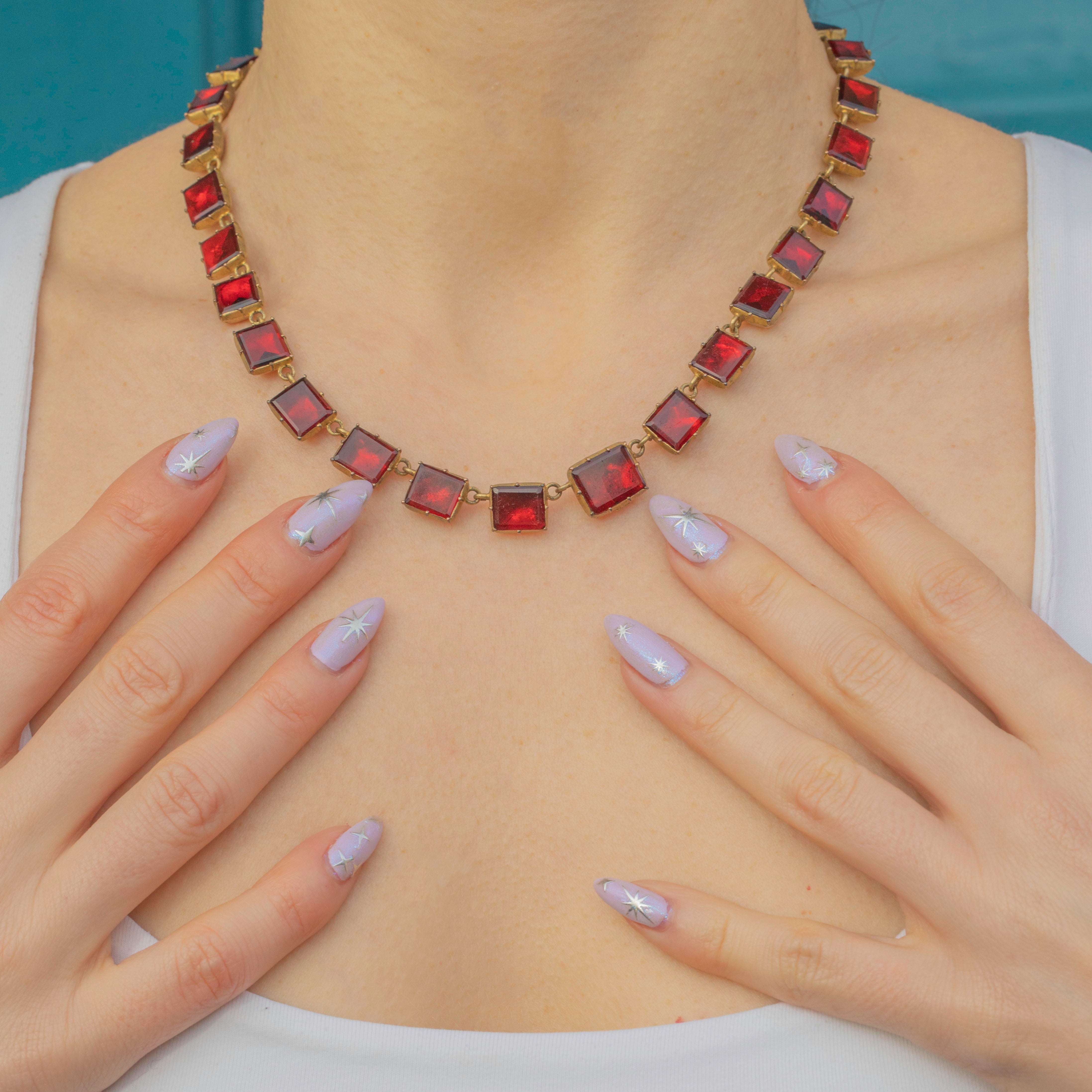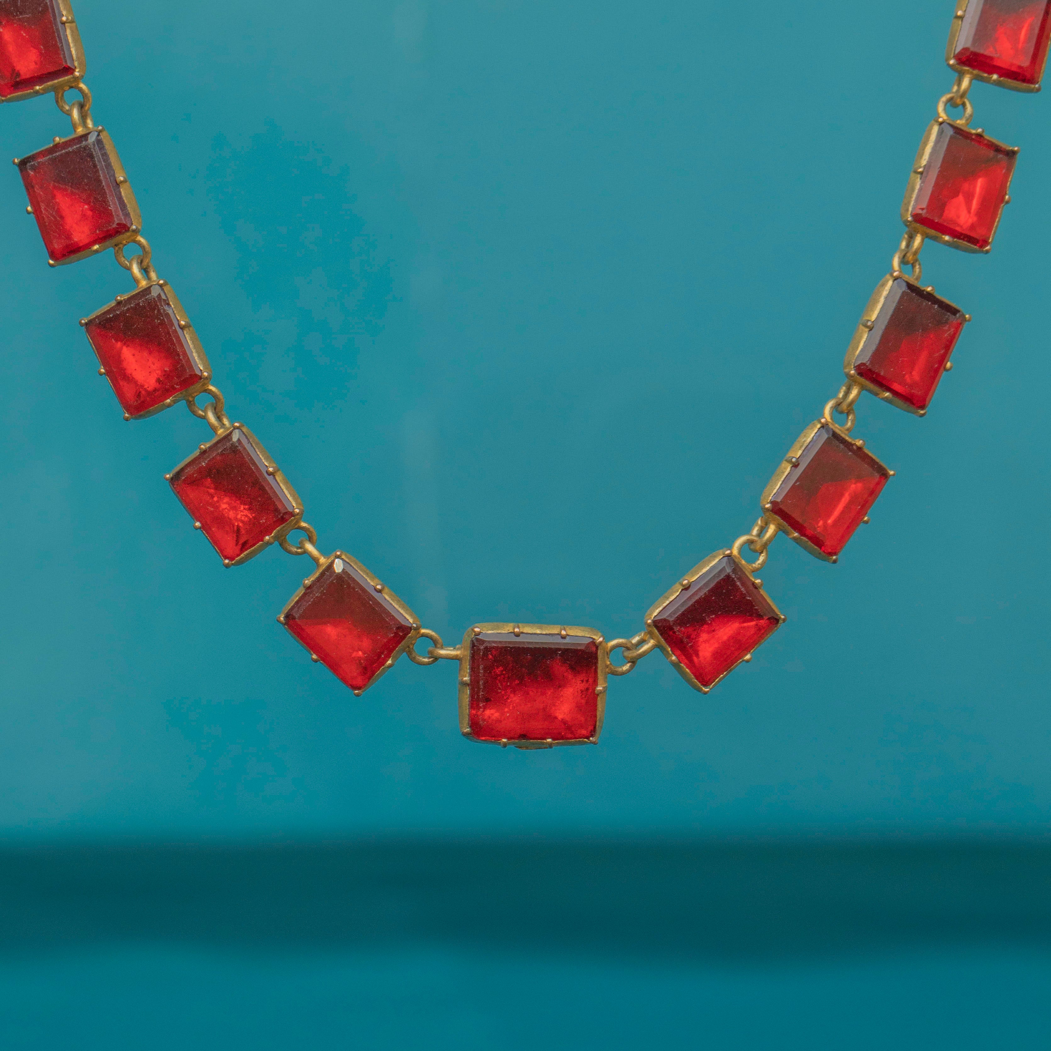 This 18th Century Georgian red Paste Riviere necklace is a glorious testimony to the era from which she was created! Each masterfully cut Paste gemstone holds the key to our hearts, with their the deep red tones, sultry and seductive, shimmering beautifully as they catch the light!