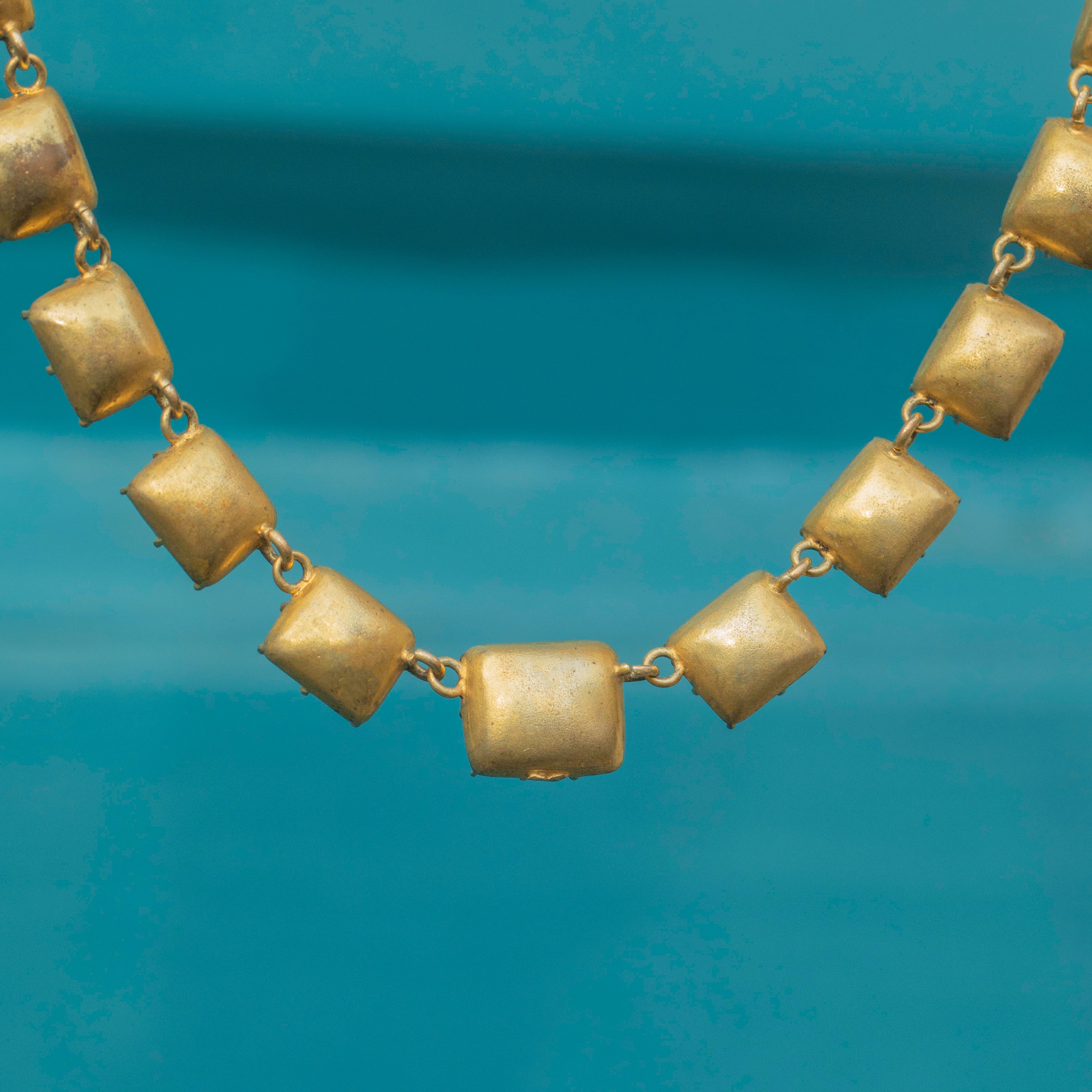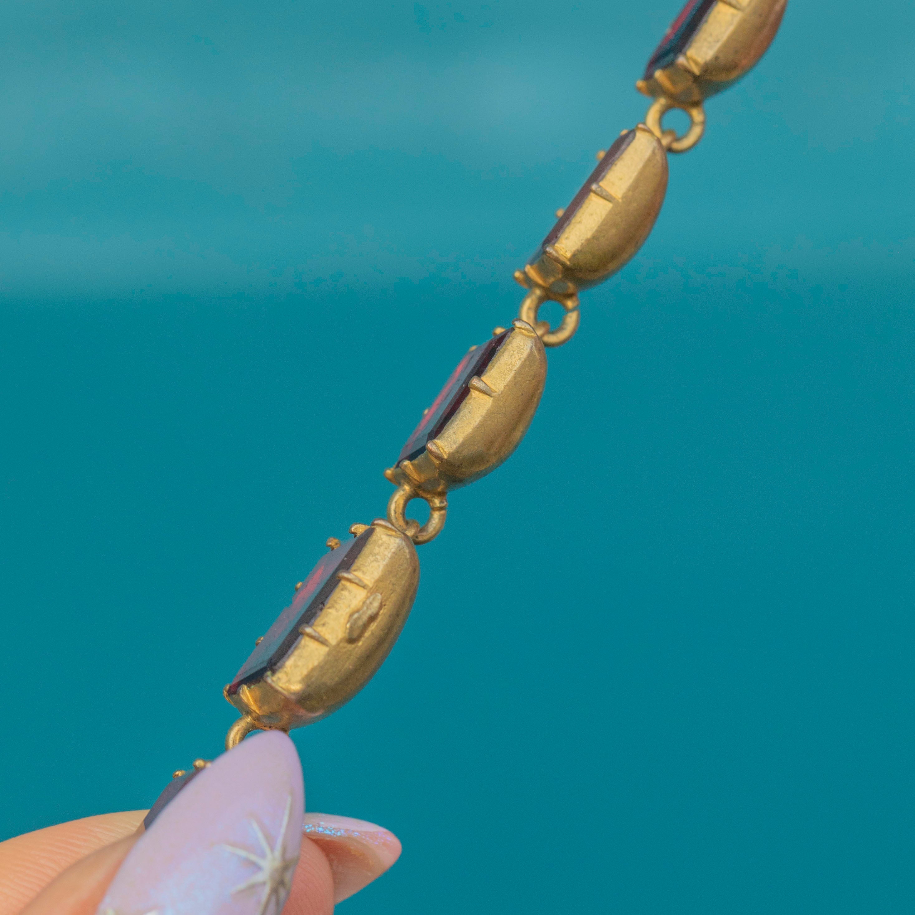 The Pinchbeck looks stunning against the blood-red gems and will rest elegantly across your clavicle, perfectly accentuating your neckline. Giving you the option to wear her either way around, you could turn this necklace over and display a row of smooth domes instead!