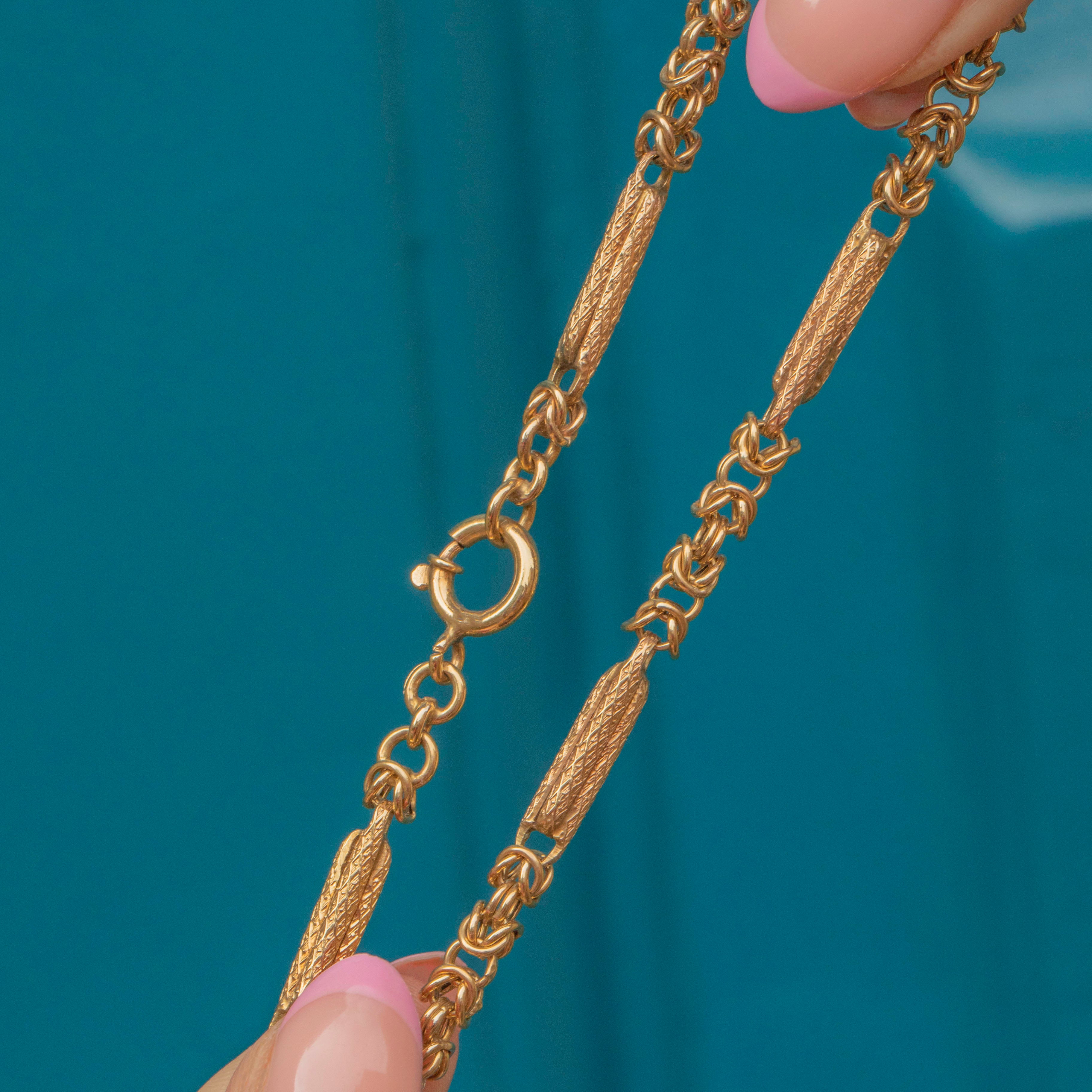 This exquisite antique 9ct Gold fancy link chain features smooth and densely textured Byzantine-style links interspersed with buttery and bright knotted links with a generous 19.5" drape! The lozenge-shaped links are carefully interwoven, creating a textured and elegant design.
