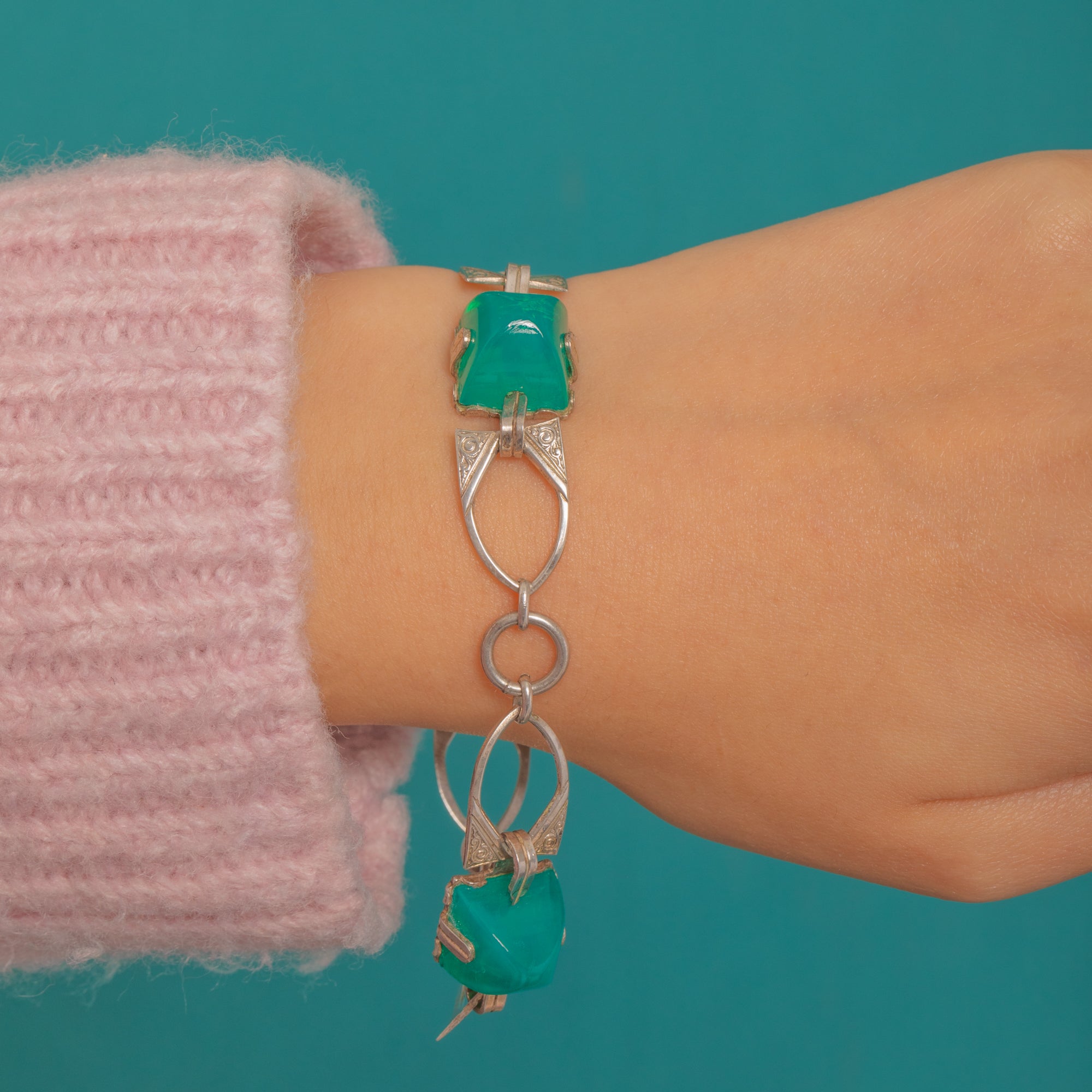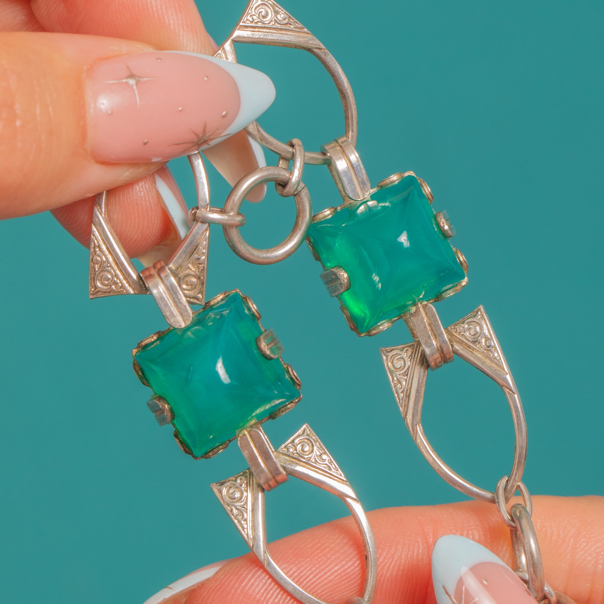 A bold, streamlined bracelet from the late Art Deco era, crafted in Sterling Silver and set with vivid Green Paste sugarloaves that emulate the lush glow of Chrysoprase. The high-domed, clipped-corner tablets sit in geometric mounts and alternate with open navette links and engraved triangular plaques, creating crisp architectural rhythm and beautiful articulation on the wrist.