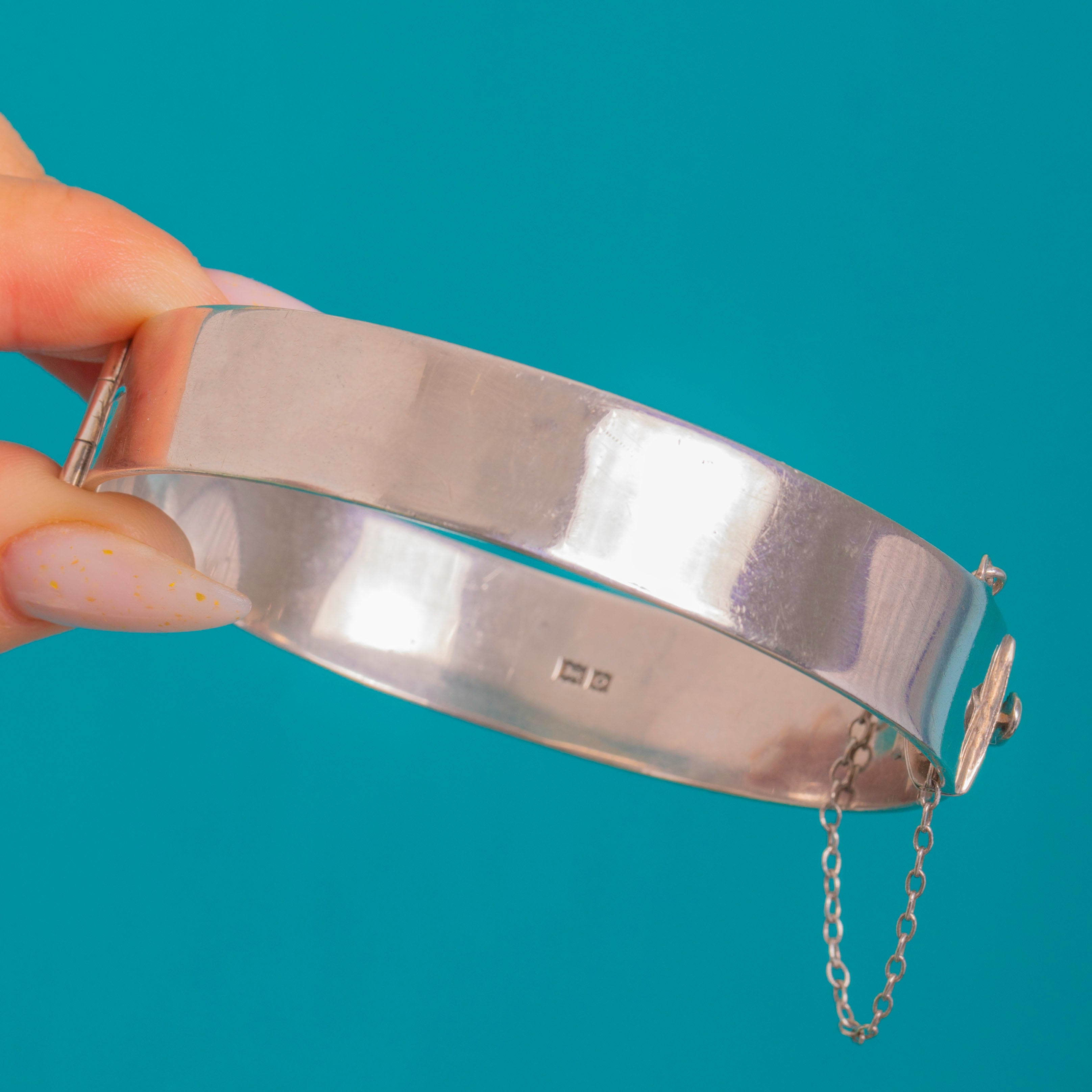 Elegantly engraved and wonderfully wearable, this 1960s Sterling Silver hinged bangle showcases crisp bright-cut foliate and scroll arabesques that shimmer against its polished ground. The decoration is sharp and refined, framed by smooth edges for a sleek, timeless silhouette.