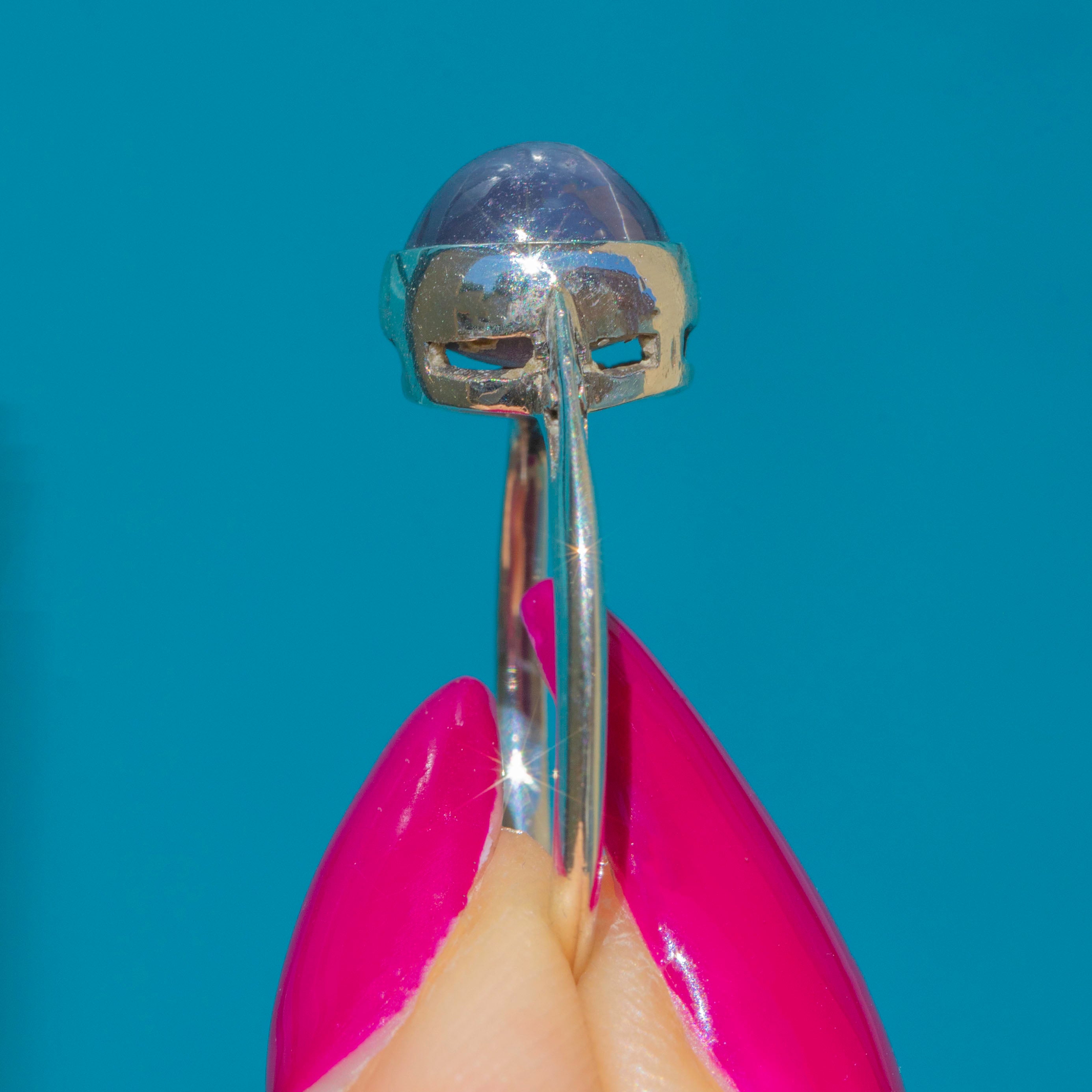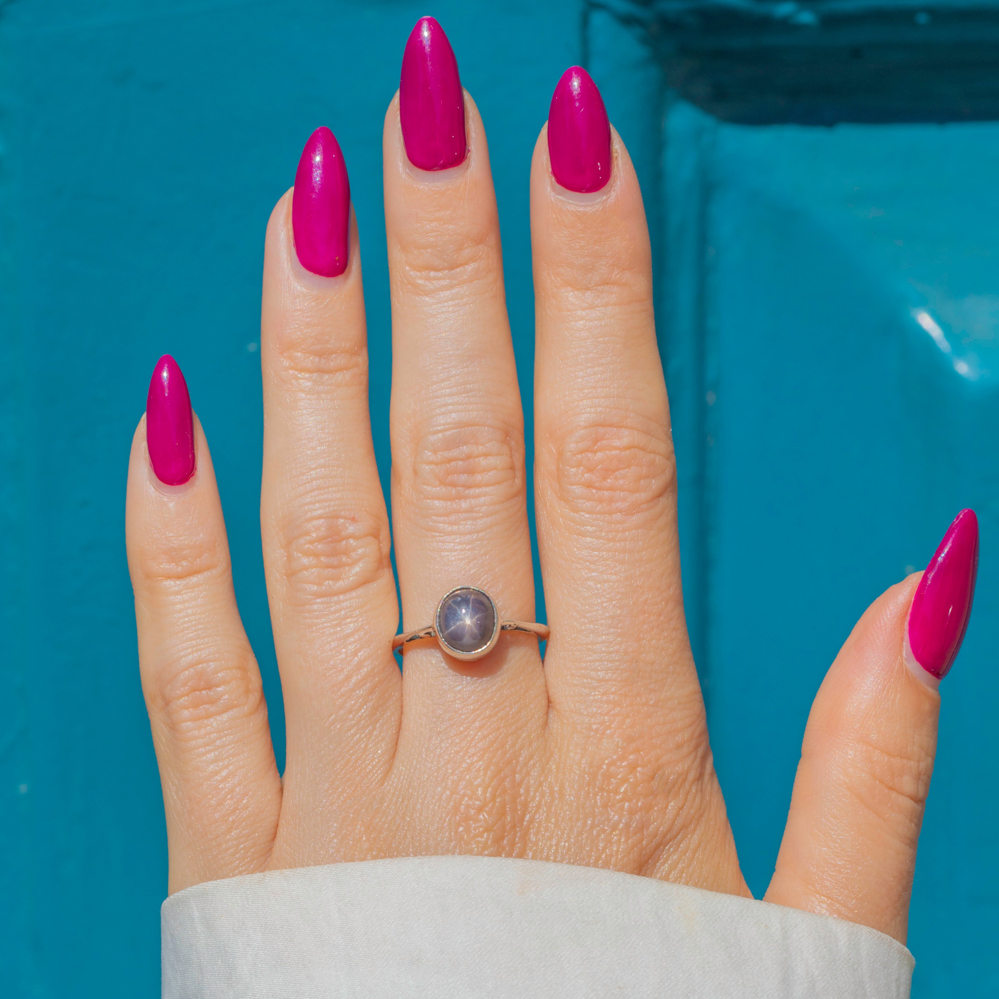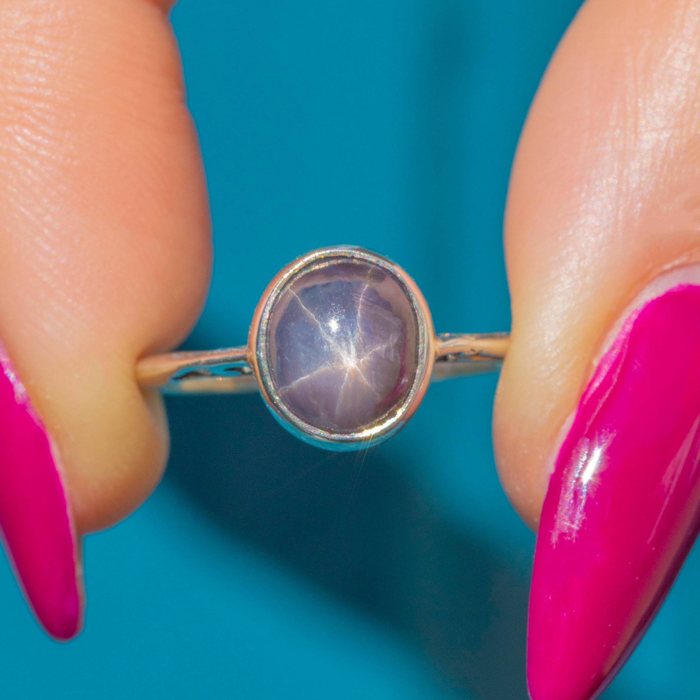 This vintage solitaire ring projects a gorgeous deep lavender hue radiating from its domed cabochon Star Sapphire, with the crisp and strong asterism of the gemstone truly stealing the show as it catches the light.