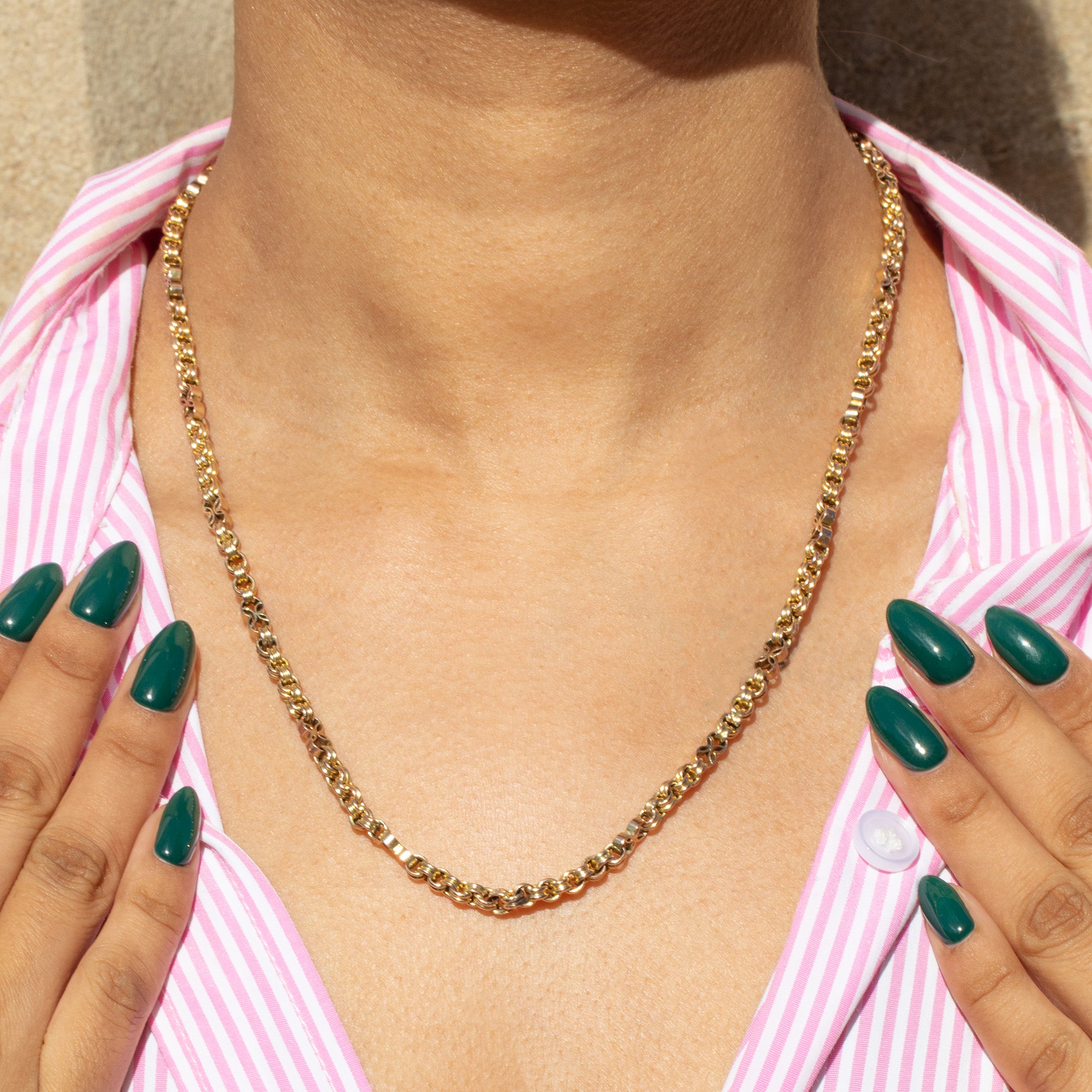 This fancy linked treasure is certainly no exception! Her links, a mix of chunky belcher links and hand-made floral terminals, are kissed with a beautiful glossy golden hue and will cascade across your collarbones with elegance. And let's not forget her two matching dog clips, a rare find within the world of antiques! Simply pair this Victorian Gold chain with a crisp white t-shirt for an instant dose of luxury.