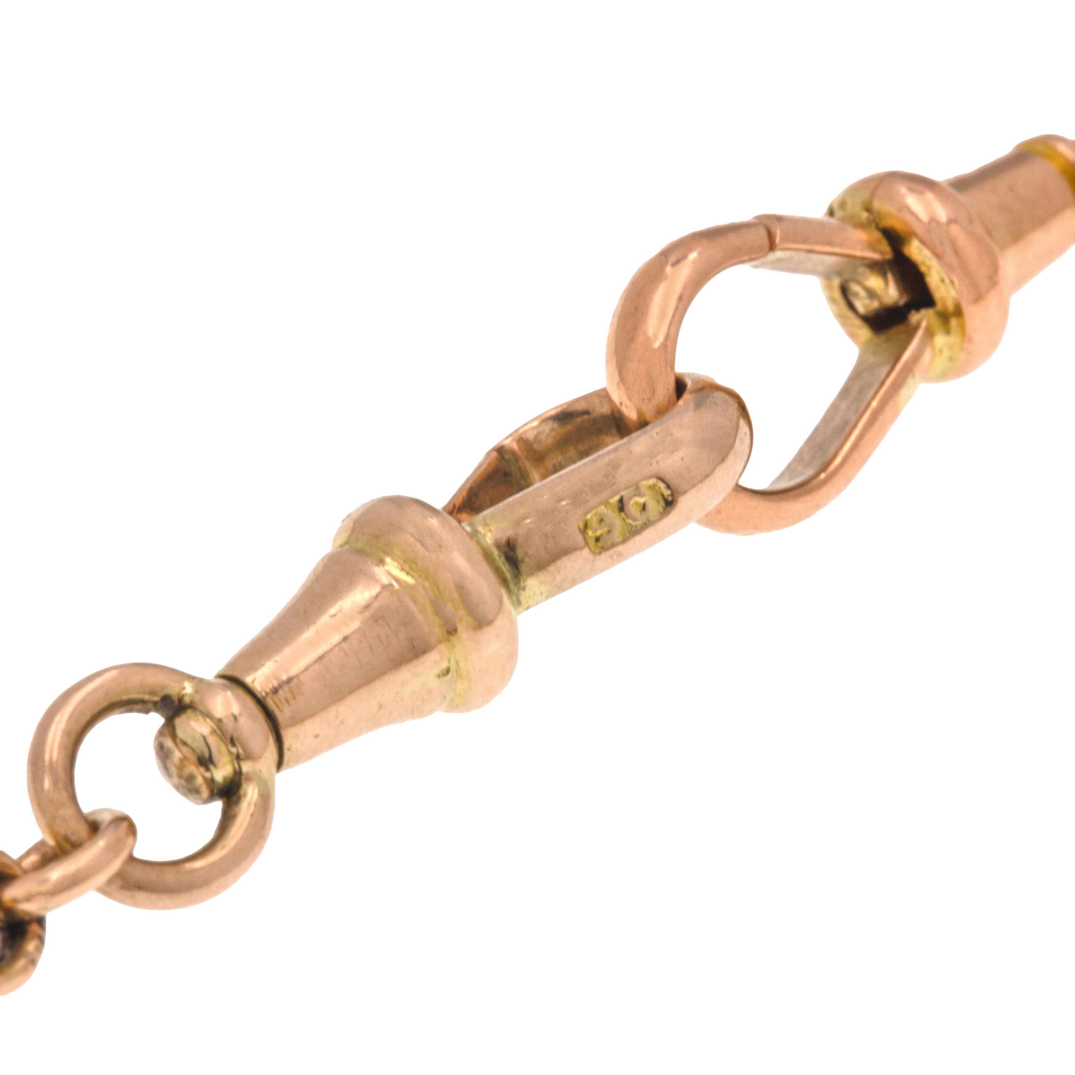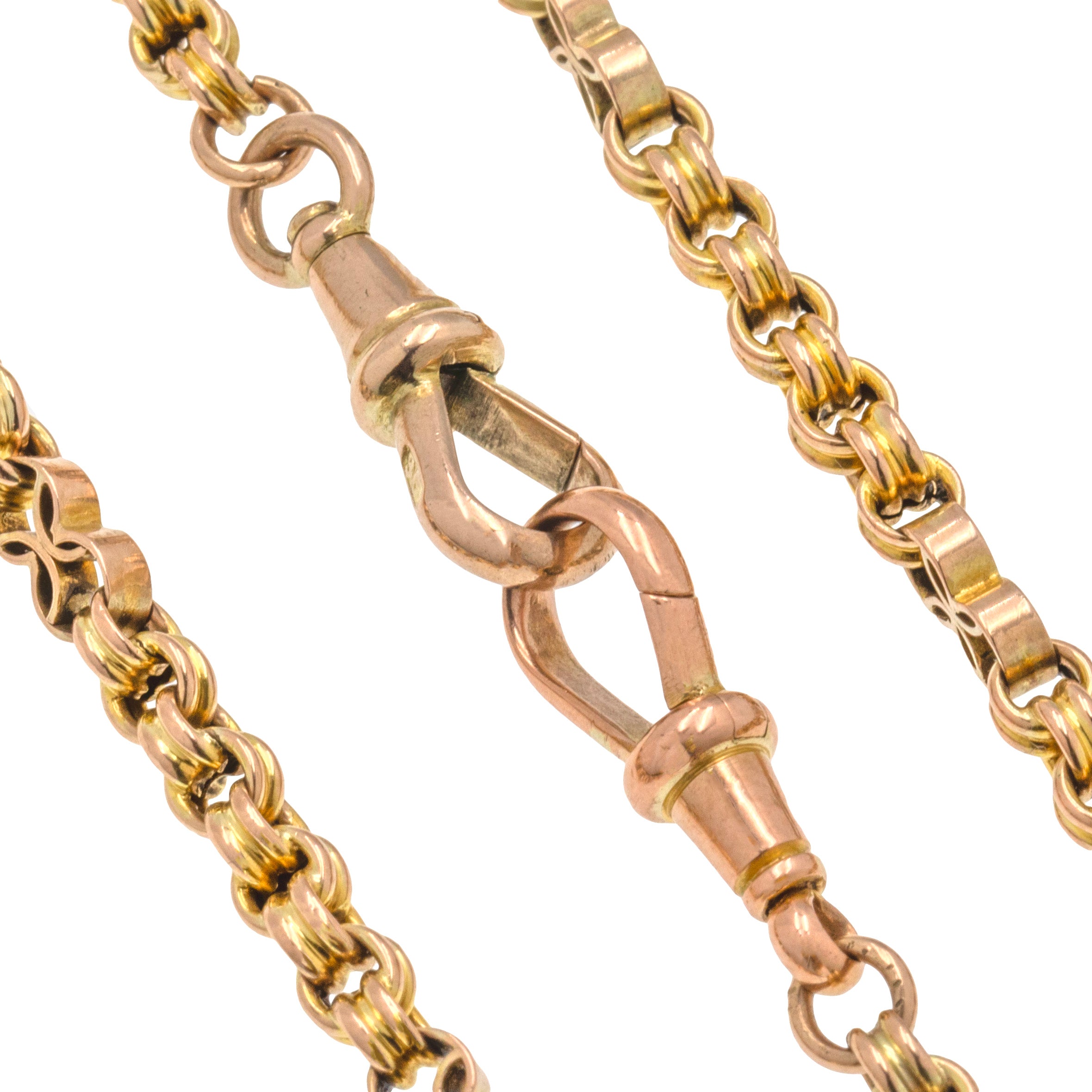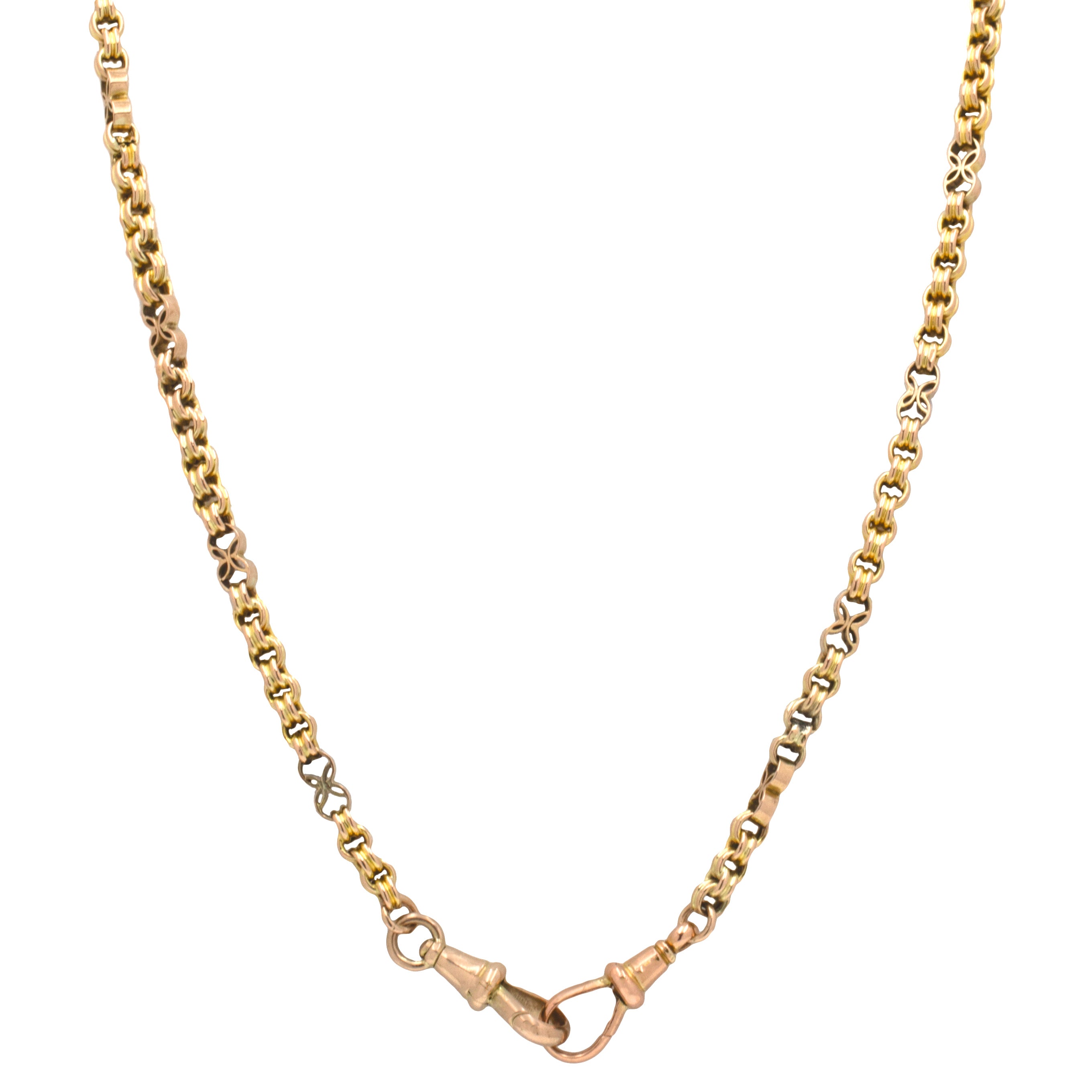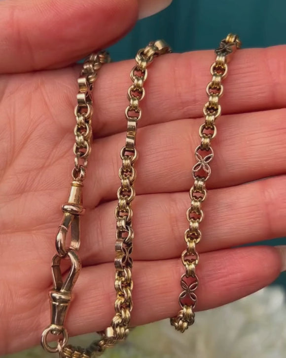 EXCELLENT. This antique 9ct Gold fancy link chain is in excellent condition throughout. All of the links are in wonderful shape, having retained their form well over the years; each is firmly attached to the next, and are free from dings, dents or scratches to note. Complete with two antique dog-clips, which are in fine working order, this Victorian Gold chain has a gorgeous charm which will endure for years to come!