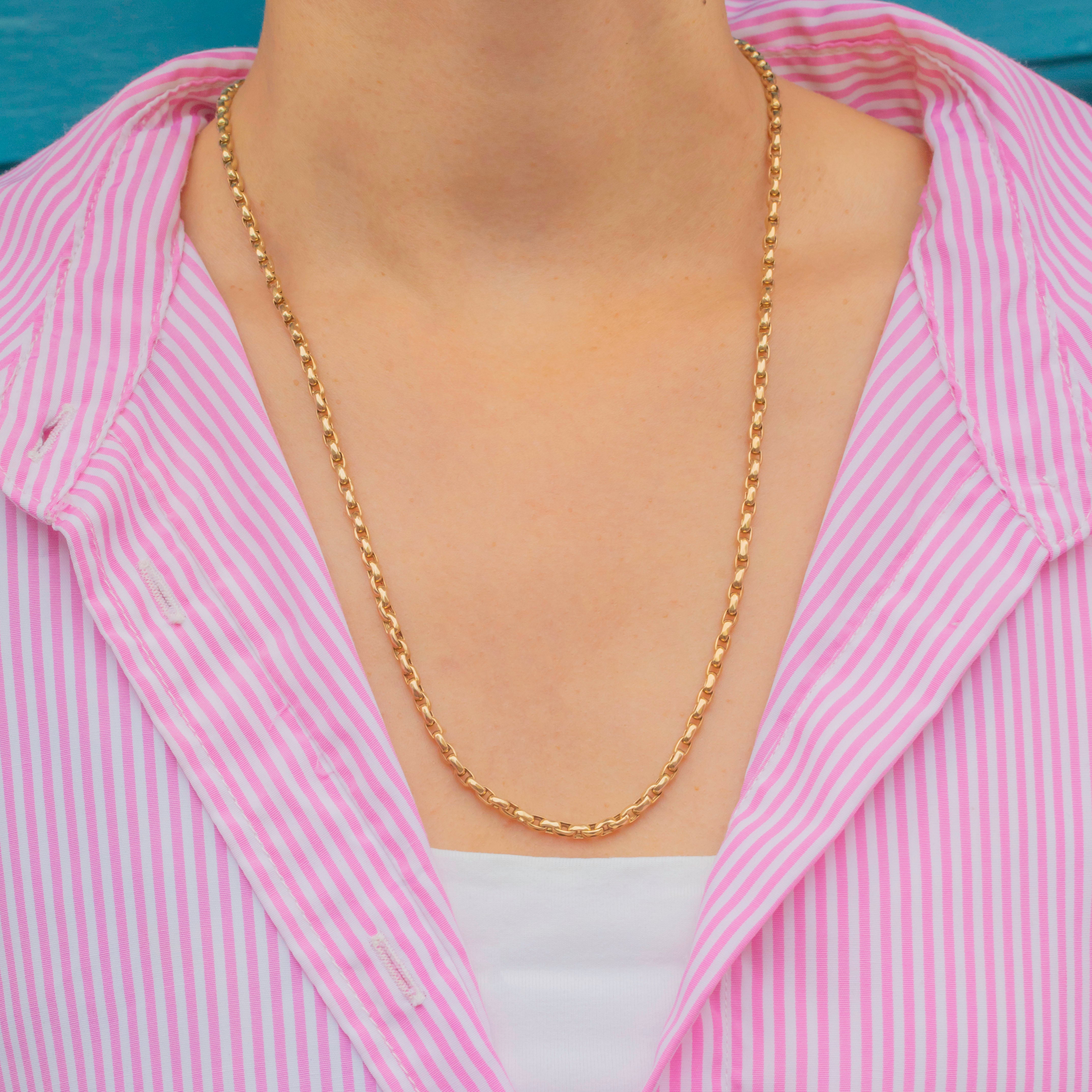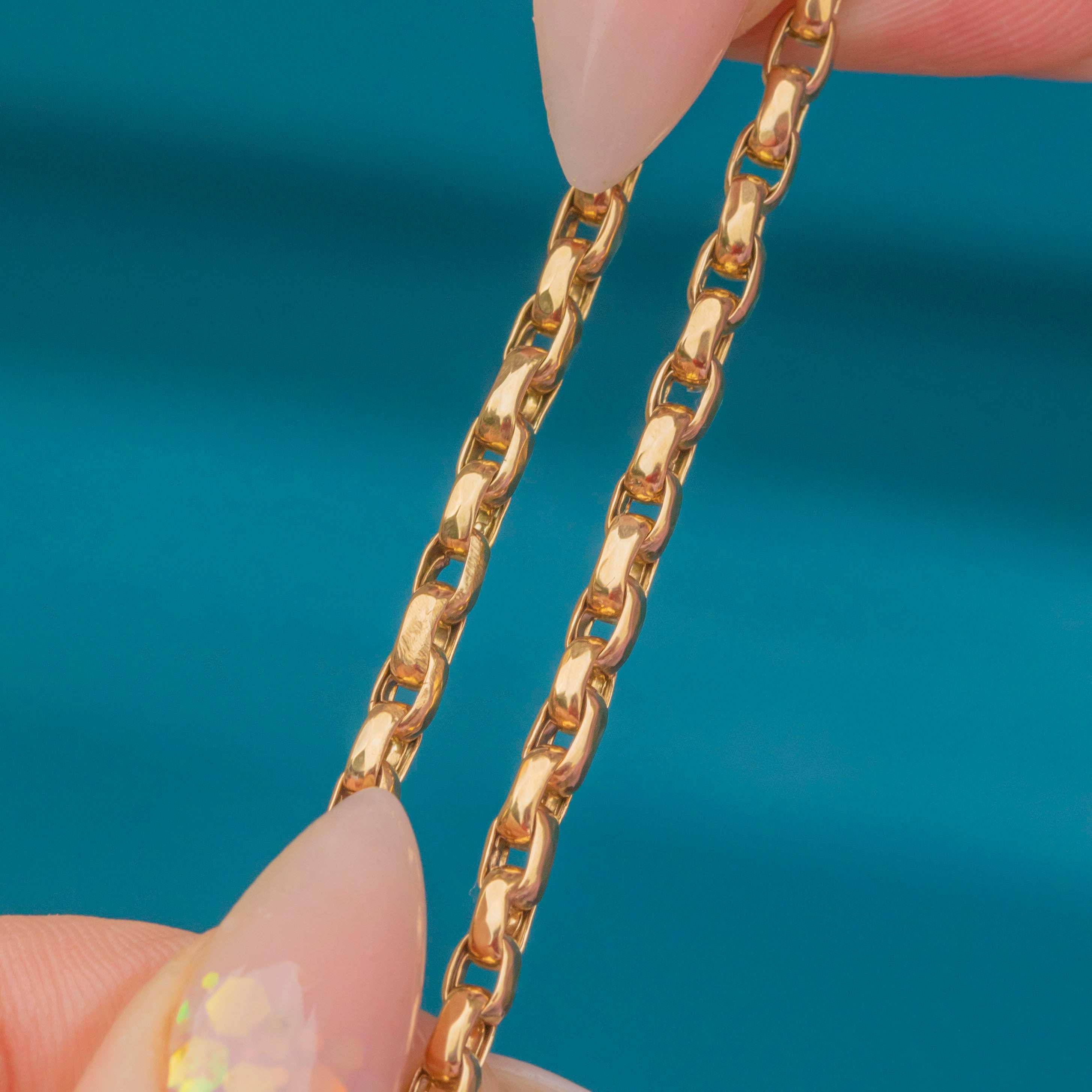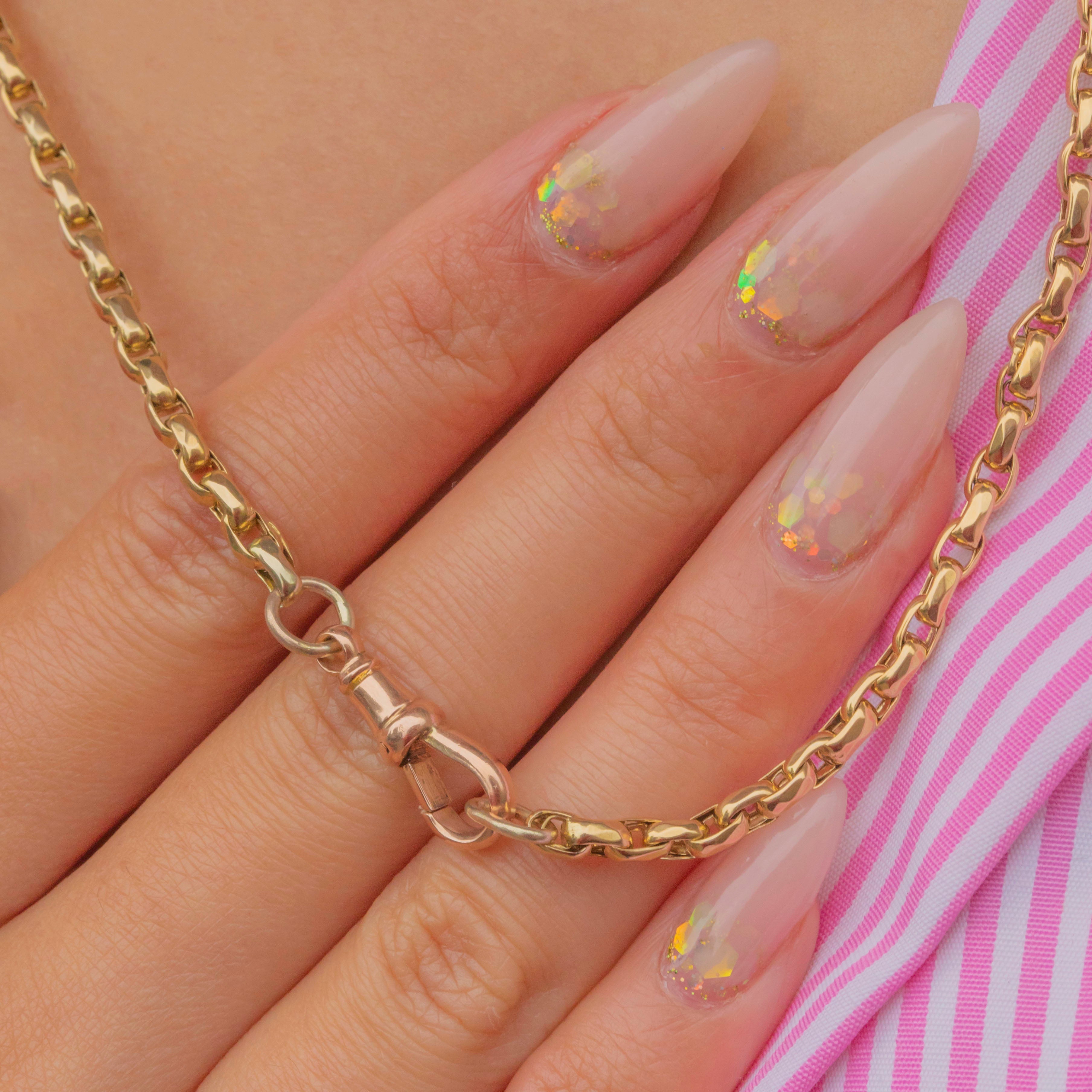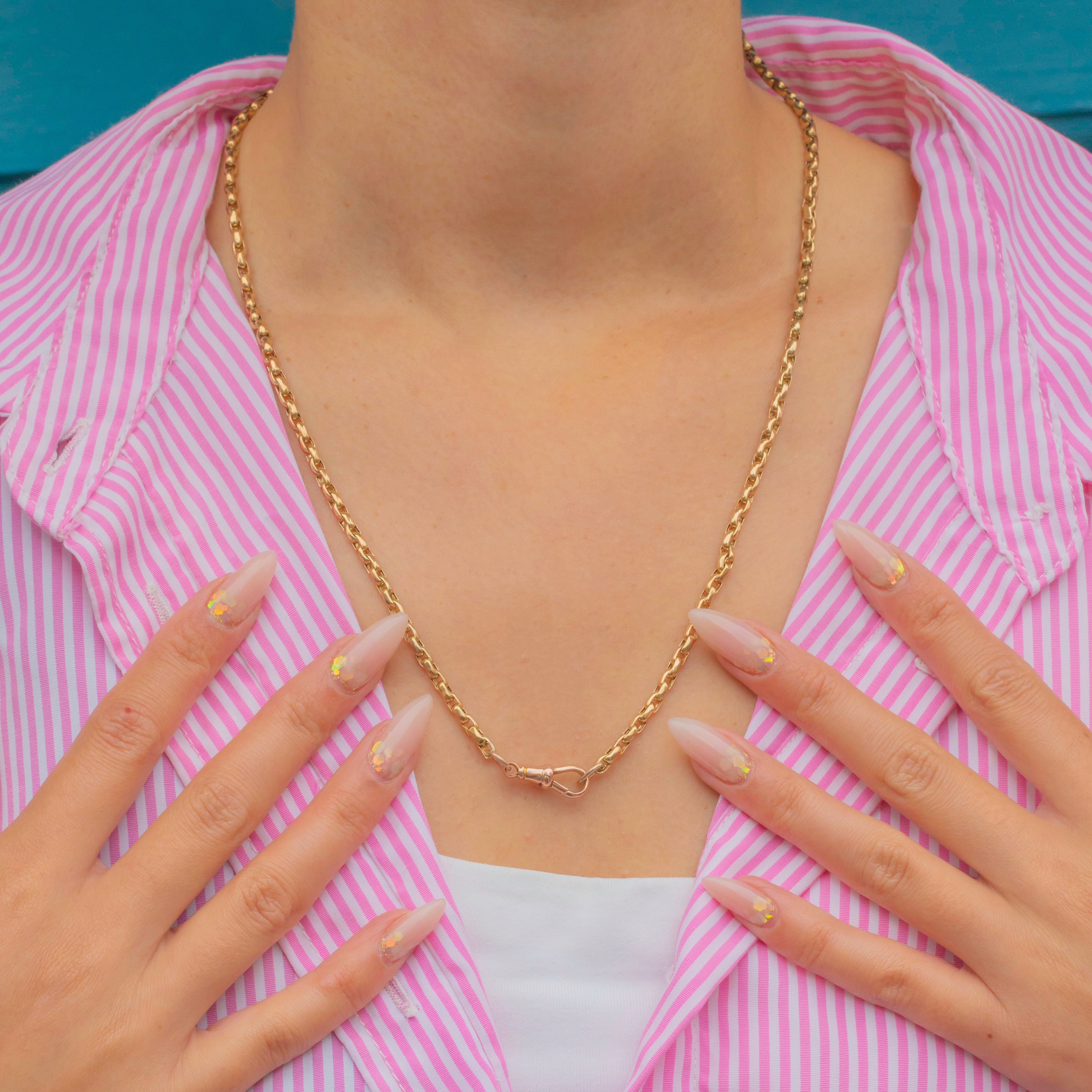 A classic Victorian faceted belcher chain in richly coloured 9ct Gold. The rounded links catch the light beautifully, giving this 22" length a bright, elegant presence that layers perfectly with pendants and charms.