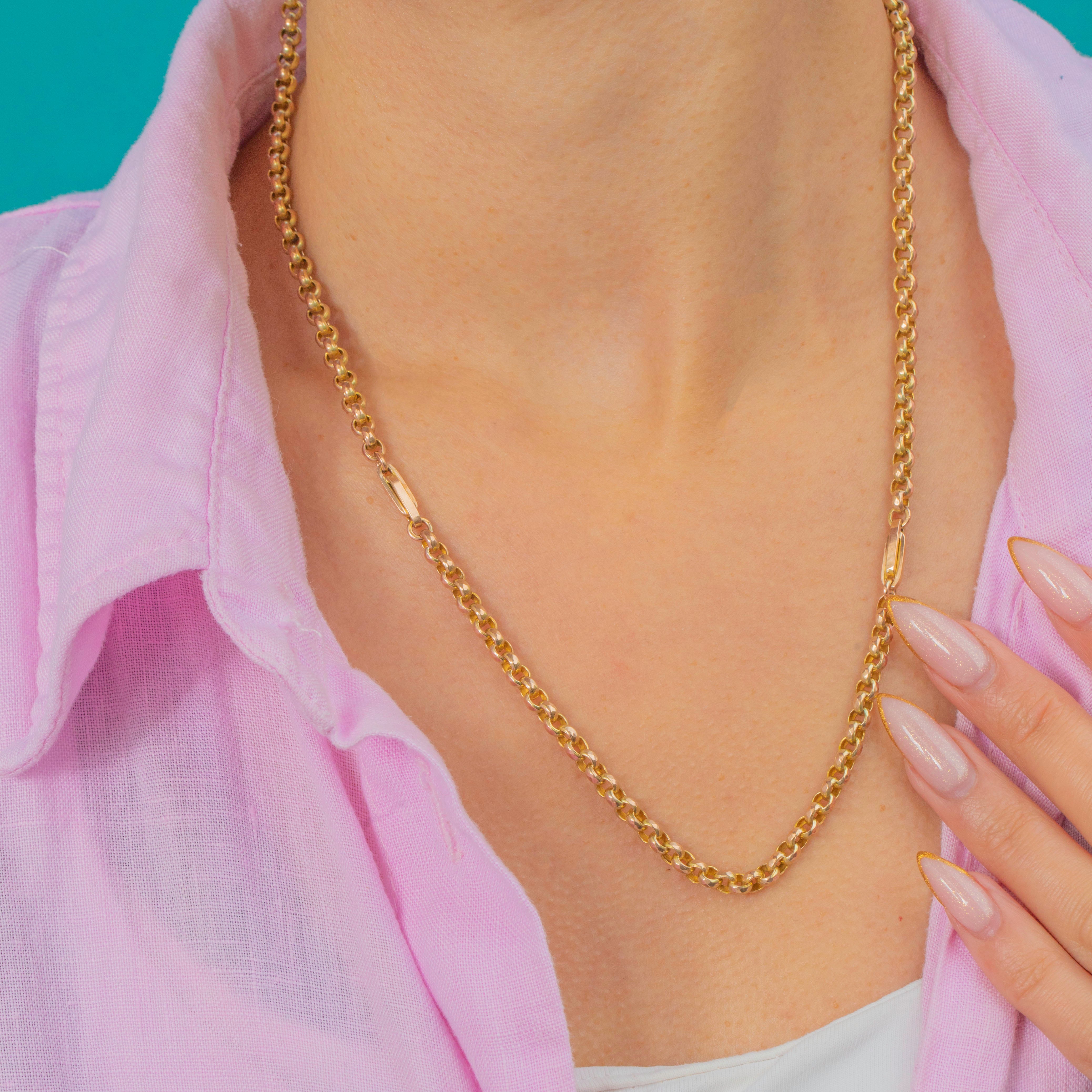 This Antique 9ct Gold belcher and fetter link chain is a timeless Victorian classic, featuring beautifully made alternating links that give it both texture and elegance. At a generous 23.5" length, it’s perfect for wearing alone, layering, or styling with your favourite pendants and lockets.