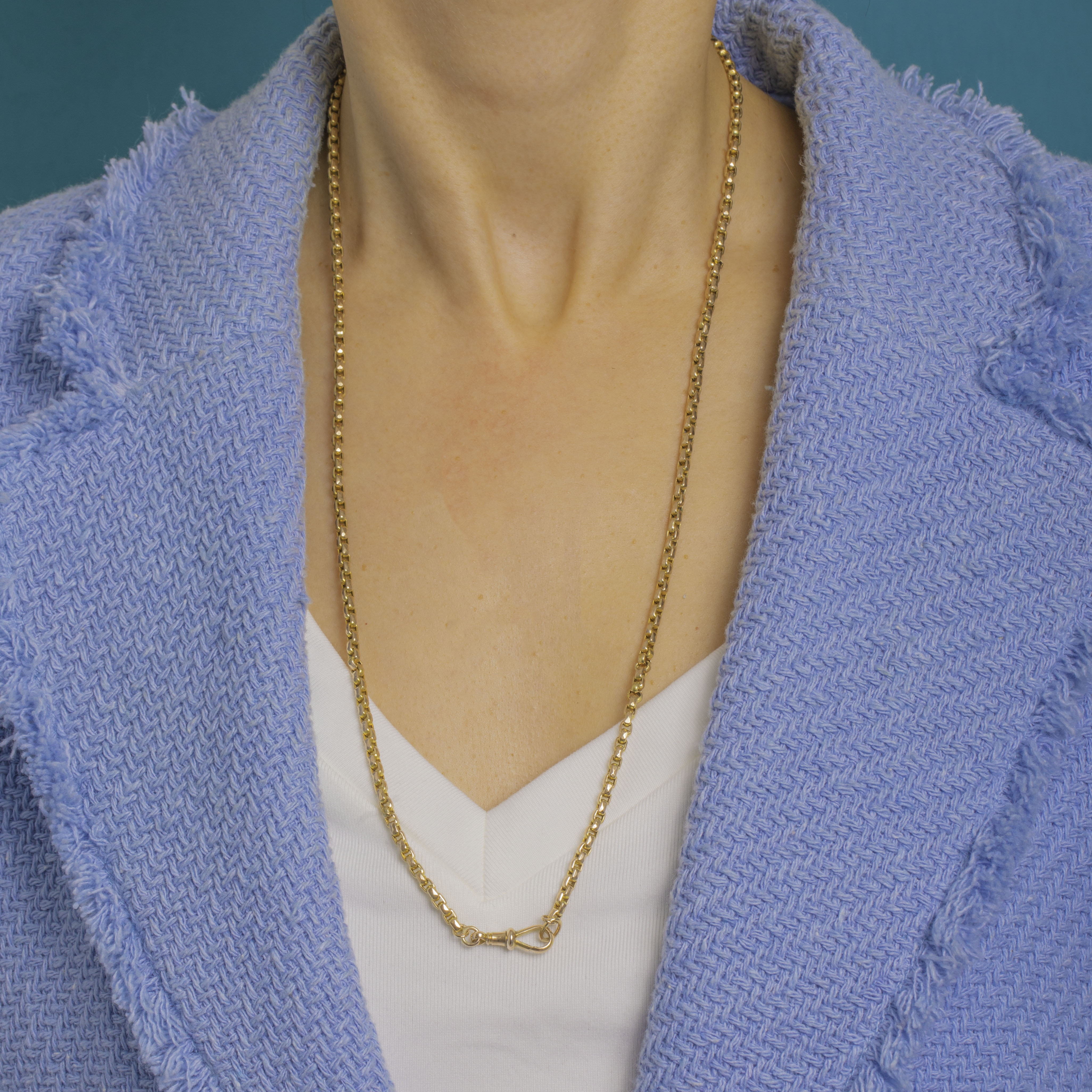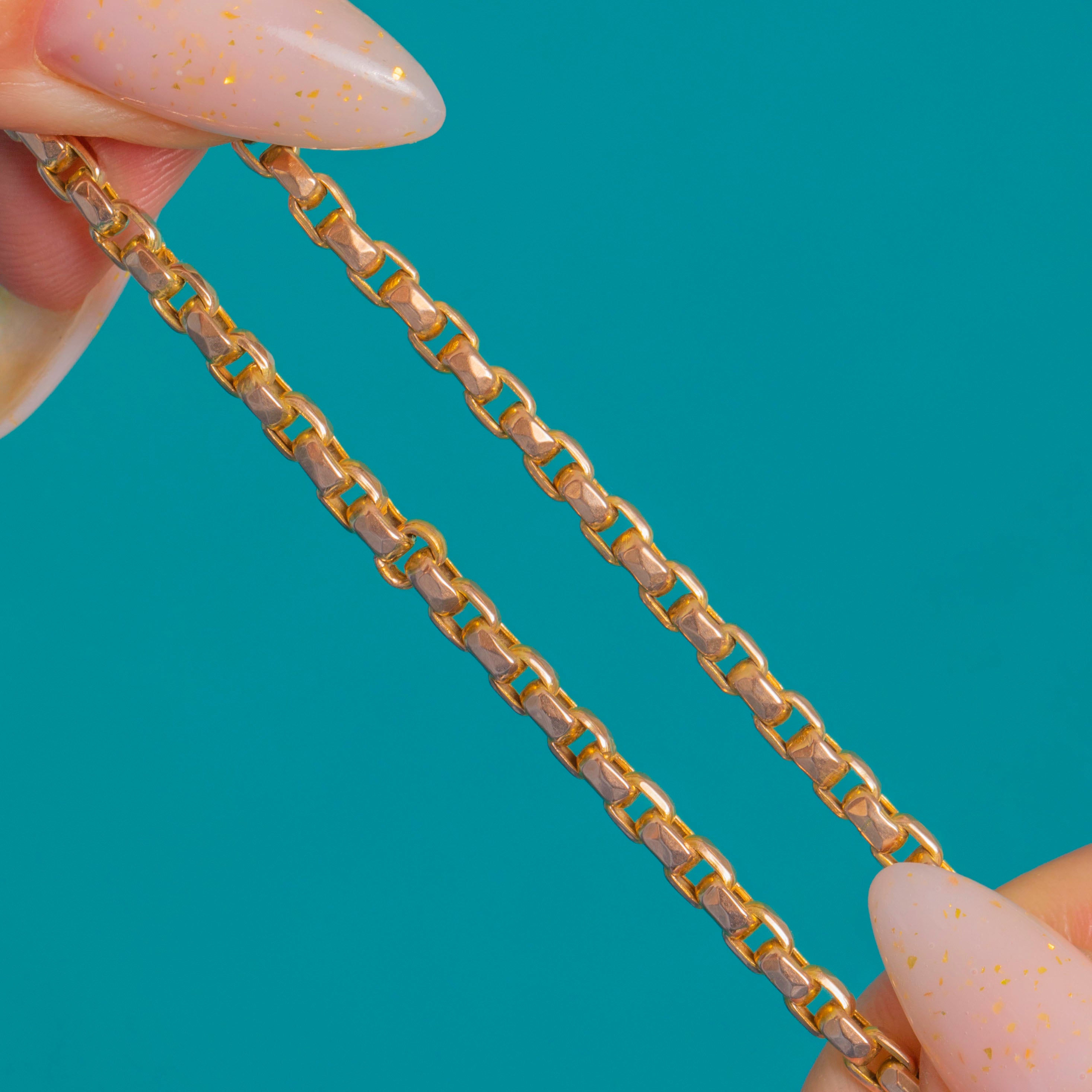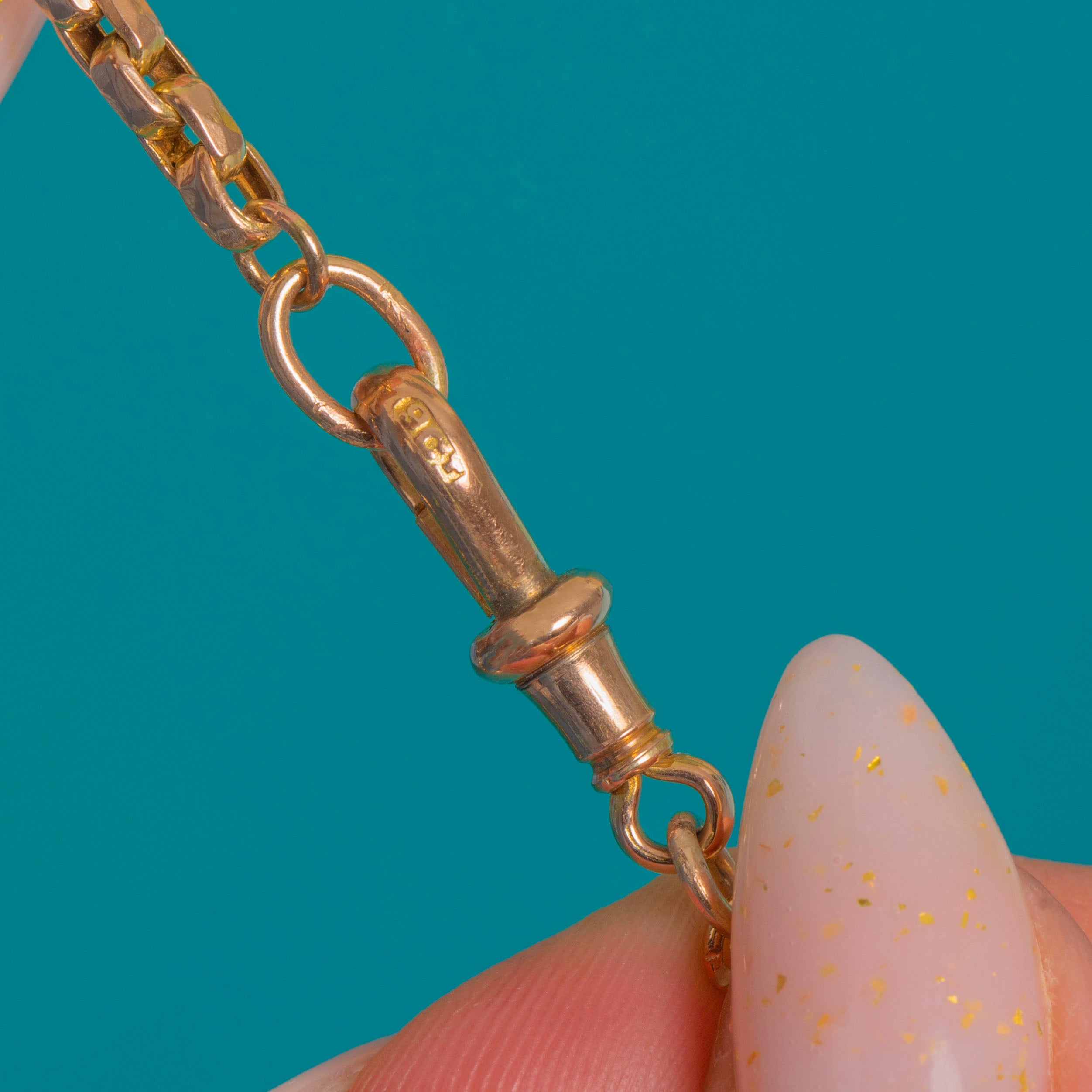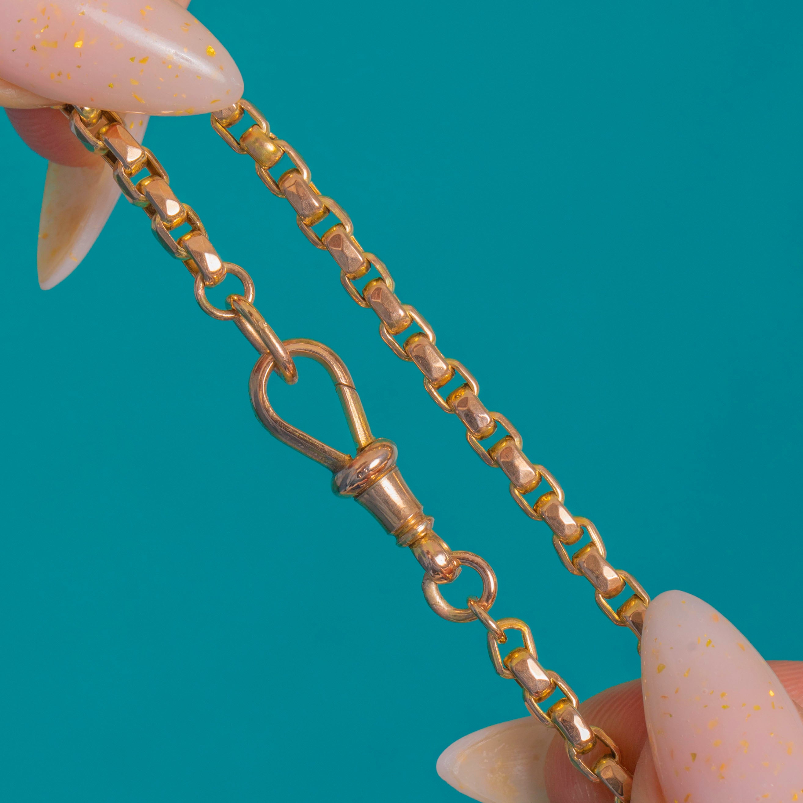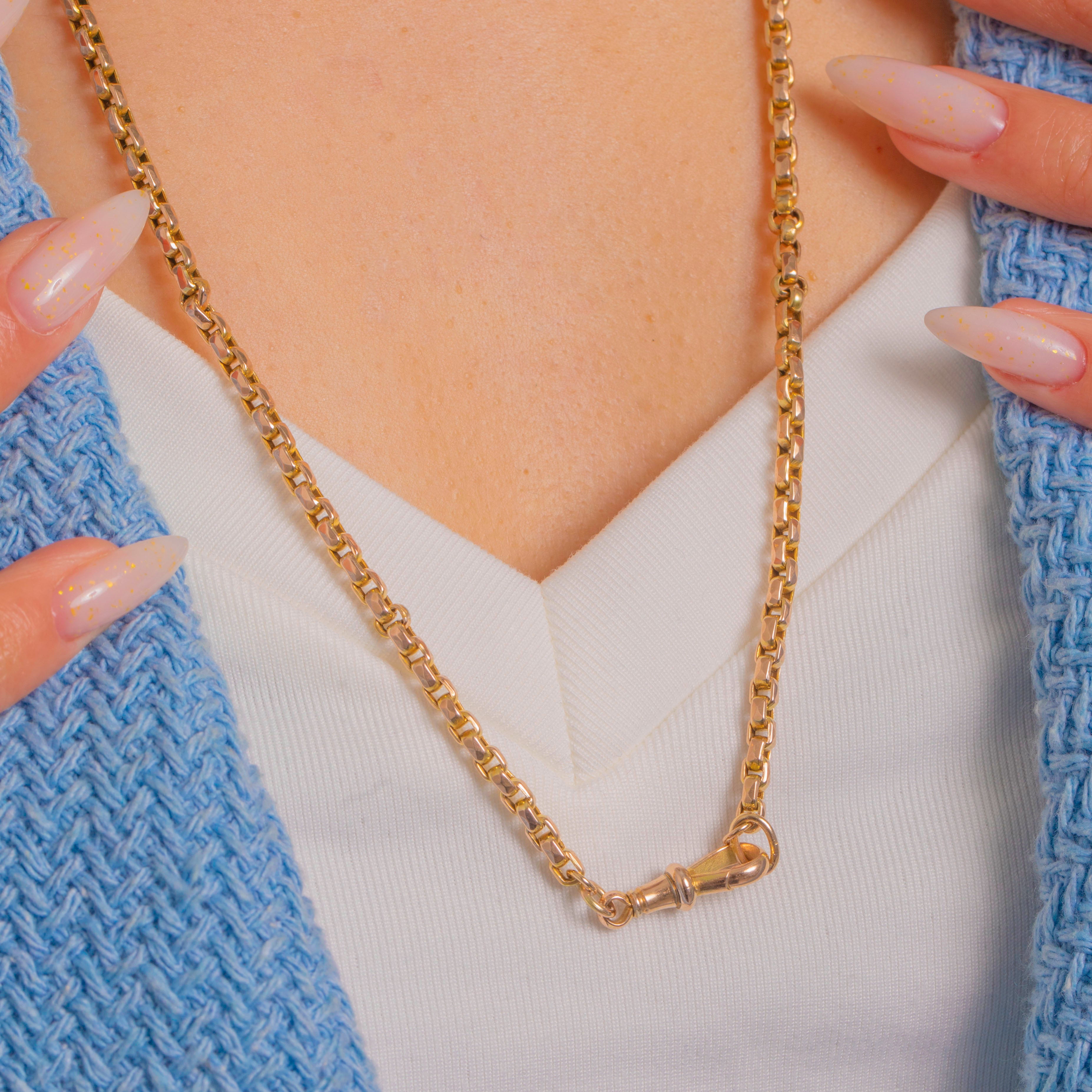 A quintessential Victorian 9ct Gold chain, this versatile necklace is crafted with uniform, faceted geometric links that gleam with a warm yellow hue and subtle rosy undertones. It’s finished with a classic dog-clip clasp with a turned collar, stamped “9CT”, channelling the clean, utilitarian elegance of an Albert chain.