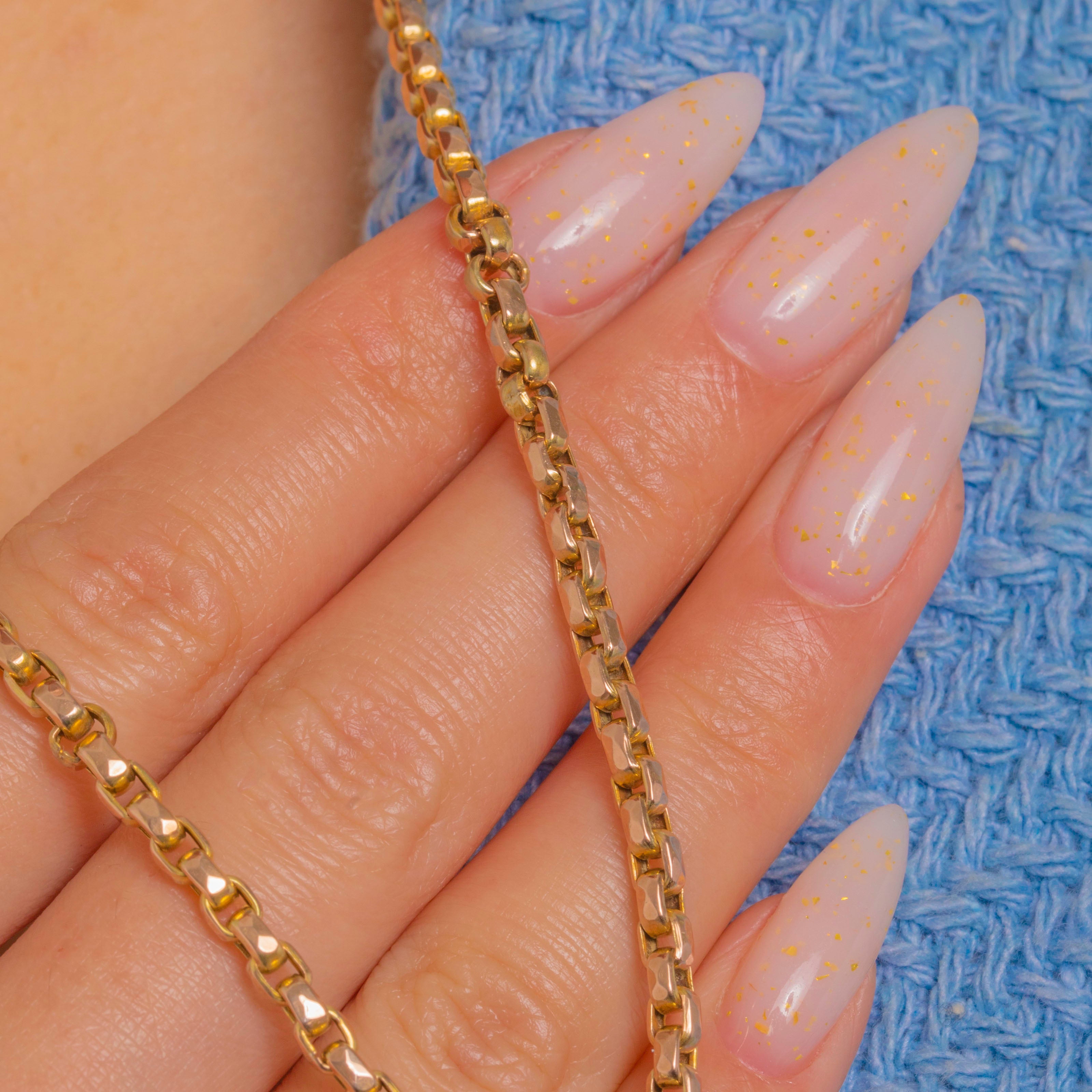 VERY GOOD: Bright polish with light surface wear to the links, consistent with age; the faceting remains crisp and well-defined. The dog-clip spring closes securely, with a subtle colour difference between the clip and chain as seen. No kinks or distortions; an attractive antique chain that has been well cared for.