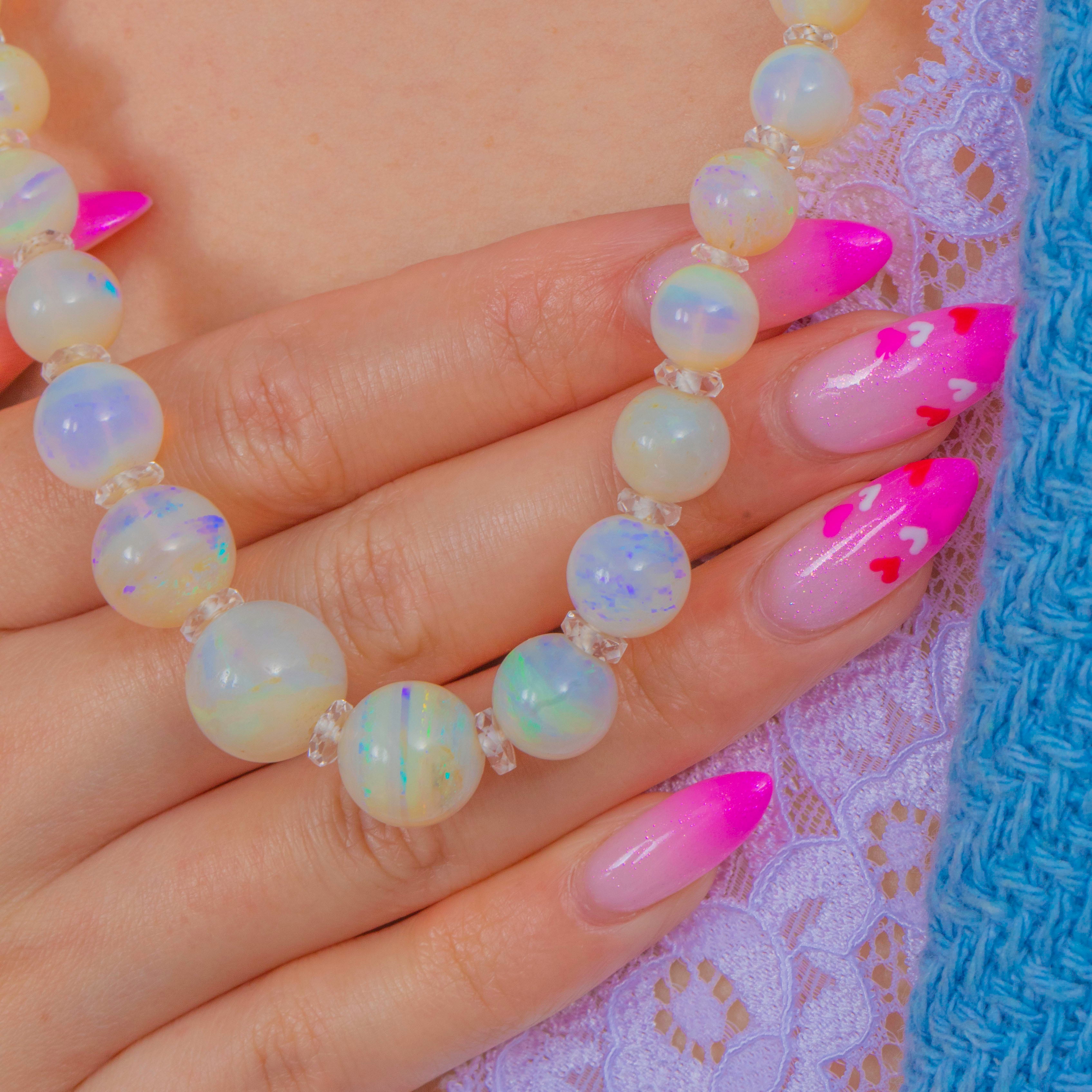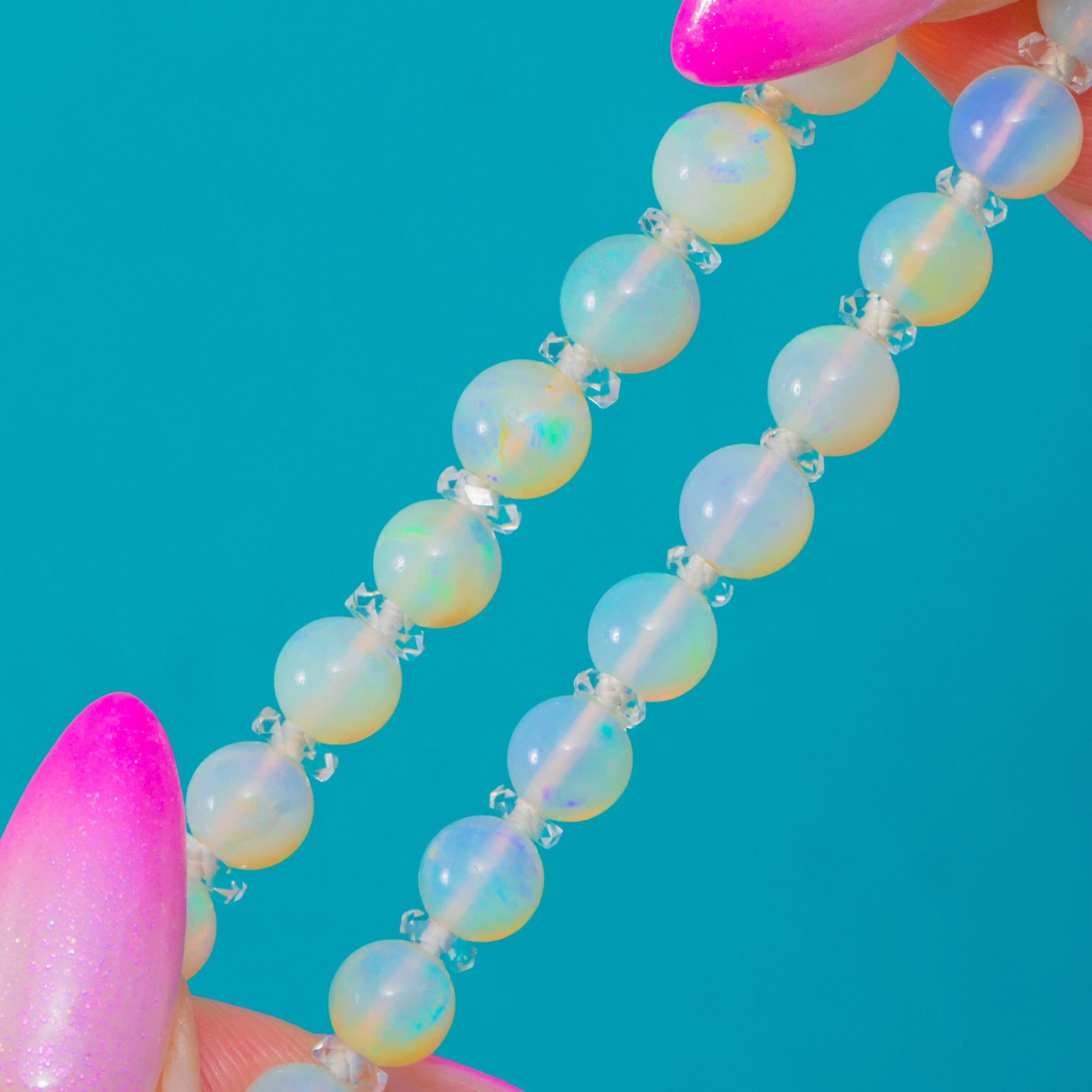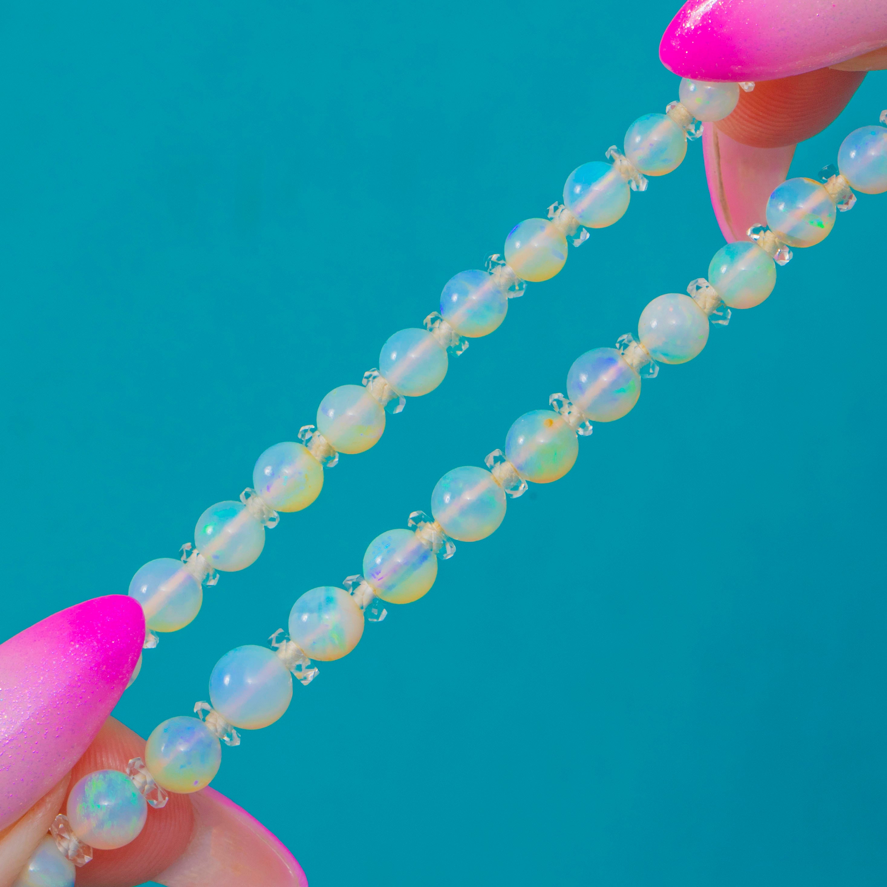 A luminous strand of Art Deco elegance, this graduated Opal necklace shimmers with ethereal play-of-colour, from soft blues and greens to delicate pinks and golds. Each spherical Opal is separated by sparkling Rock Crystal rondelles, lending rhythm, clarity and a touch of brilliance to the opaline glow.
