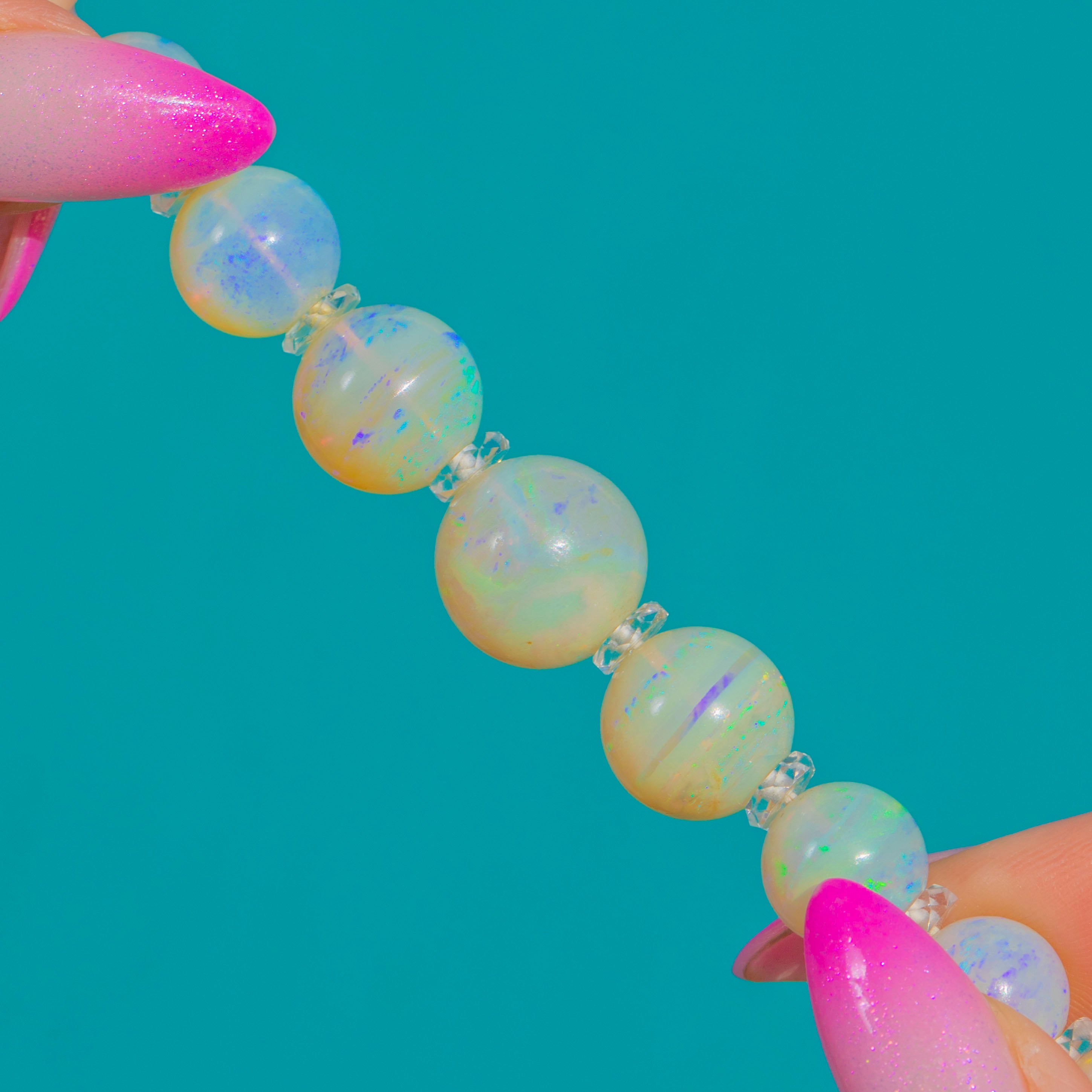 EXCELLENT: The Opals are bright with smooth, well-polished surfaces and no visible chips or cracks. Rock Crystal spacers are crisp and sparkling with minimal signs of facet wear. The strand presents beautifully with even spacing and no visible repairs.